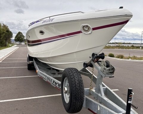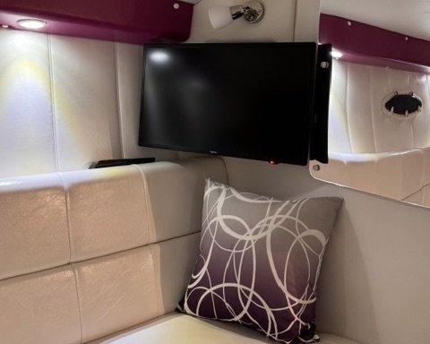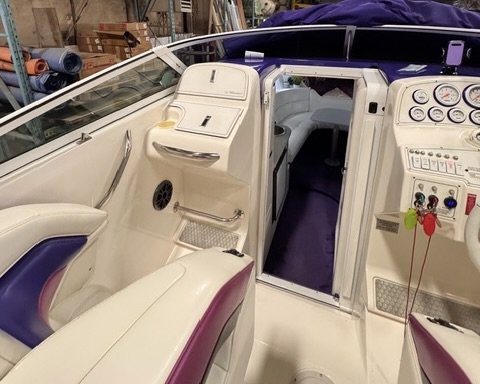 The twin step bottom Powerquest 380 Avenger is an offshore machine. It's designed for speed, control, and an excellent ride. The twin step bottom gives the Avenger a speed advantage of 5 to 6 mph over a comparable V-bottom boat with the same power. Gaffrig controls and mechanical drive - tab indicators are standard. Avenger's cabin has 5-feet, 7-inches of headroom. When it's time to turn in for the night, the 6-foot, 10-inch V-berth is cleverly canted to let you sleep in a comfortable 'heads-up' position. The well-appointed galley features a standard AC-DC refrigerator, fresh water sink, plenty of storage including a spacious hanging clothes locker, and a unique in-gel 'granite' countertop.