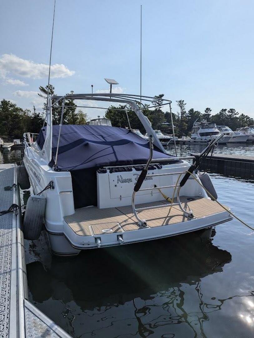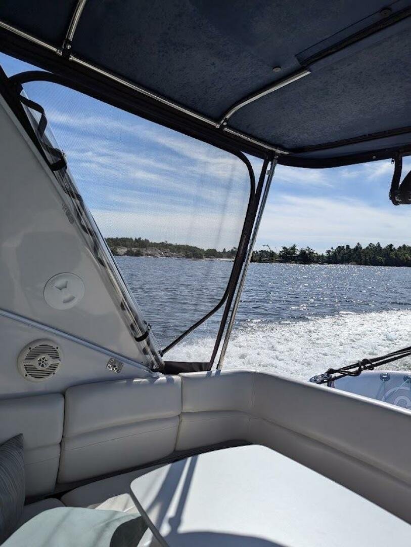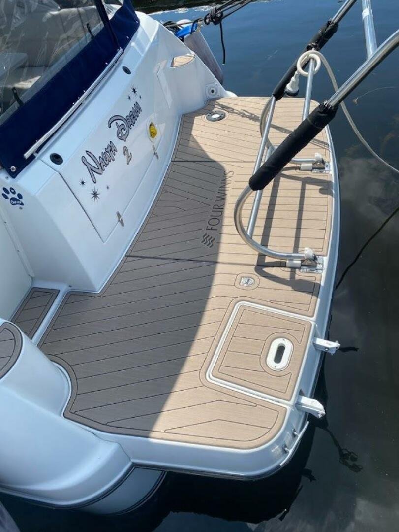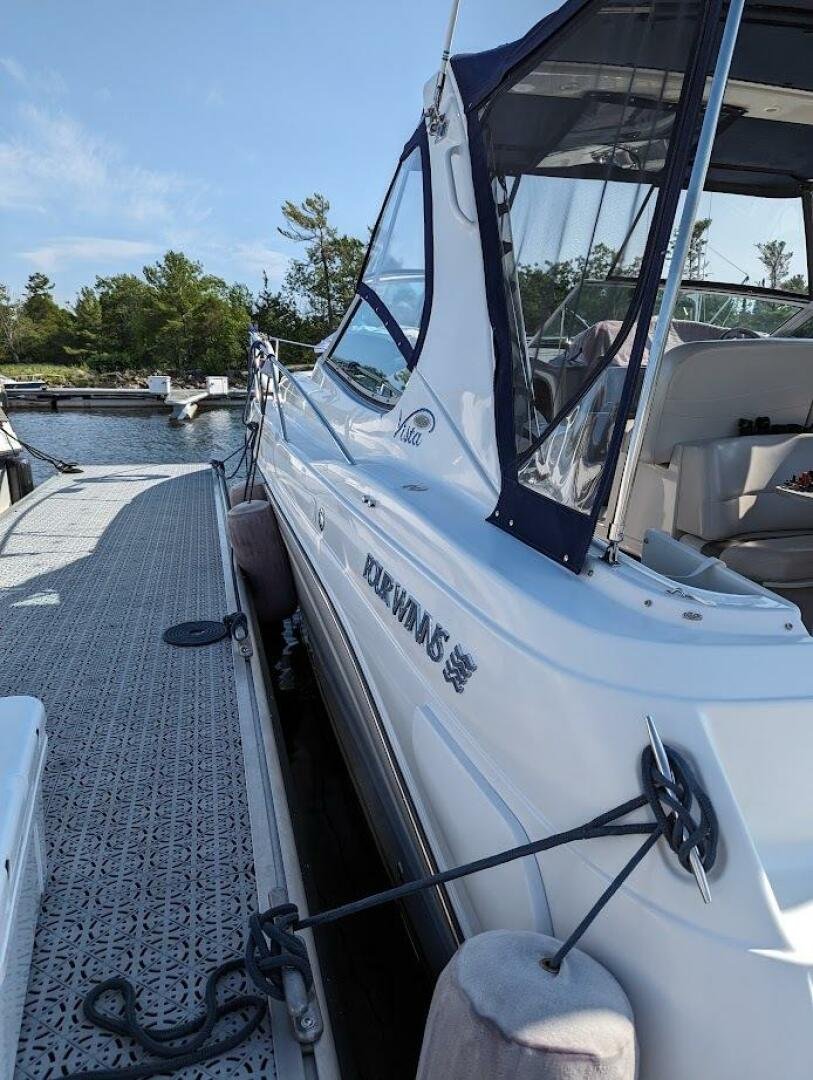 This popular Four Winns 328 Vista model has spent its life in freshwater and has been with the current owner since 2012 and is currently stored indoors. The vessel shows well, with newer canvas, a new sea deck on the platform, and six new 6V batteries two seasons ago. Both engines were rebuilt with 150 hours on the port, and 70 hours on the starboard. The 320W solar system was added, paired with a 2000W inverter. The boat also comes wired for a starlink unit.