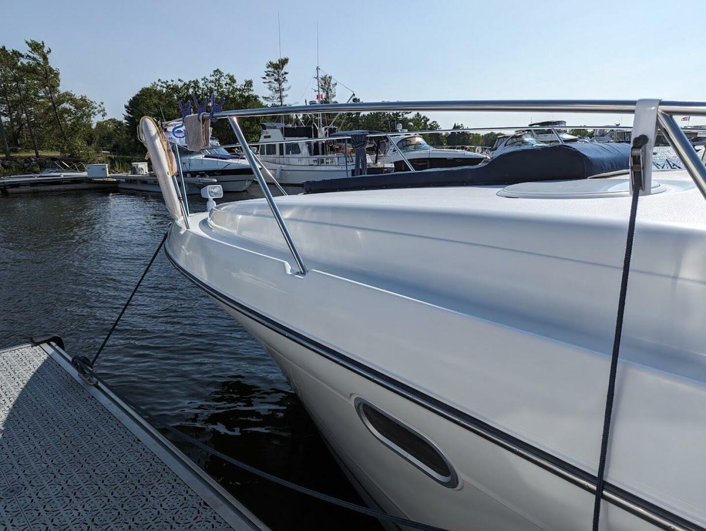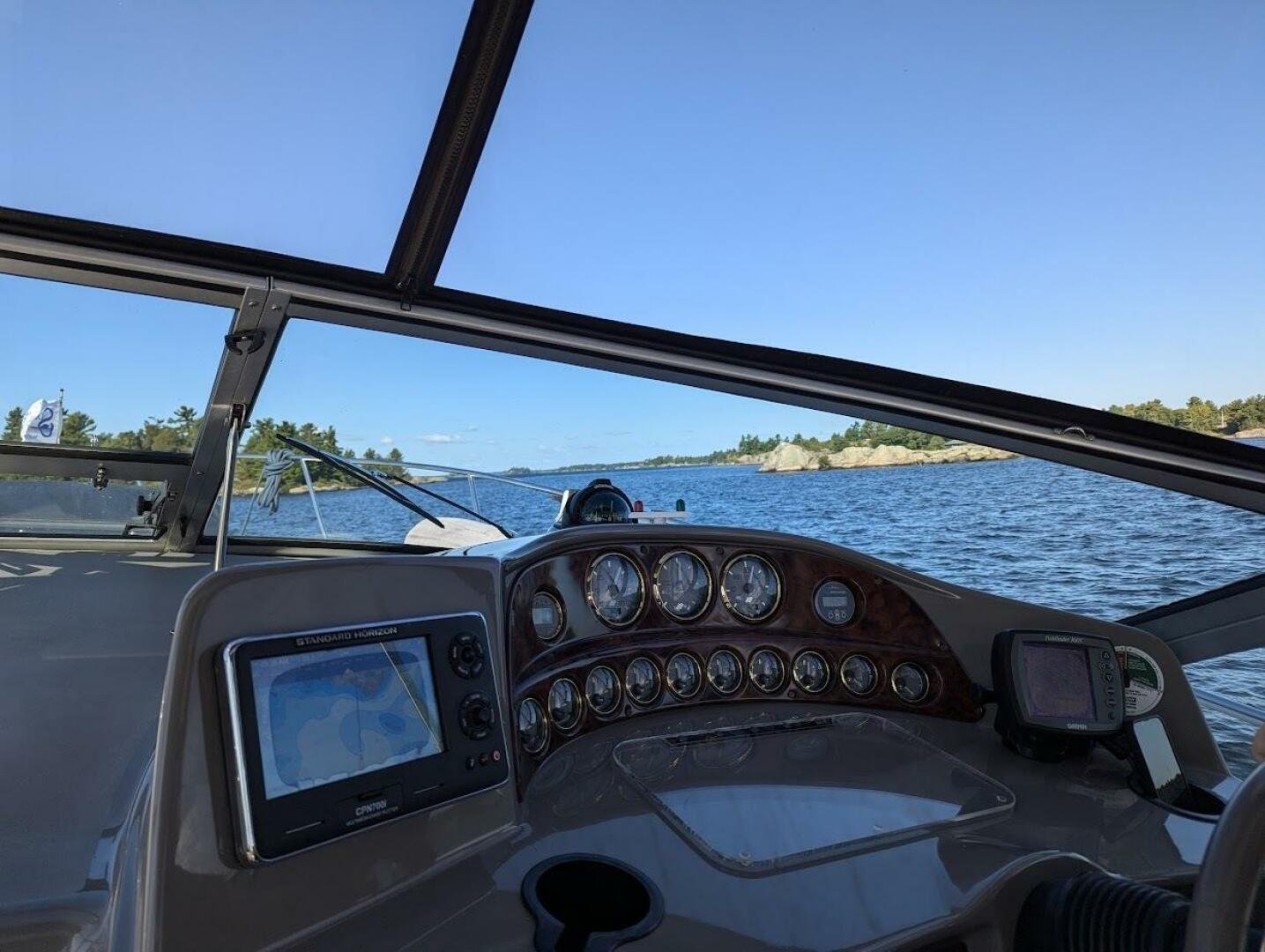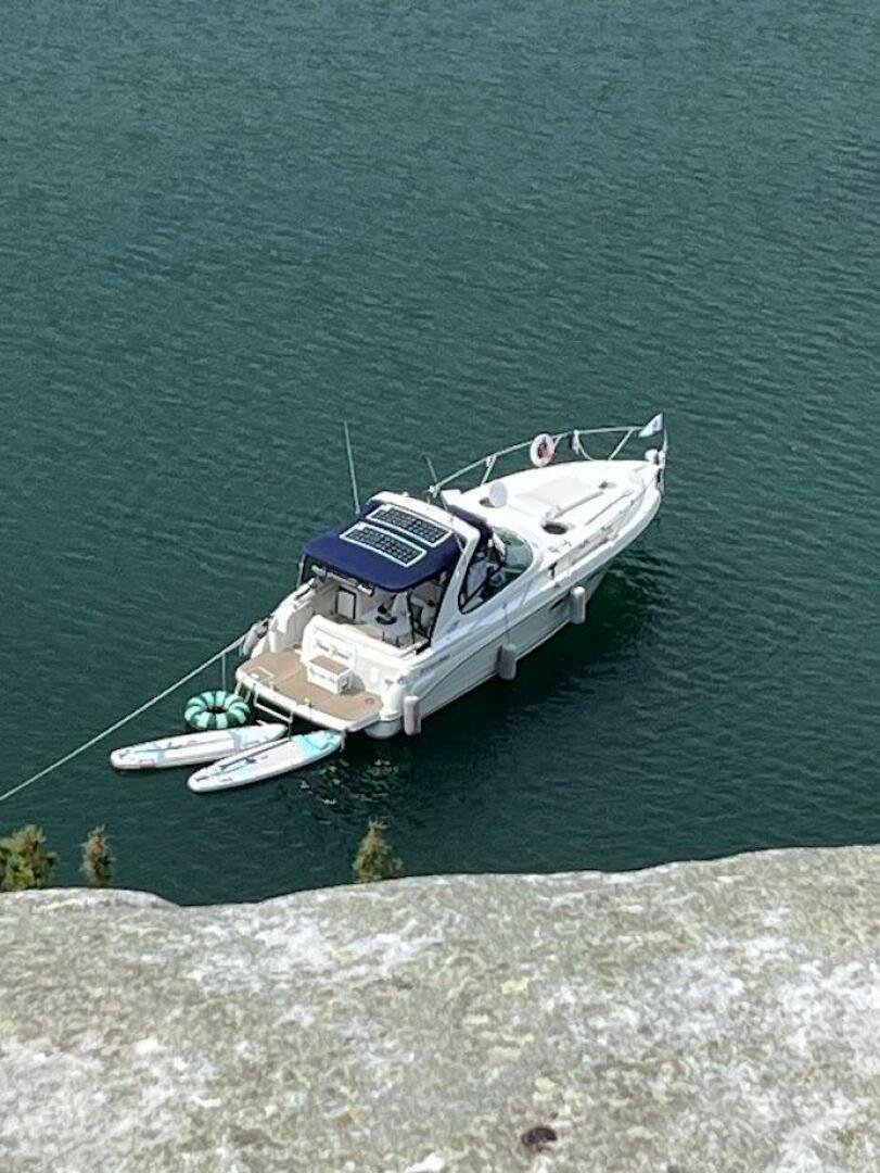 This popular Four Winns 328 Vista model has spent its life in freshwater and has been with the current owner since 2012 and is currently stored indoors. The vessel shows well, with newer canvas, a new sea deck on the platform, and six new 6V batteries two seasons ago. Both engines were rebuilt with 150 hours on the port, and 70 hours on the starboard. The 320W solar system was added, paired with a 2000W inverter. The boat also comes wired for a starlink unit.