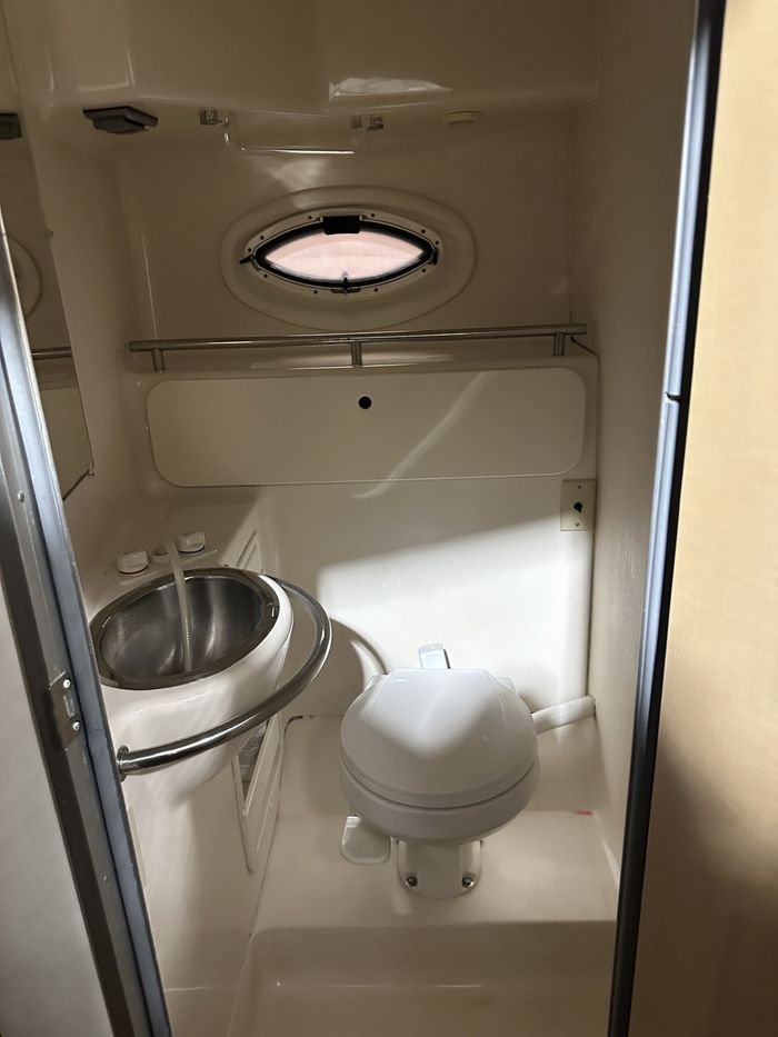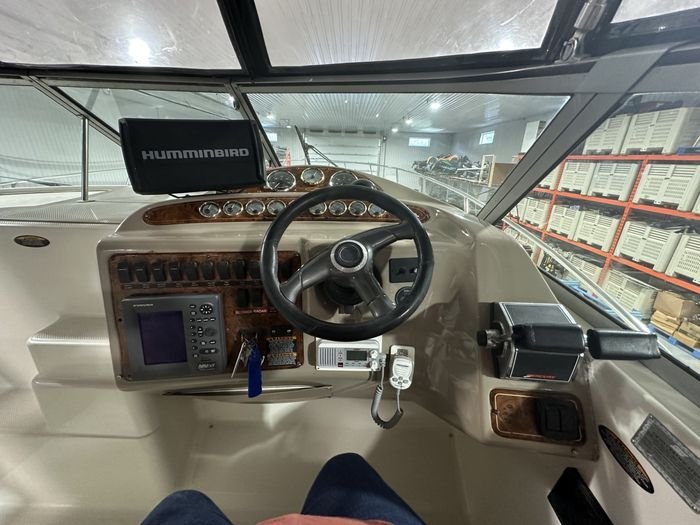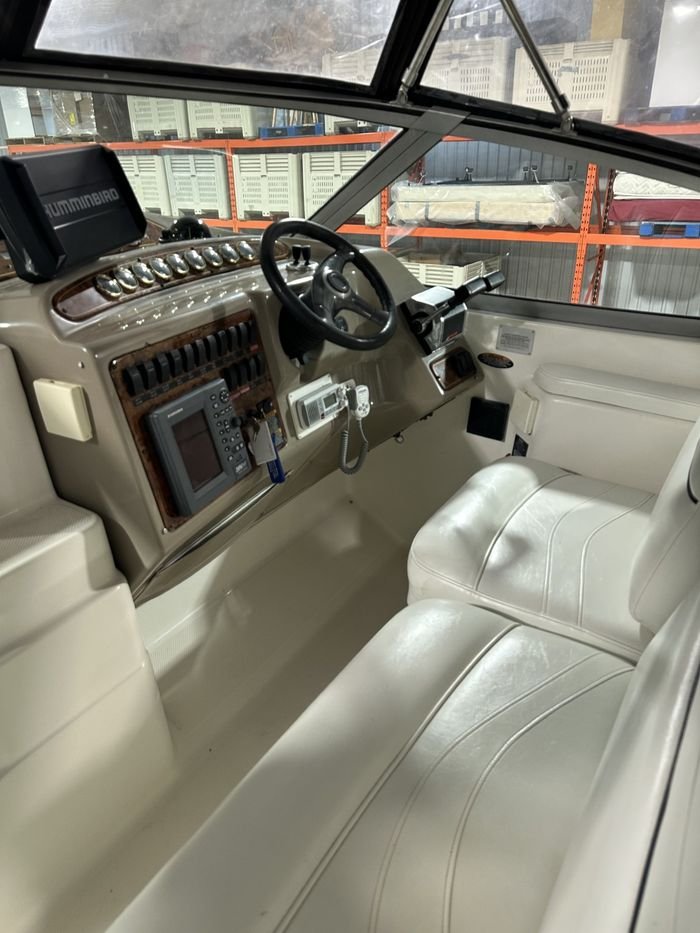 Below deck, the cabin is bright and inviting, with a well-thought-out layout that comfortably sleeps up to six people. The forward V-berth, convertible dinette, and mid-cabin provide flexibility for family and guests. The galley is equipped for overnight stays, and the enclosed head with a shower adds comfort for longer stays aboard. Powered by twin Mercruiser 5.7L engines with sterndrives, the Maxum 3300 SCR ensures confident handling and reliable cruising performance.