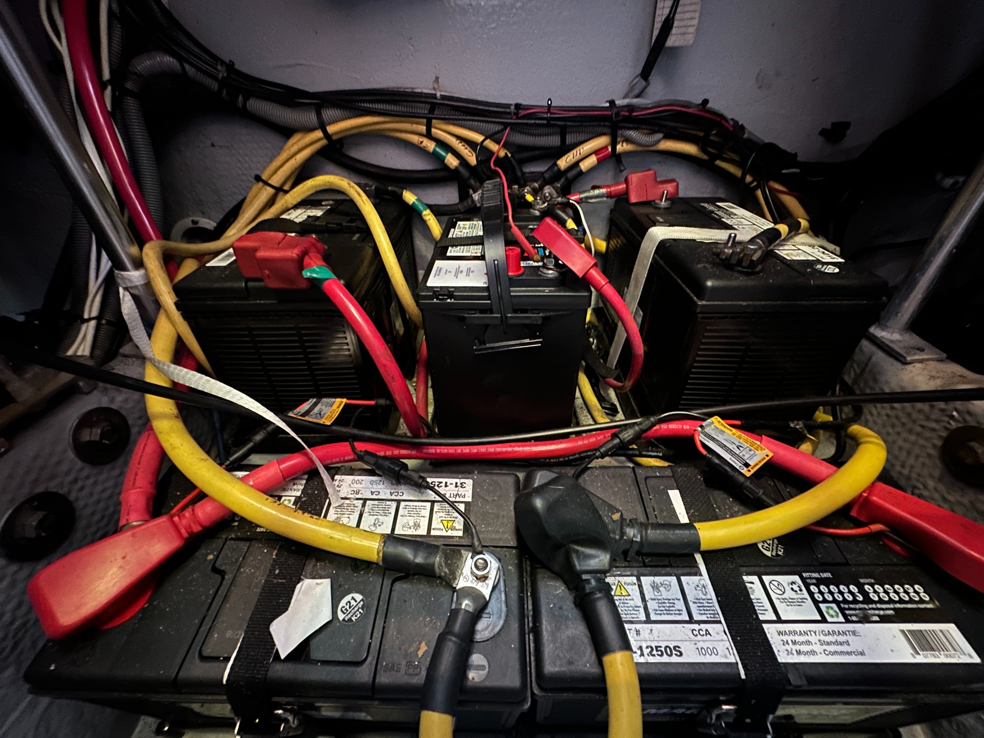 Down the companionway the secondary suite features twin singles that convert to a full-size bed, a center-line v-berth with an island bed, and an en-suite head + separate shower with access for day use.