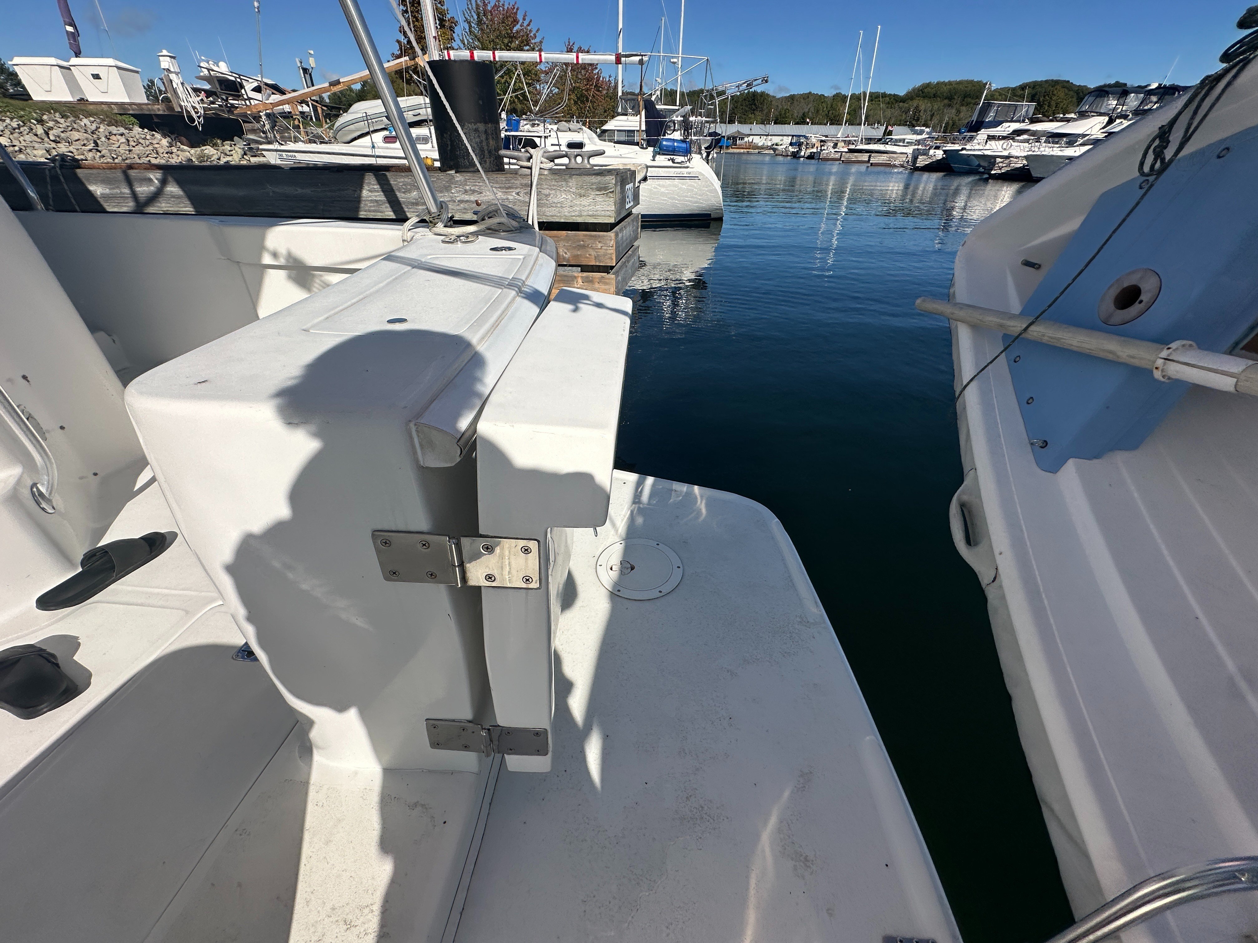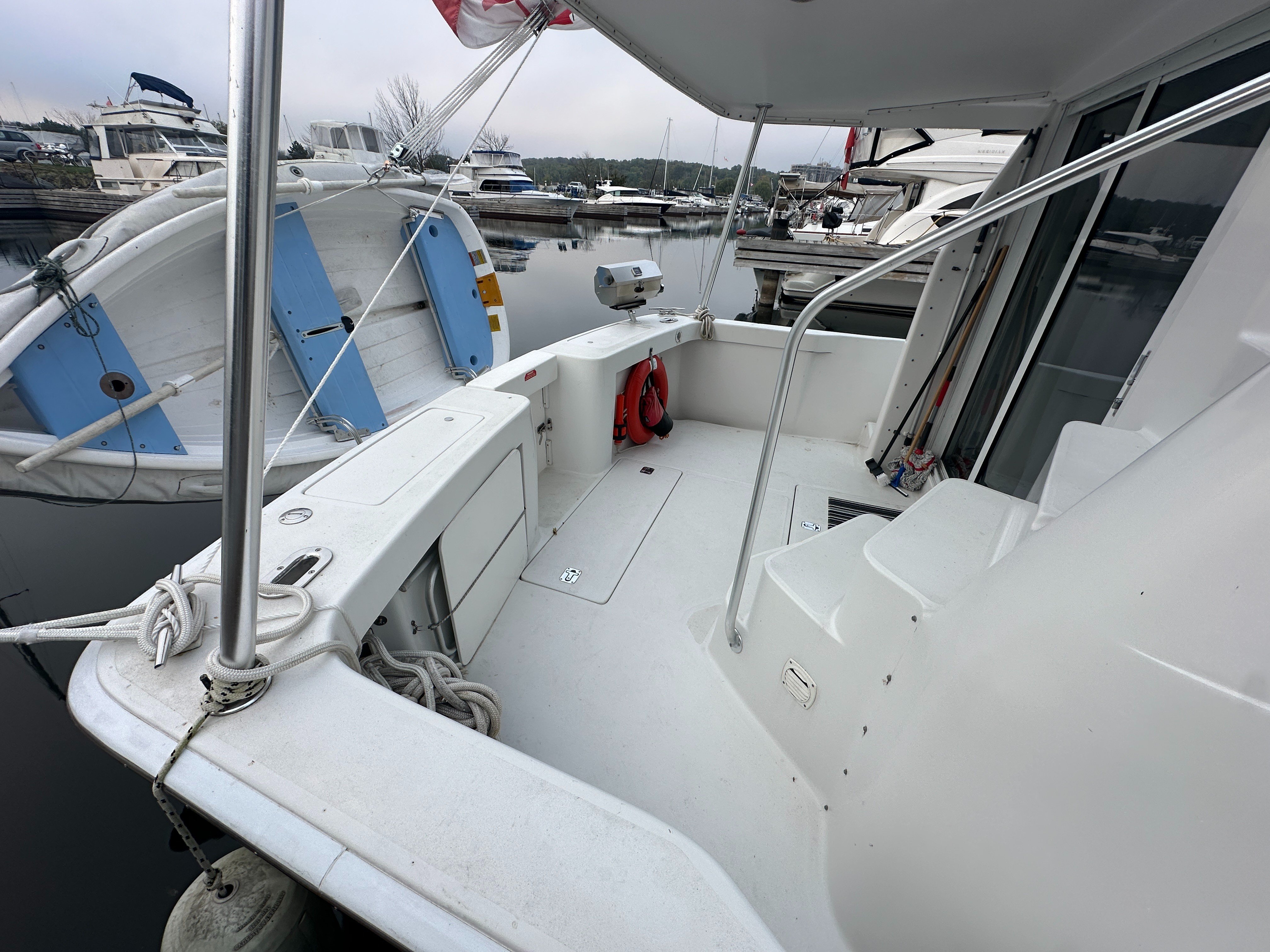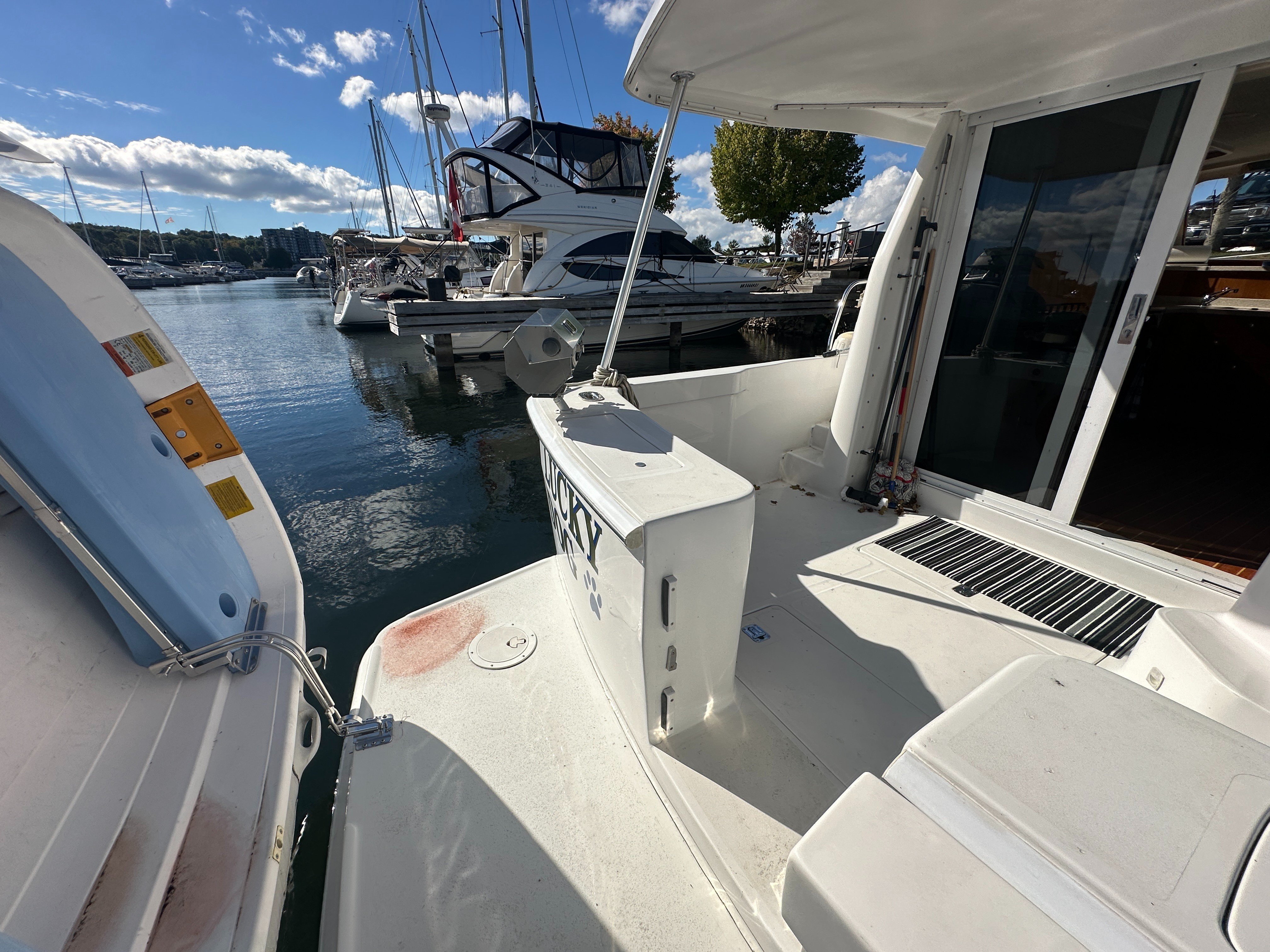 Stepping on board, you have an expansive swim platform with a center-line transom walkthrough to a large cockpit. You will find storage and access to the 8.0kw Kohler generator. Both sides of the pilothouse feature large walkarounds to provide easy of access to all areas of the vessel. From the cockpit, there is a set of molded steps starboard for the bridge. The bridge features storage, the primary helm, and ample seating.