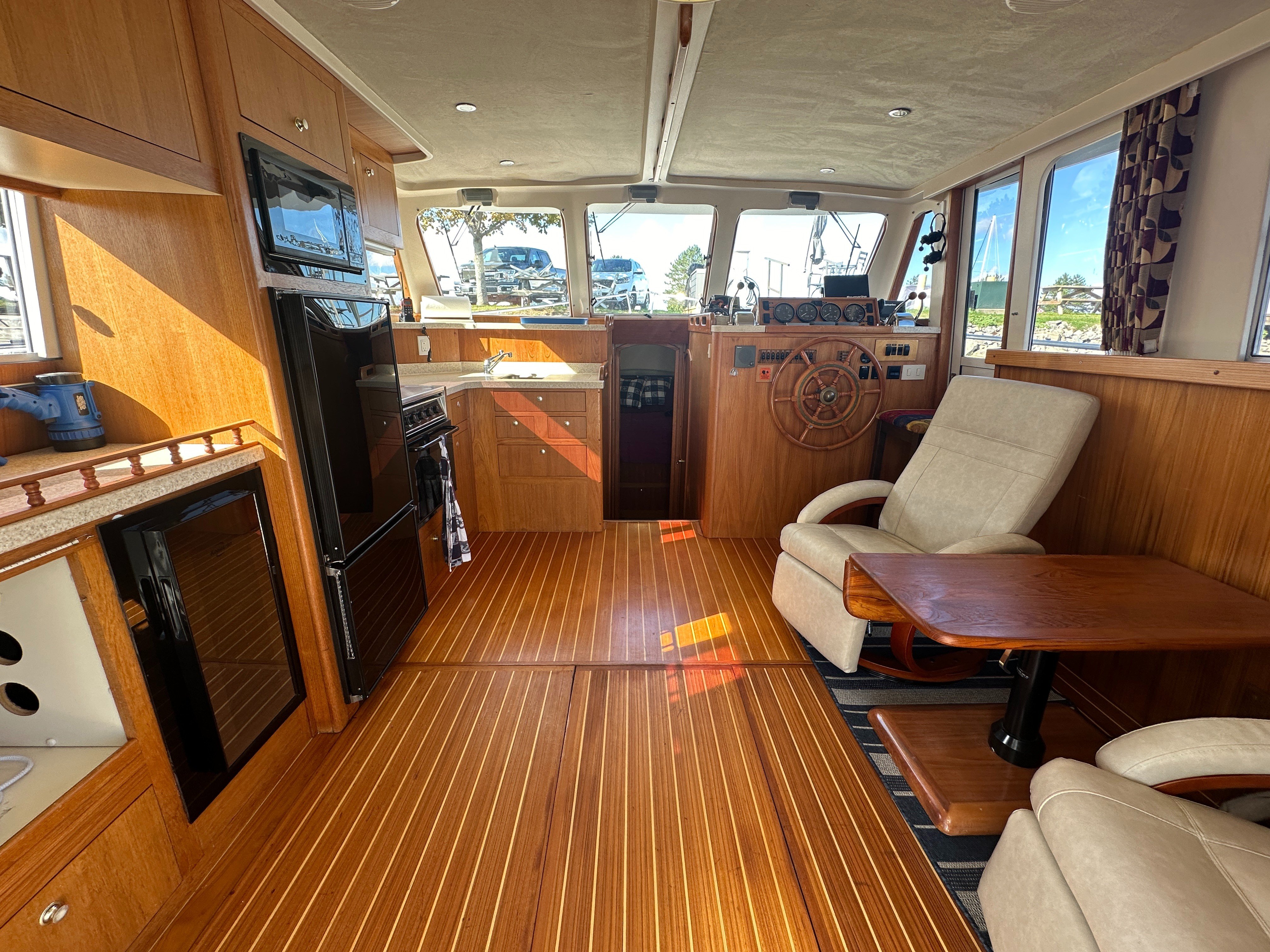 Entering the salon you'll find the television, wine fridge, 3/4 fridge, and L-shaped galley to Port. To Stb there are two recliner chairs and the secondary helm with full electronics.