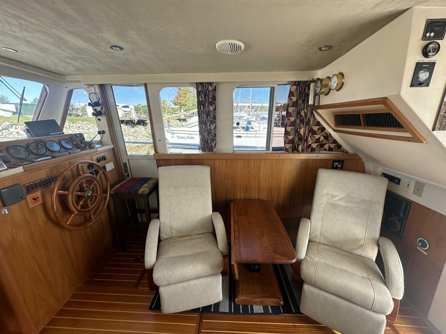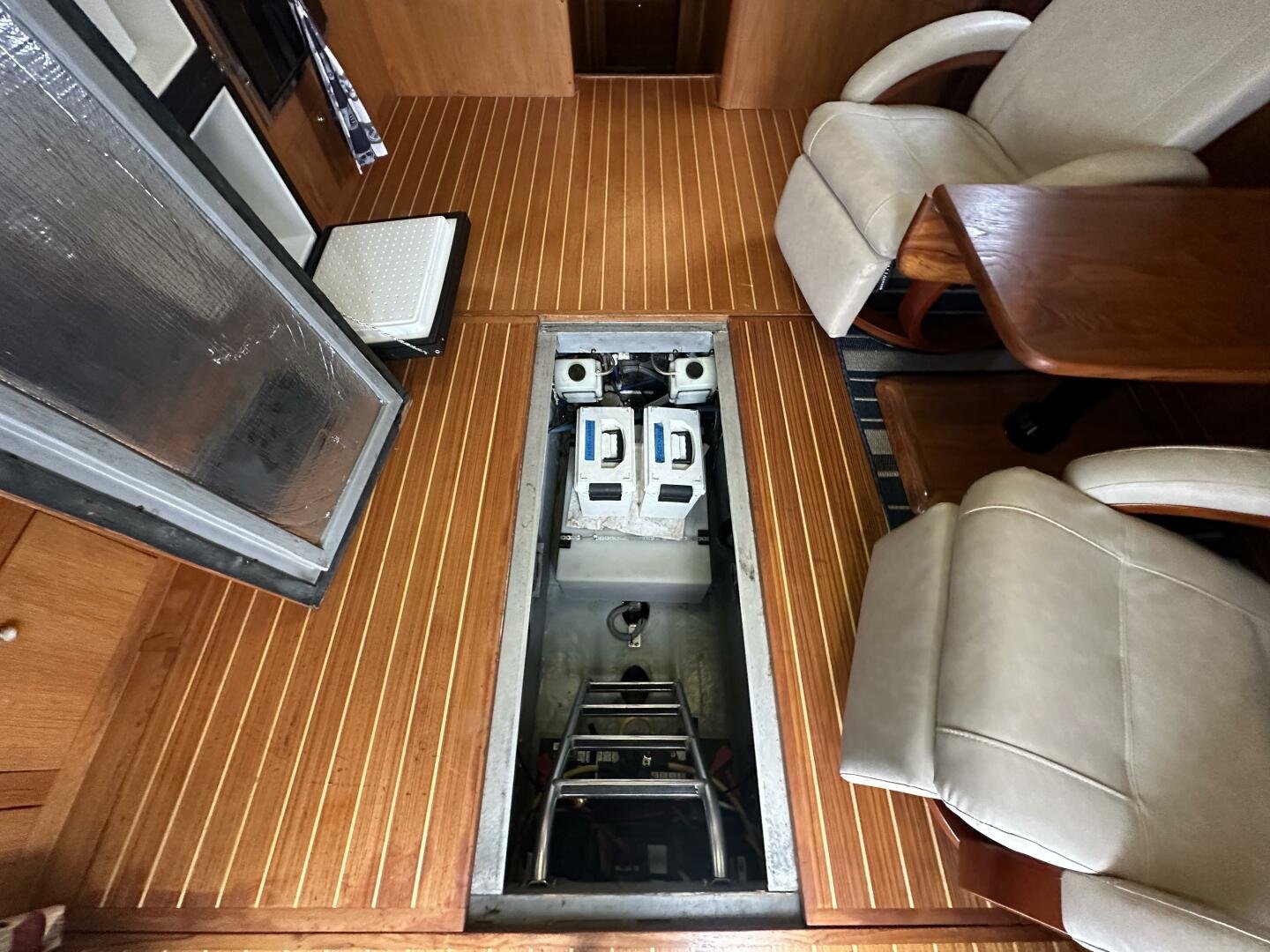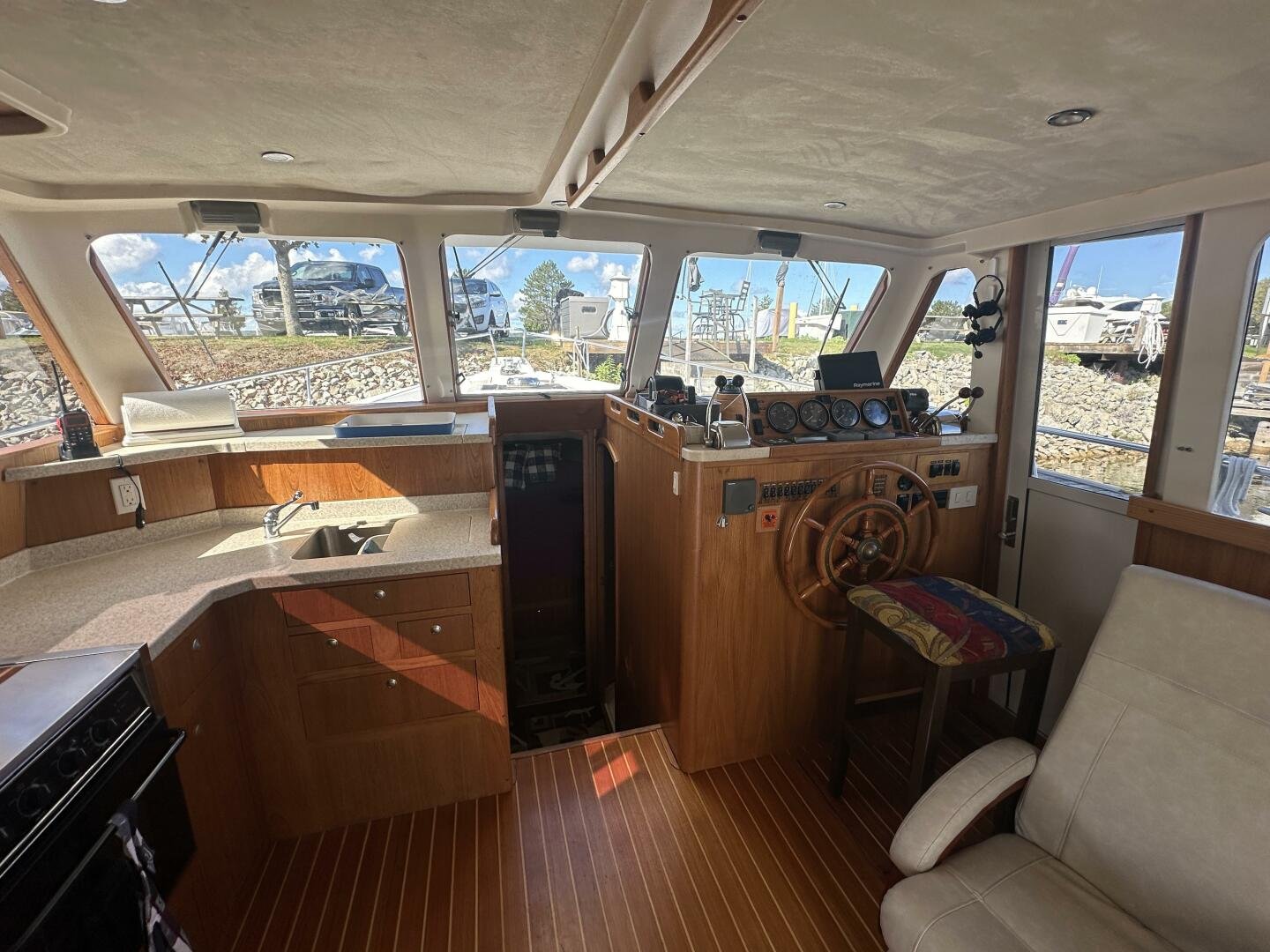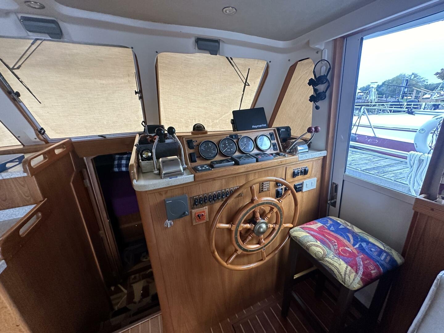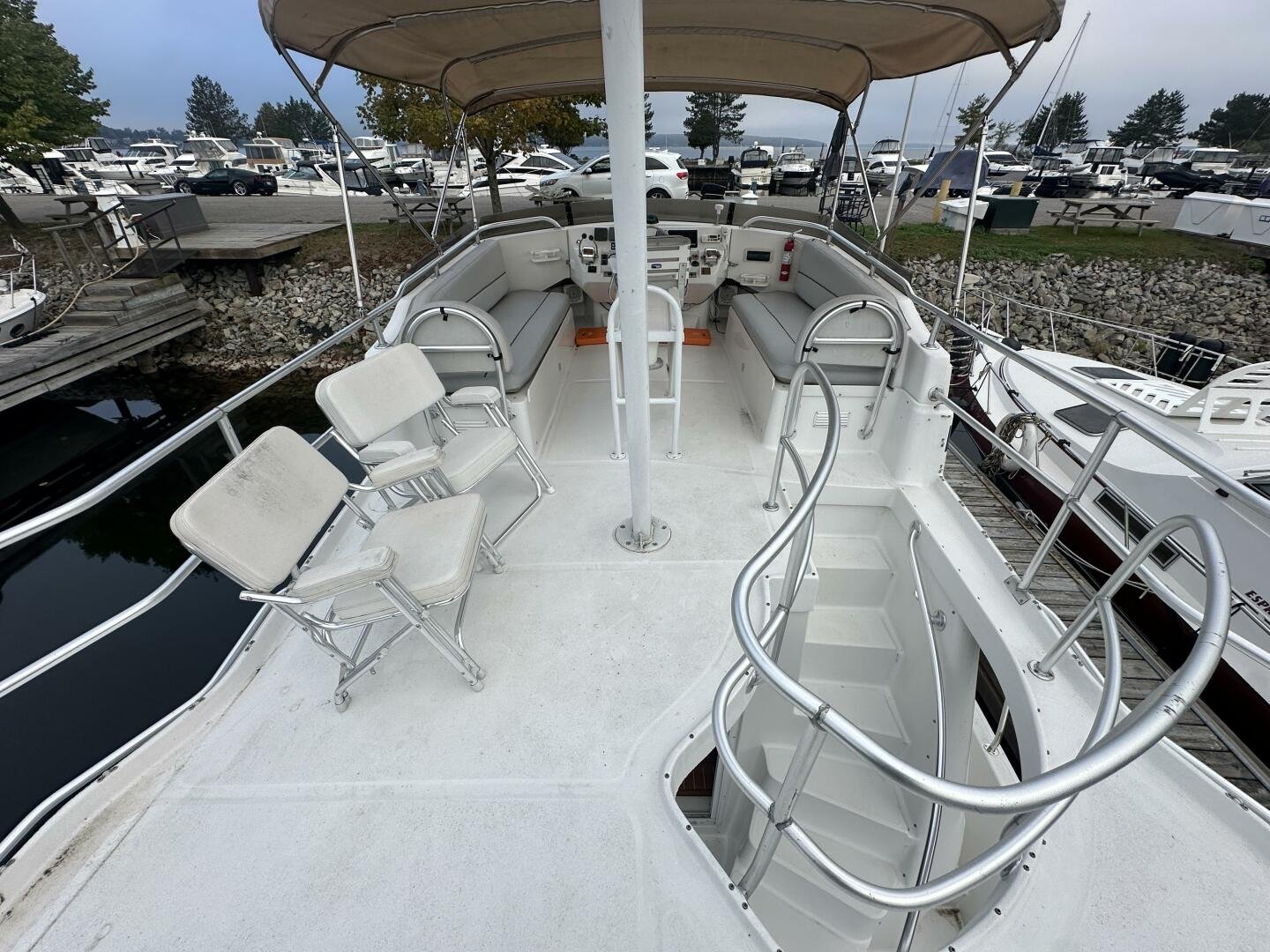 Stepping on board, you have an expansive swim platform with a center-line transom walkthrough to a large cockpit. You will find storage and access to the 8.0kw Kohler generator. Both sides of the pilothouse feature large walkarounds to provide easy of access to all areas of the vessel. From the cockpit, there is a set of molded steps starboard for the bridge. The bridge features storage, the primary helm, and ample seating.