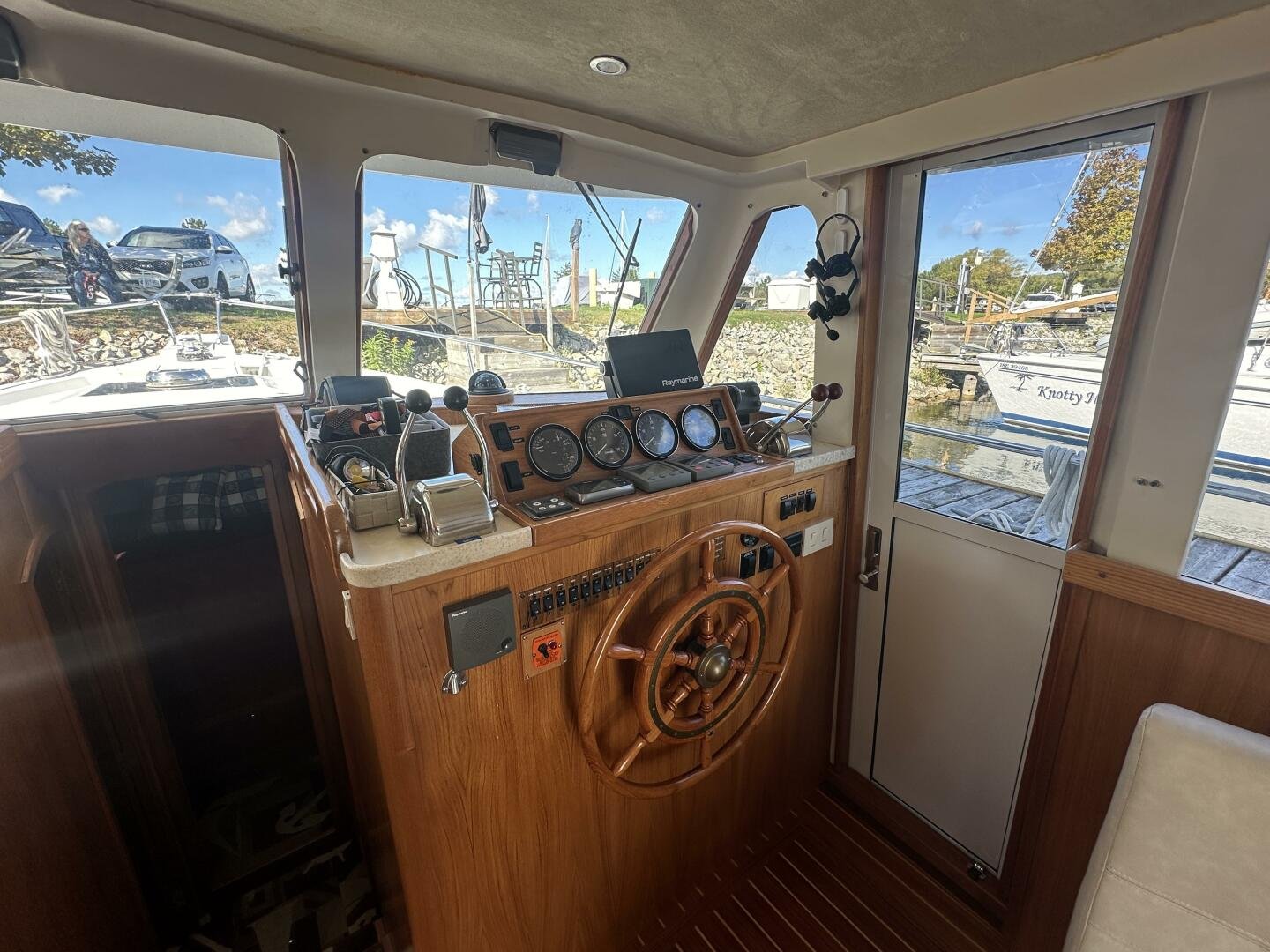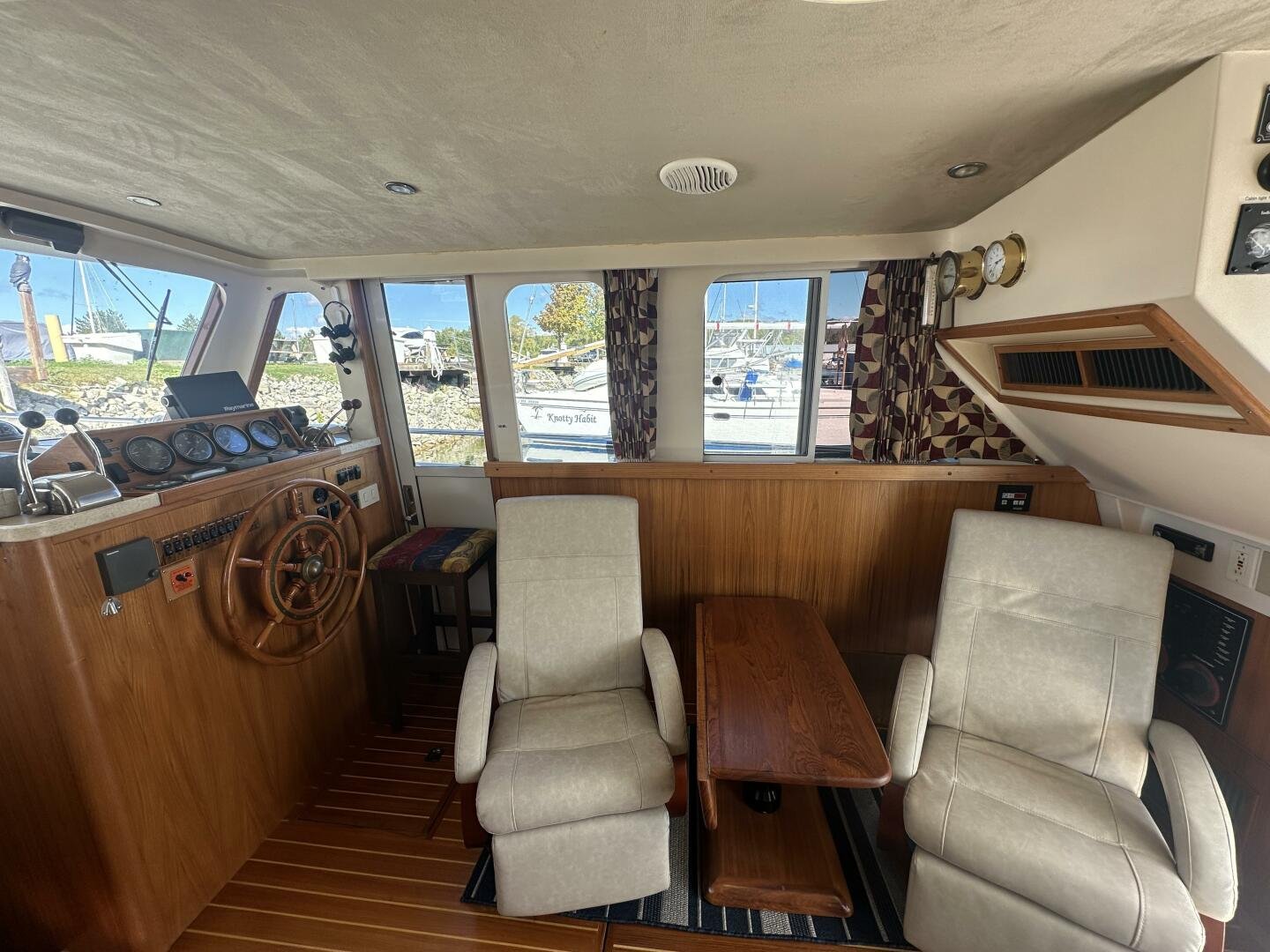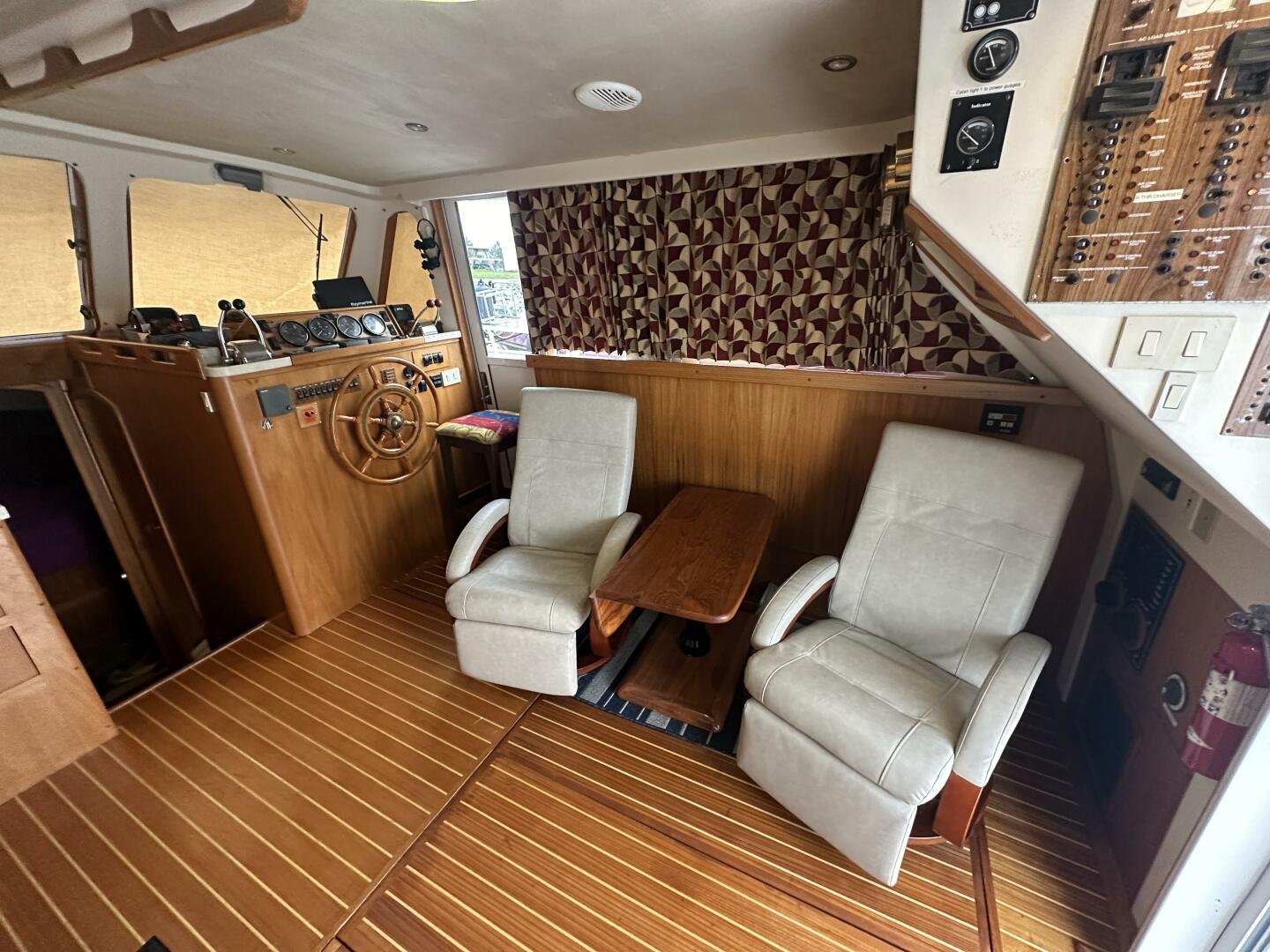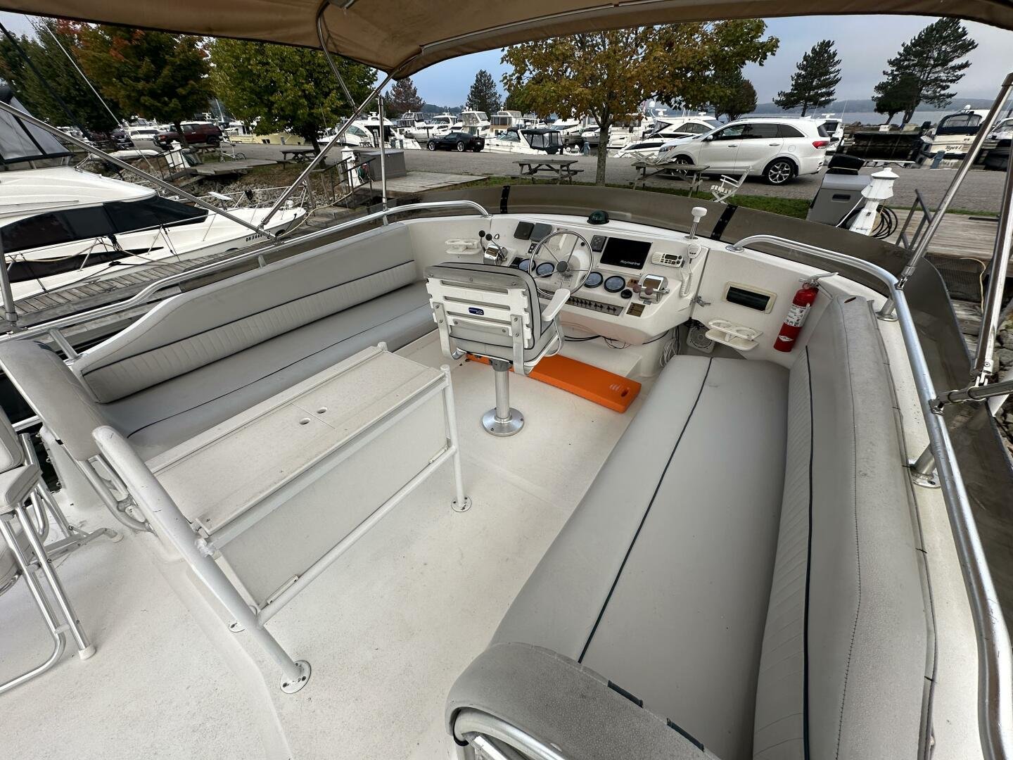 Stepping on board, you have an expansive swim platform with a center-line transom walkthrough to a large cockpit. You will find storage and access to the 8.0kw Kohler generator. Both sides of the pilothouse feature large walkarounds to provide easy of access to all areas of the vessel. From the cockpit, there is a set of molded steps starboard for the bridge. The bridge features storage, the primary helm, and ample seating.