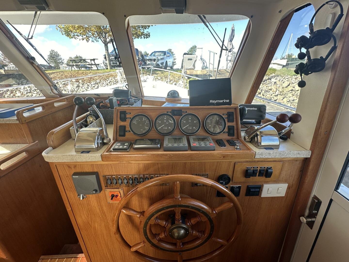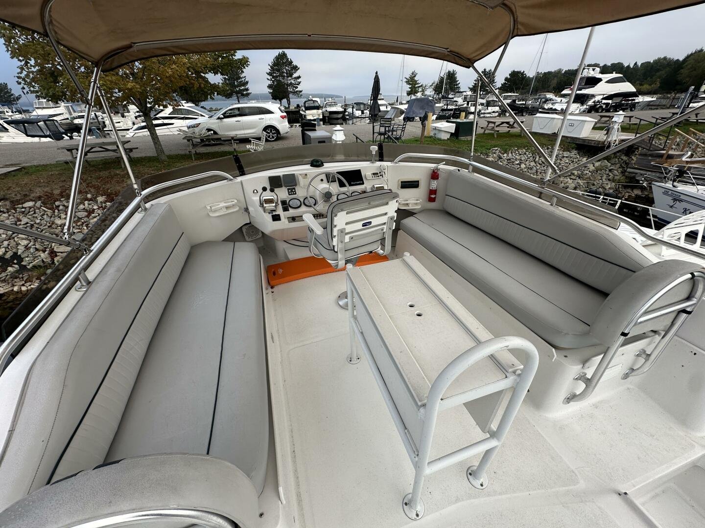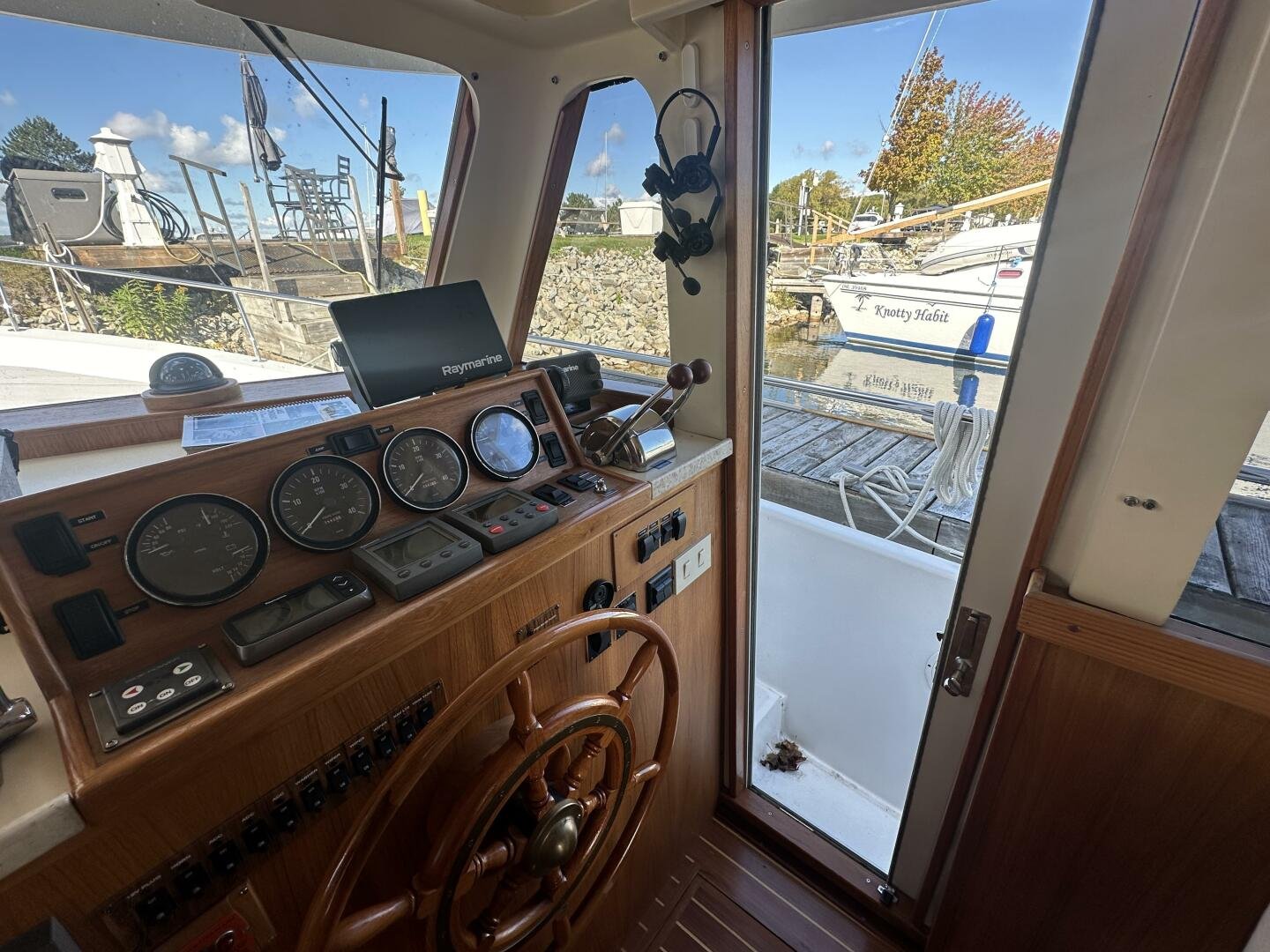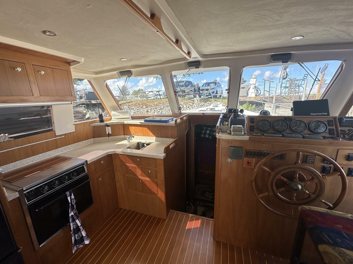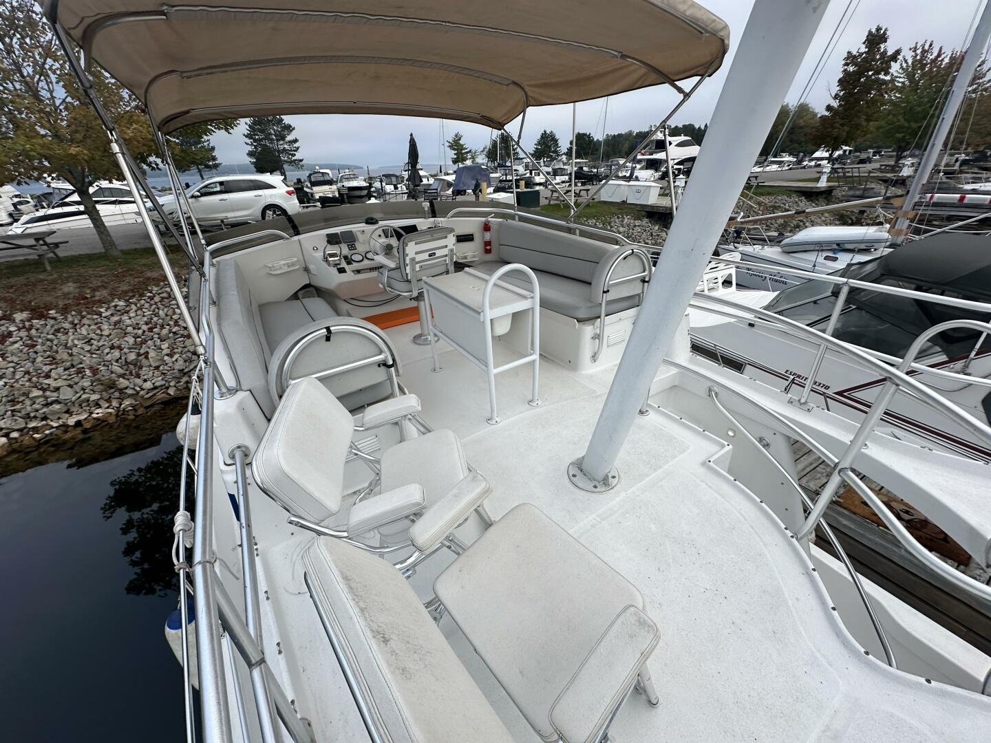 Stepping on board, you have an expansive swim platform with a center-line transom walkthrough to a large cockpit. You will find storage and access to the 8.0kw Kohler generator. Both sides of the pilothouse feature large walkarounds to provide easy of access to all areas of the vessel. From the cockpit, there is a set of molded steps starboard for the bridge. The bridge features storage, the primary helm, and ample seating.