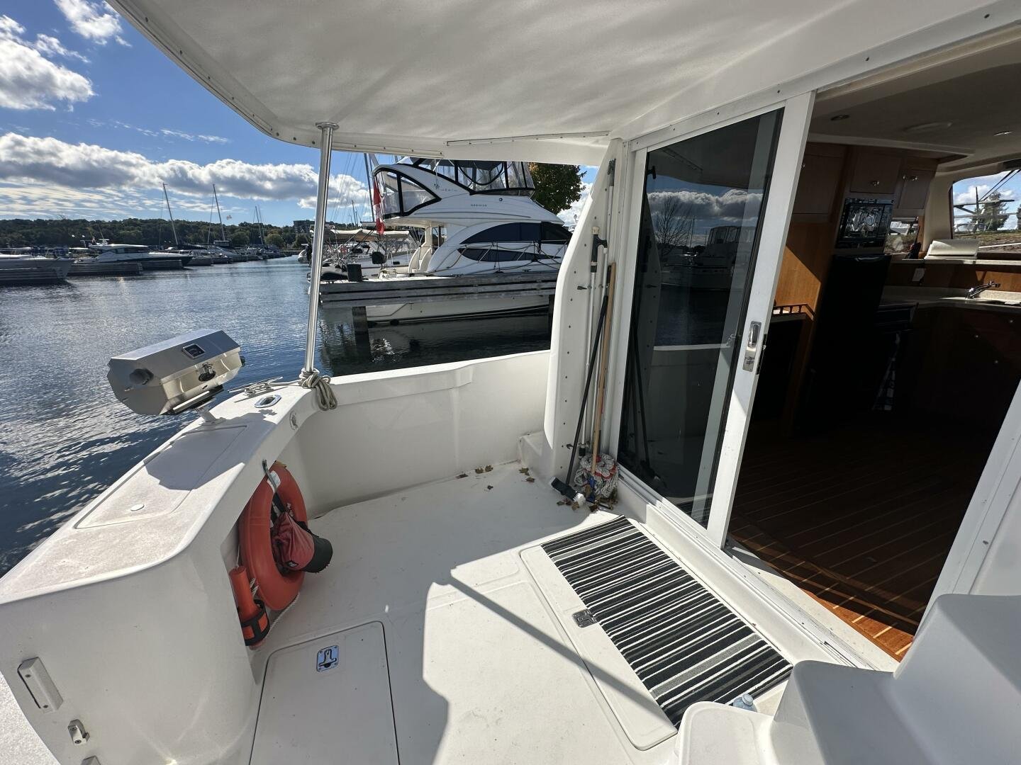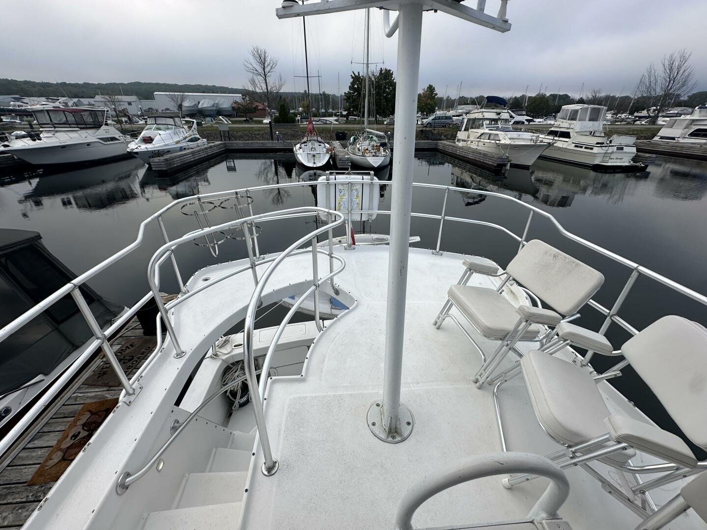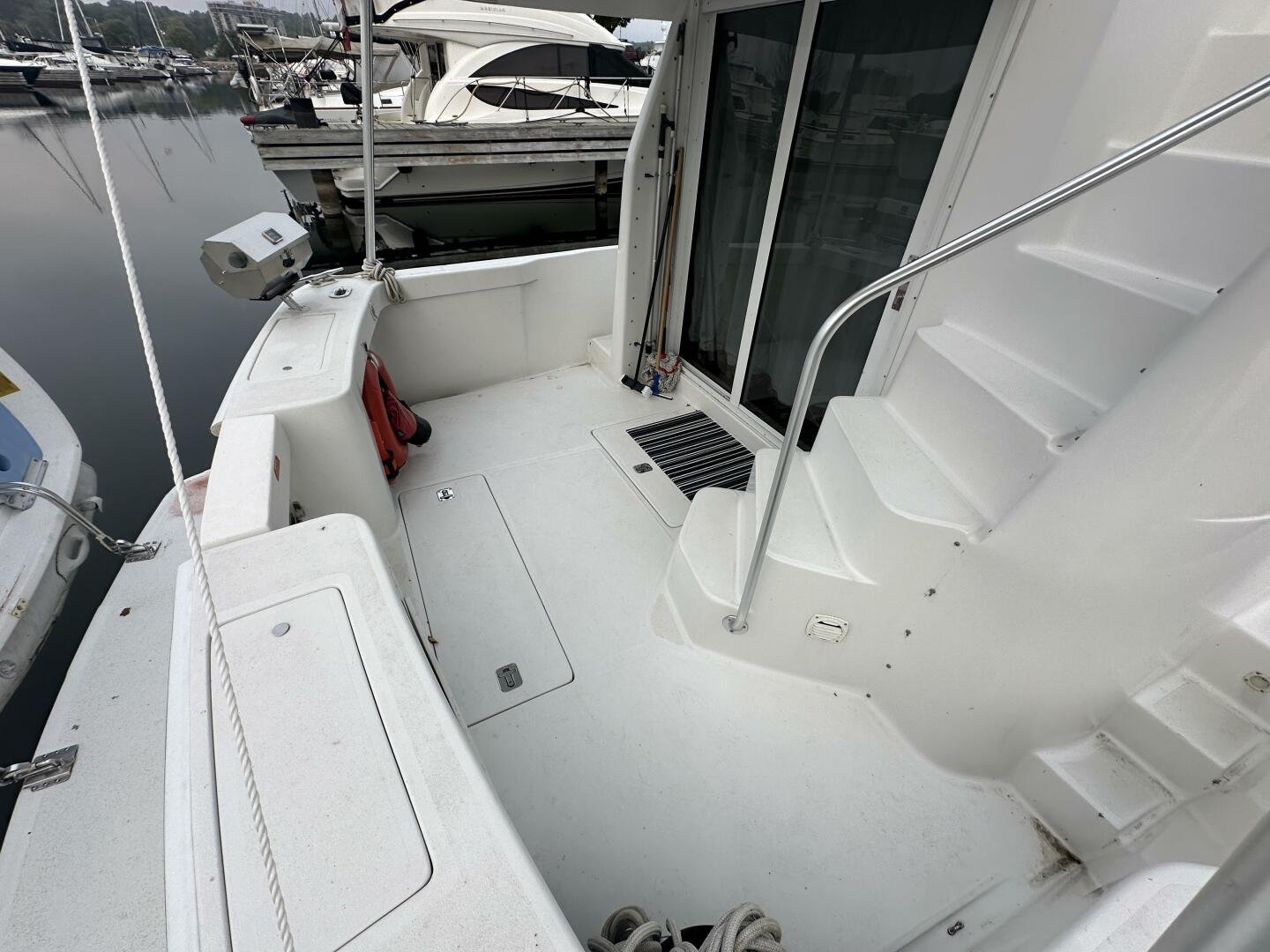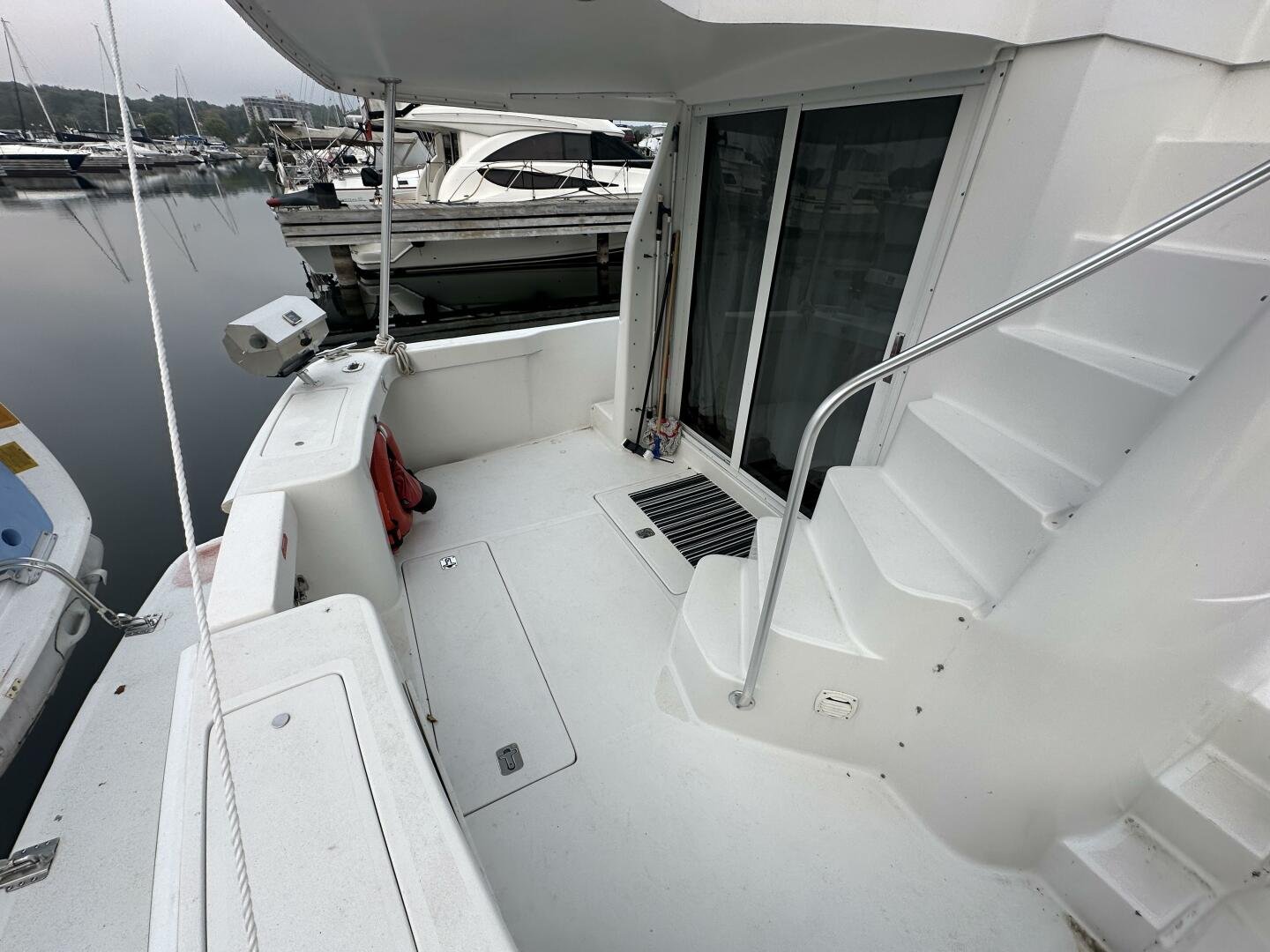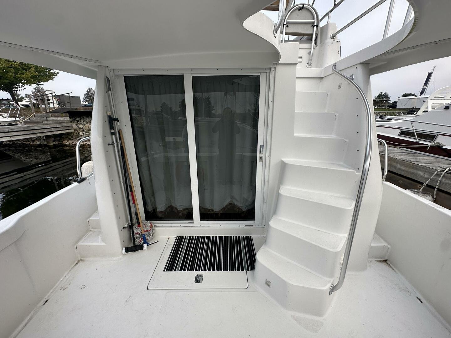 Stepping on board, you have an expansive swim platform with a center-line transom walkthrough to a large cockpit. You will find storage and access to the 8.0kw Kohler generator. Both sides of the pilothouse feature large walkarounds to provide easy of access to all areas of the vessel. From the cockpit, there is a set of molded steps starboard for the bridge. The bridge features storage, the primary helm, and ample seating.