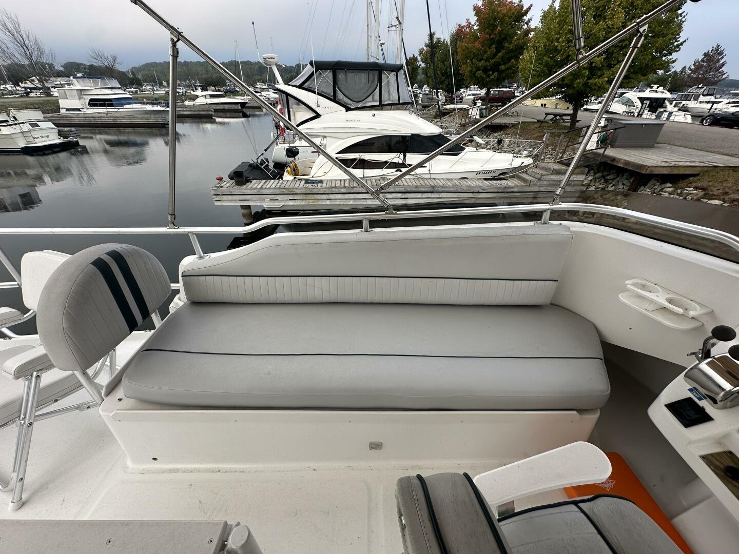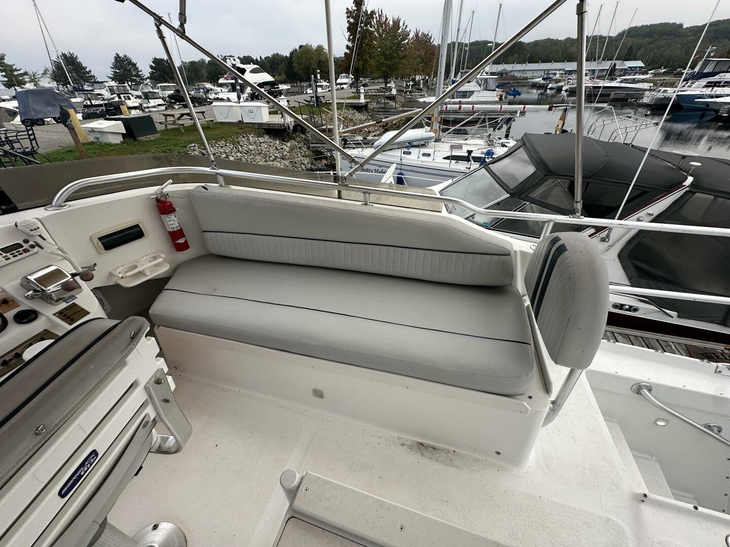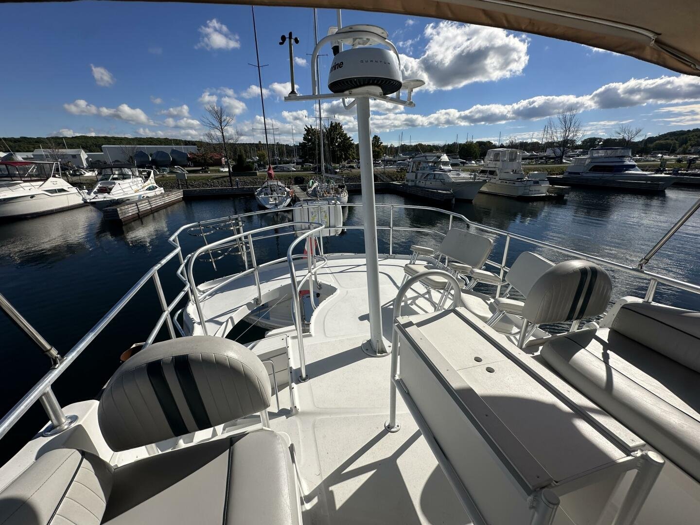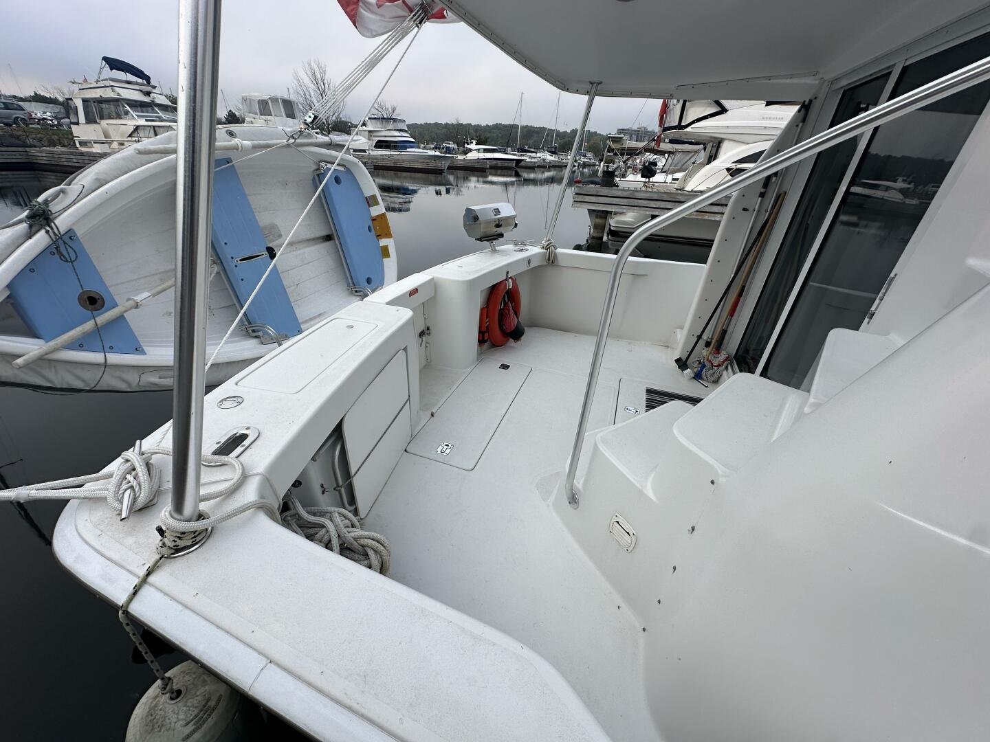 Stepping on board, you have an expansive swim platform with a center-line transom walkthrough to a large cockpit. You will find storage and access to the 8.0kw Kohler generator. Both sides of the pilothouse feature large walkarounds to provide easy of access to all areas of the vessel. From the cockpit, there is a set of molded steps starboard for the bridge. The bridge features storage, the primary helm, and ample seating.