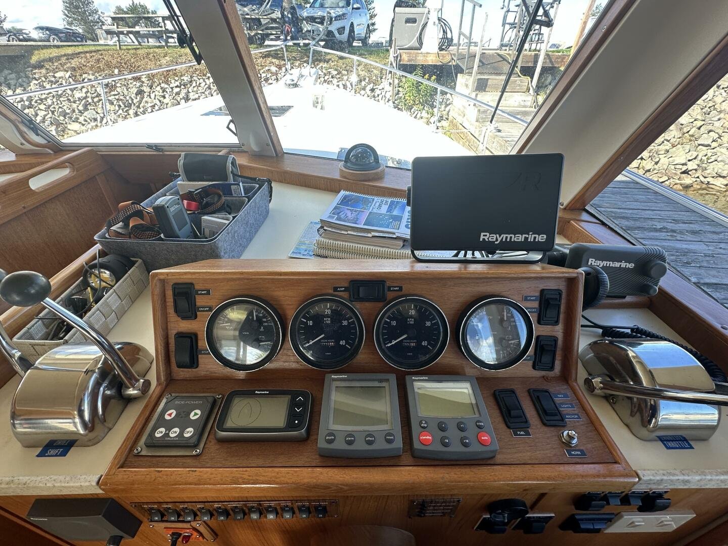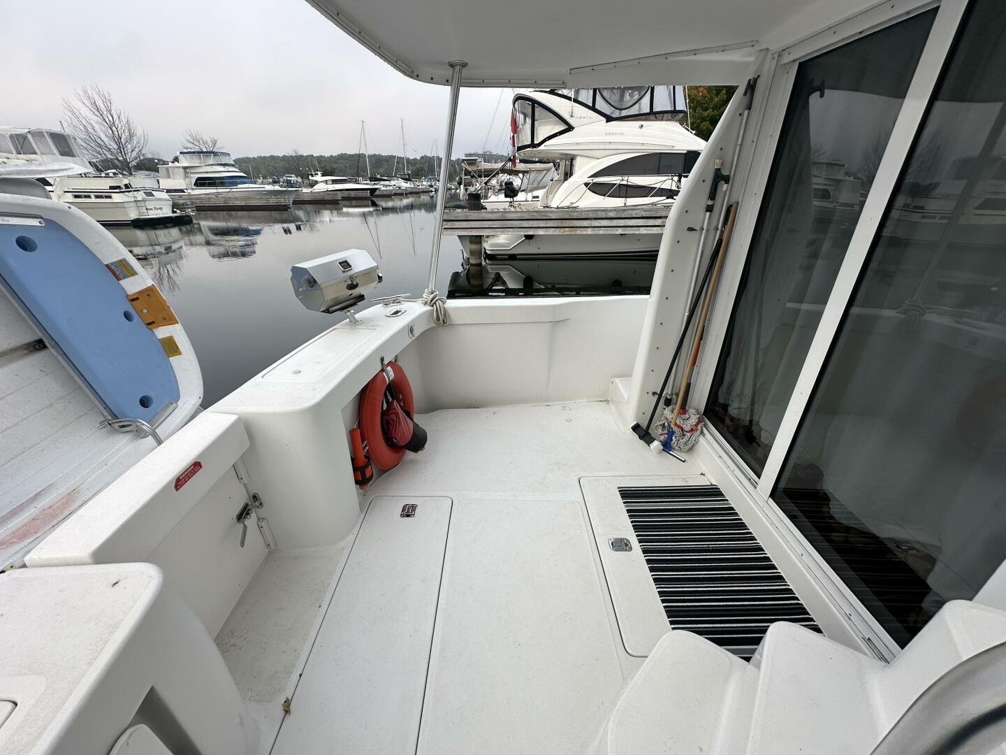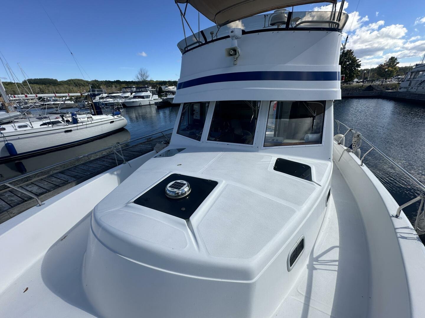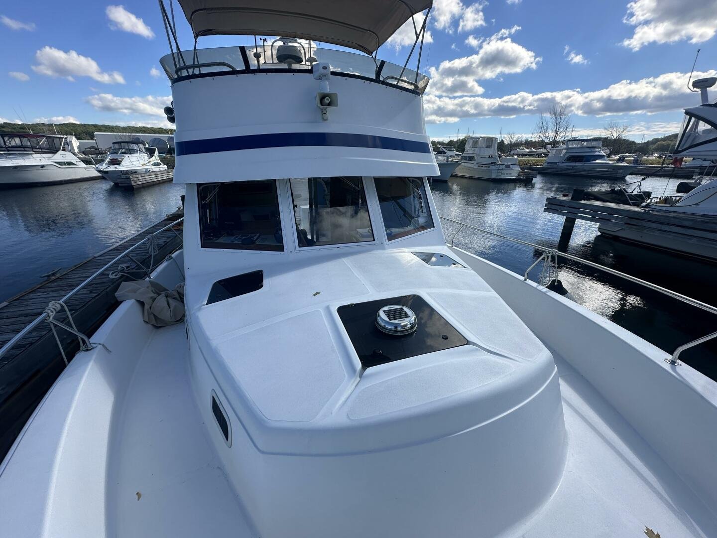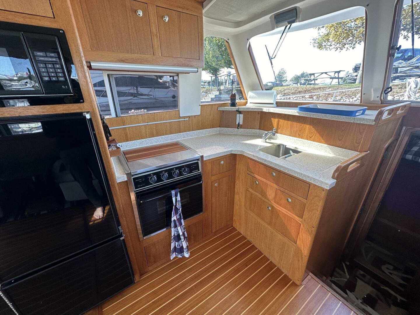 Stepping on board, you have an expansive swim platform with a center-line transom walkthrough to a large cockpit. You will find storage and access to the 8.0kw Kohler generator. Both sides of the pilothouse feature large walkarounds to provide easy of access to all areas of the vessel. From the cockpit, there is a set of molded steps starboard for the bridge. The bridge features storage, the primary helm, and ample seating.
