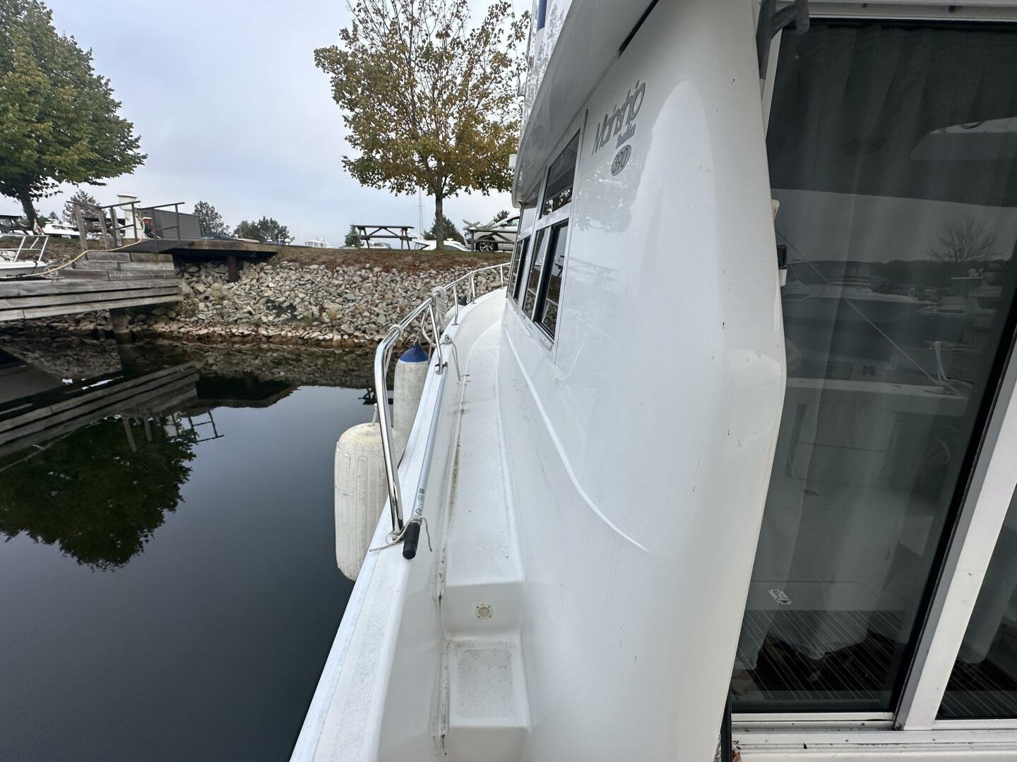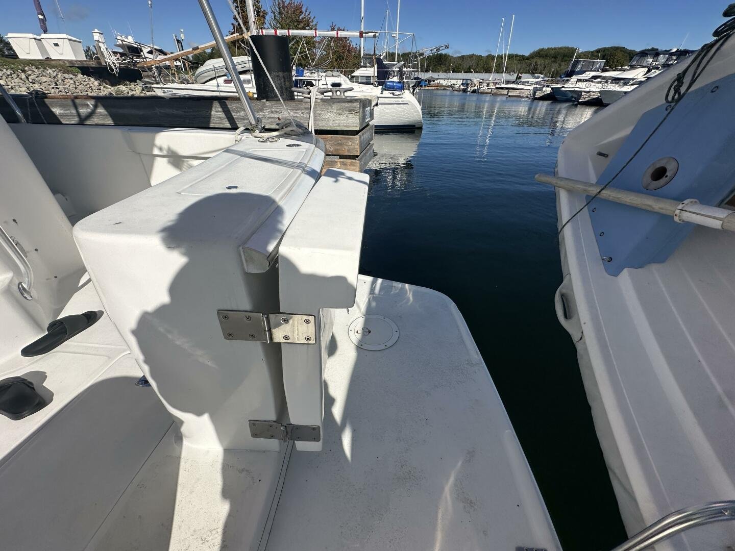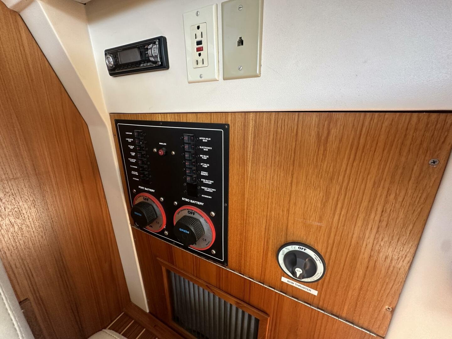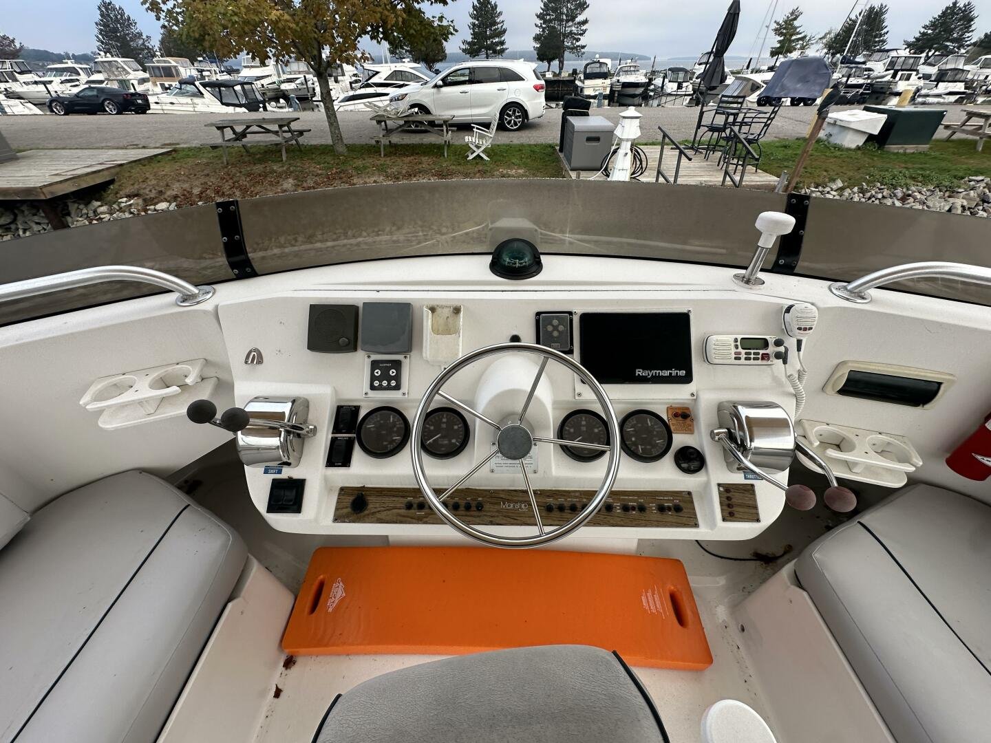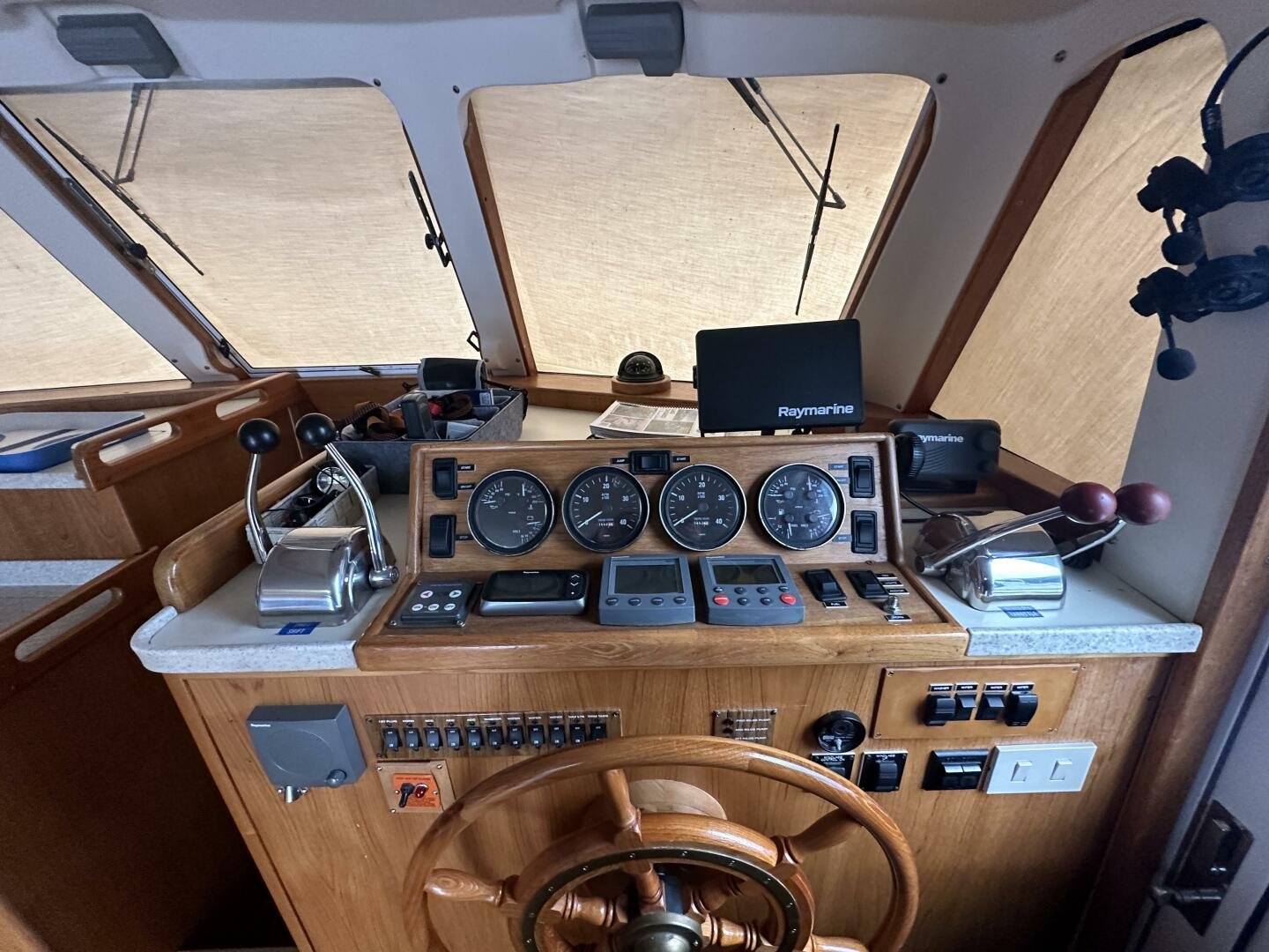 Stepping on board, you have an expansive swim platform with a center-line transom walkthrough to a large cockpit. You will find storage and access to the 8.0kw Kohler generator. Both sides of the pilothouse feature large walkarounds to provide easy of access to all areas of the vessel. From the cockpit, there is a set of molded steps starboard for the bridge. The bridge features storage, the primary helm, and ample seating.