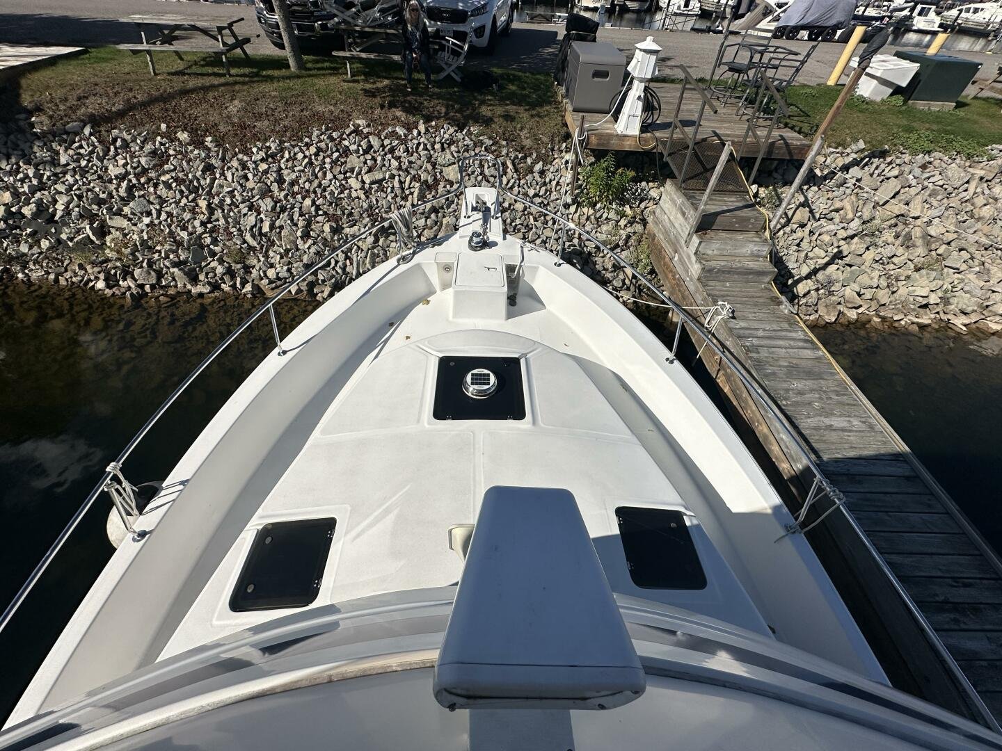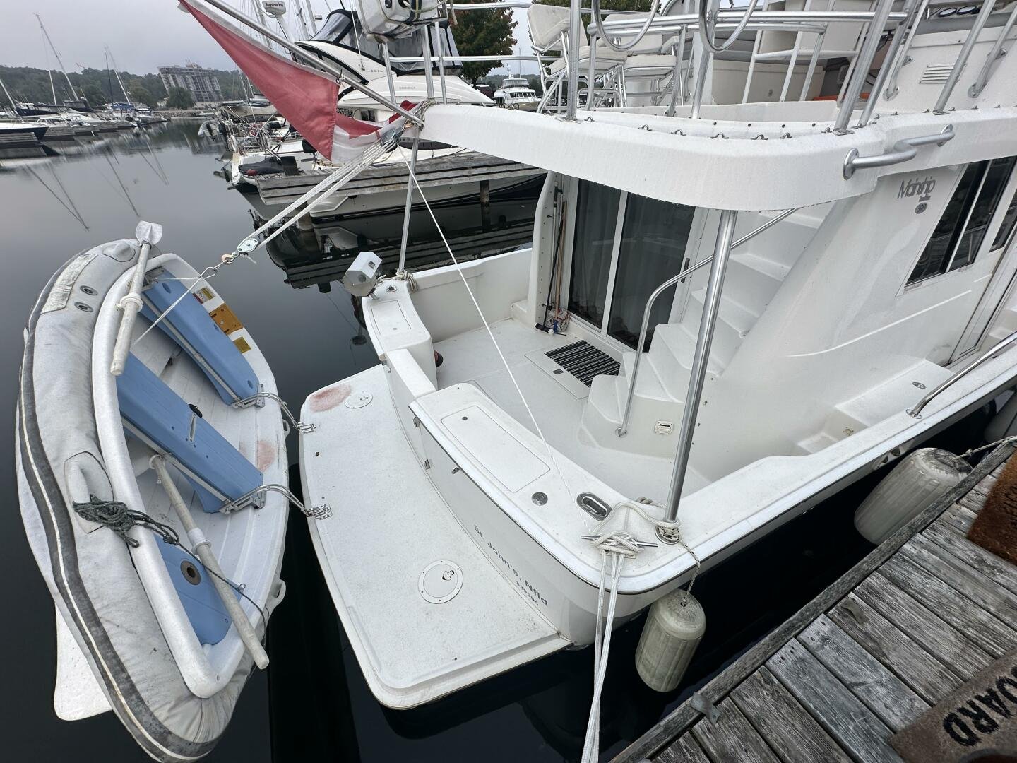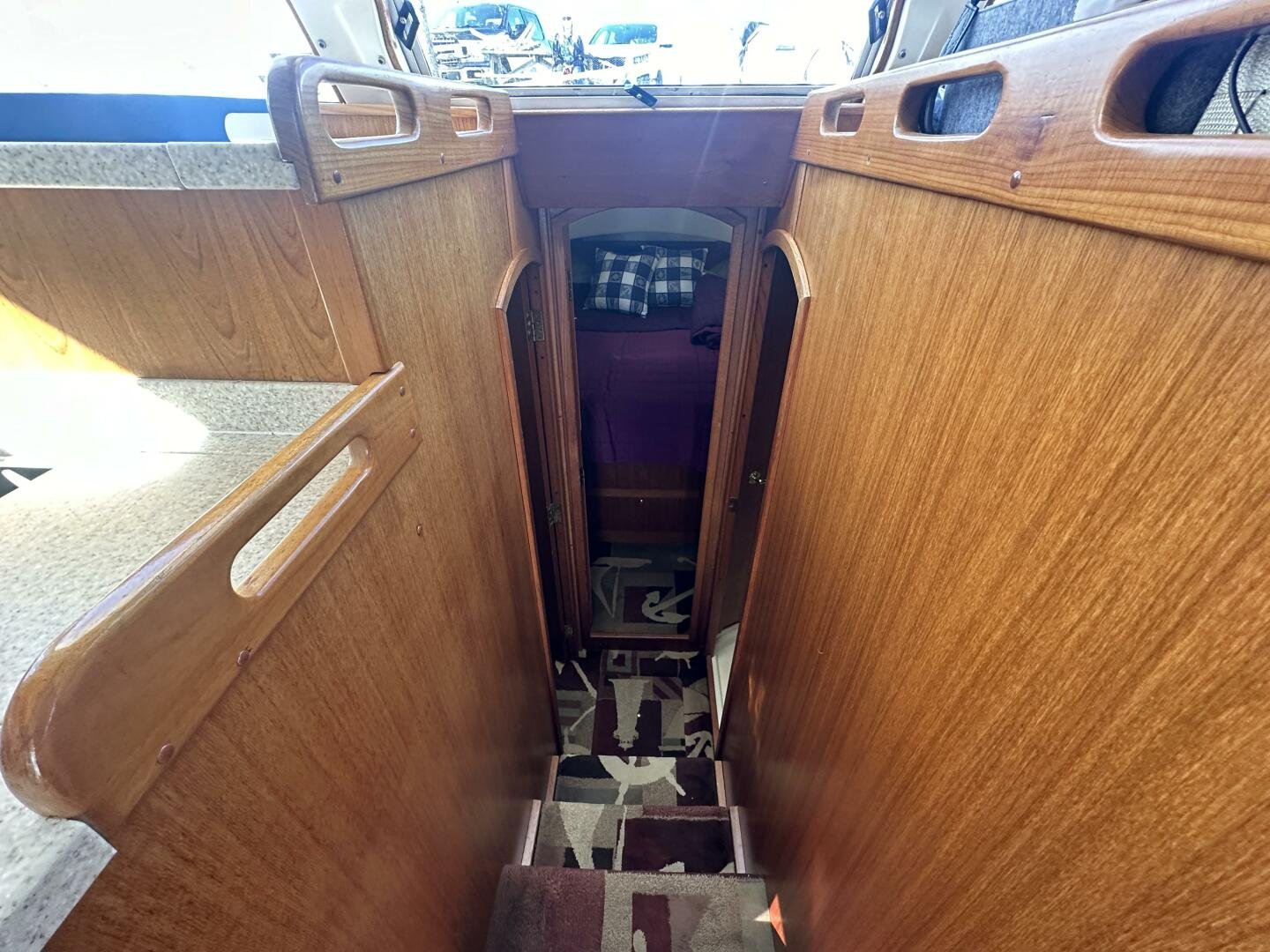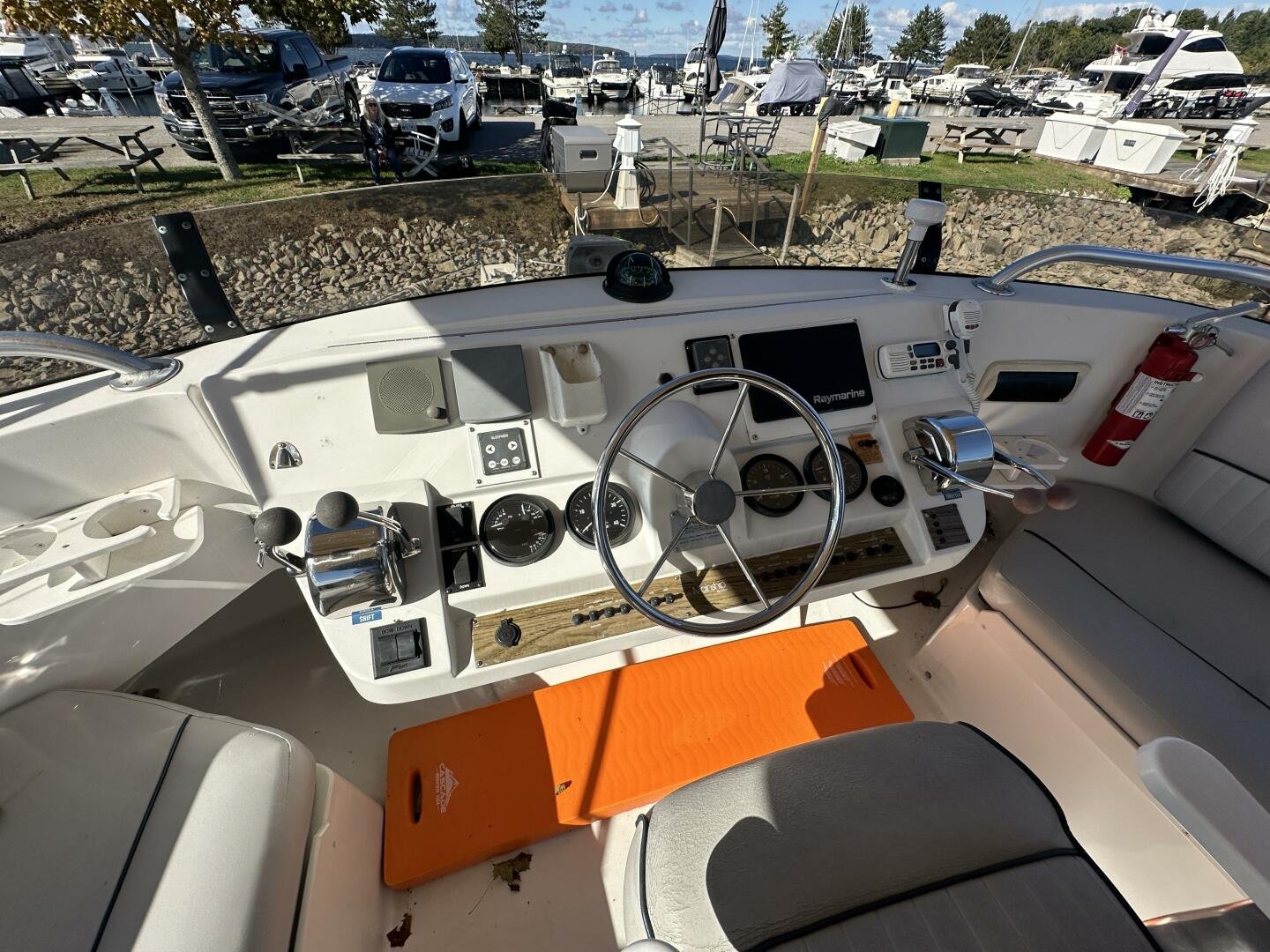 Stepping on board, you have an expansive swim platform with a center-line transom walkthrough to a large cockpit. You will find storage and access to the 8.0kw Kohler generator. Both sides of the pilothouse feature large walkarounds to provide easy of access to all areas of the vessel. From the cockpit, there is a set of molded steps starboard for the bridge. The bridge features storage, the primary helm, and ample seating.