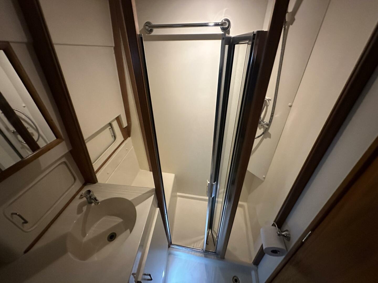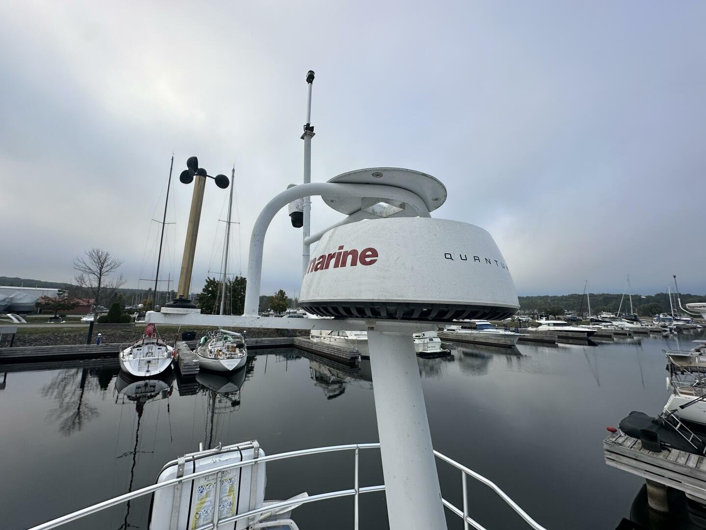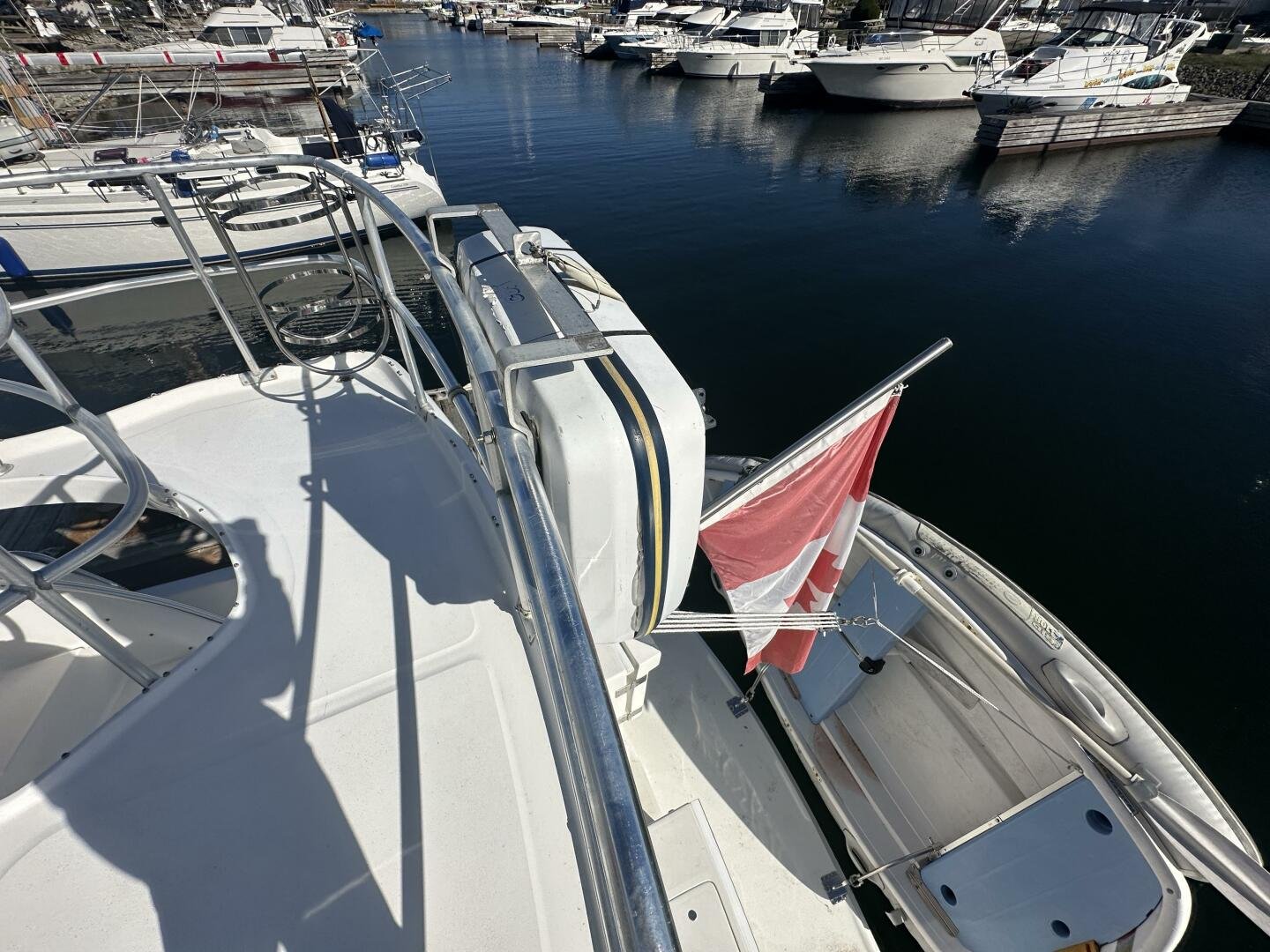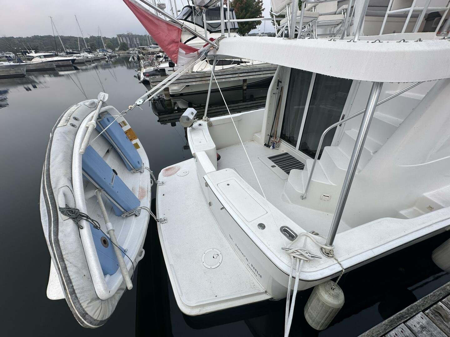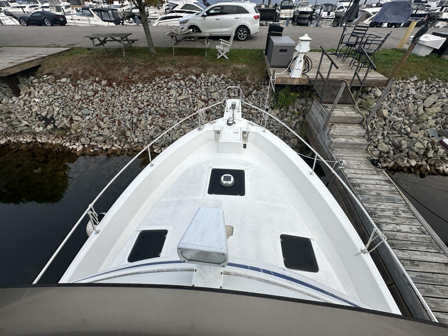 Stepping on board, you have an expansive swim platform with a center-line transom walkthrough to a large cockpit. You will find storage and access to the 8.0kw Kohler generator. Both sides of the pilothouse feature large walkarounds to provide easy of access to all areas of the vessel. From the cockpit, there is a set of molded steps starboard for the bridge. The bridge features storage, the primary helm, and ample seating.