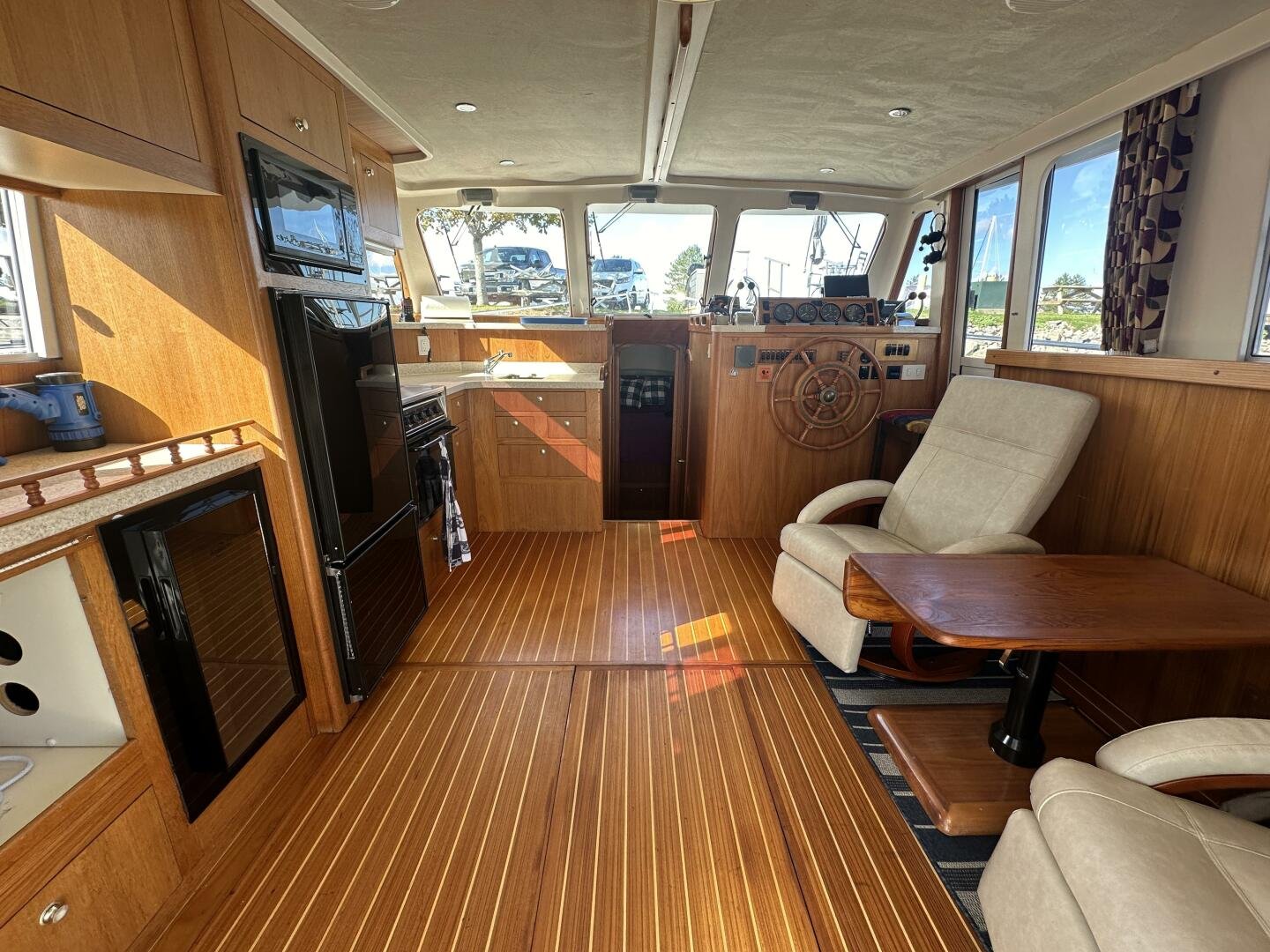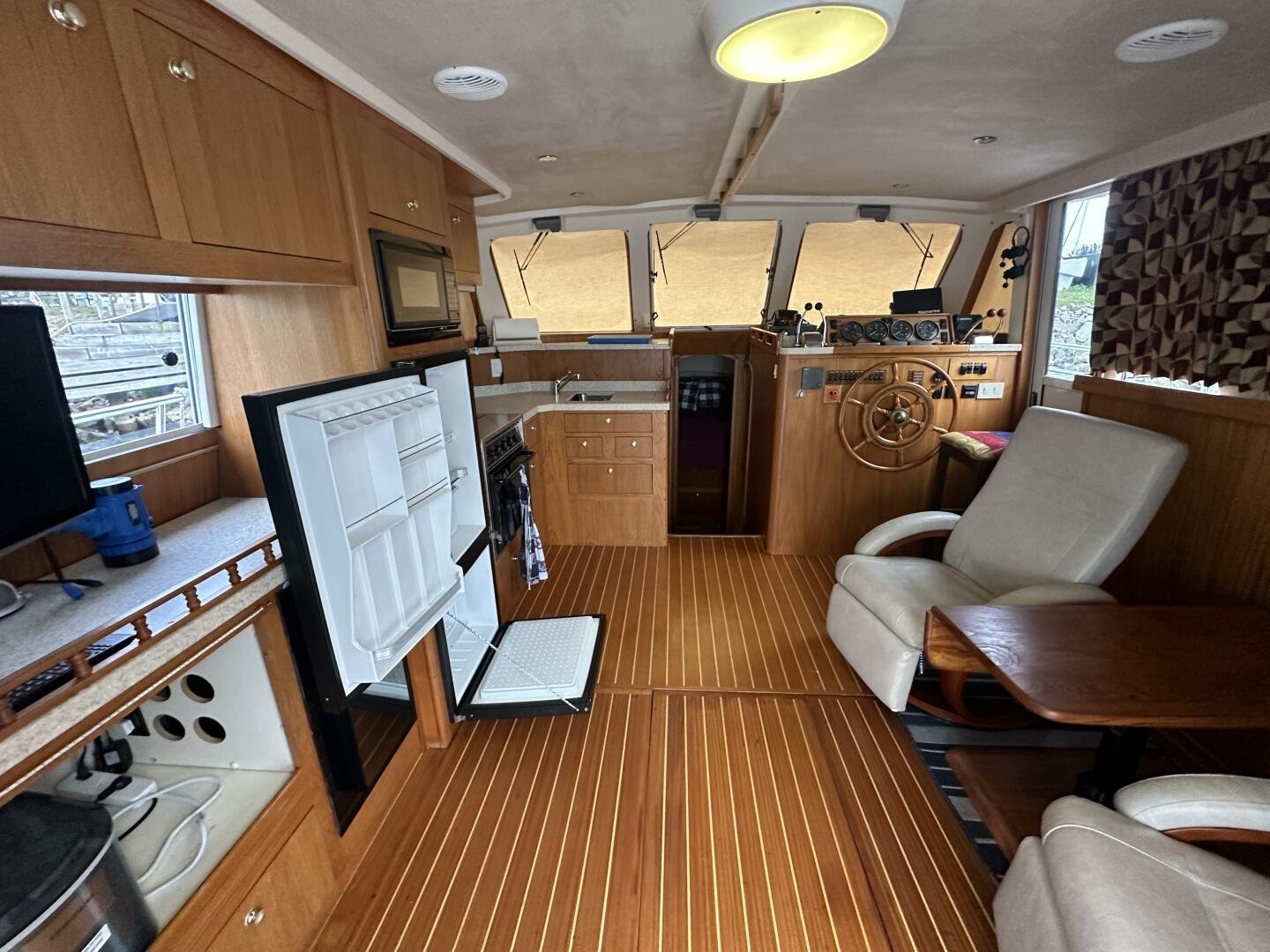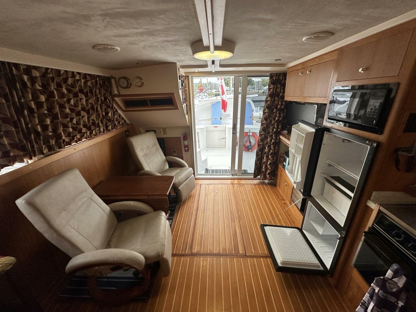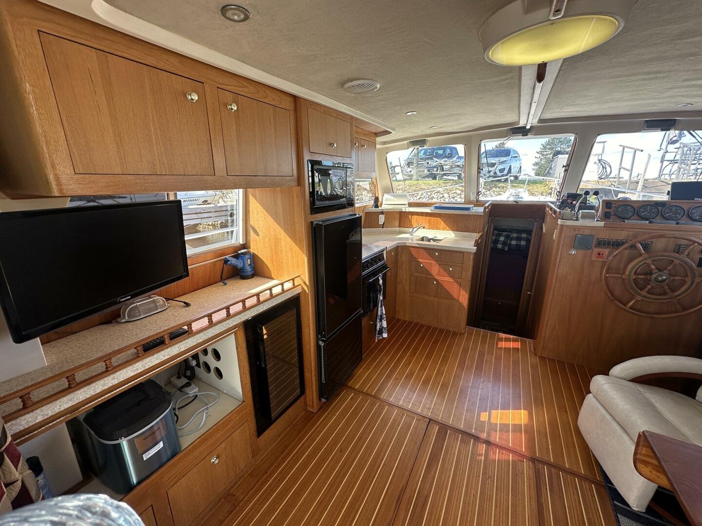 Entering the salon you'll find the television, wine fridge, 3/4 fridge, and L-shaped galley to Port. To Stb there are two recliner chairs and the secondary helm with full electronics.
