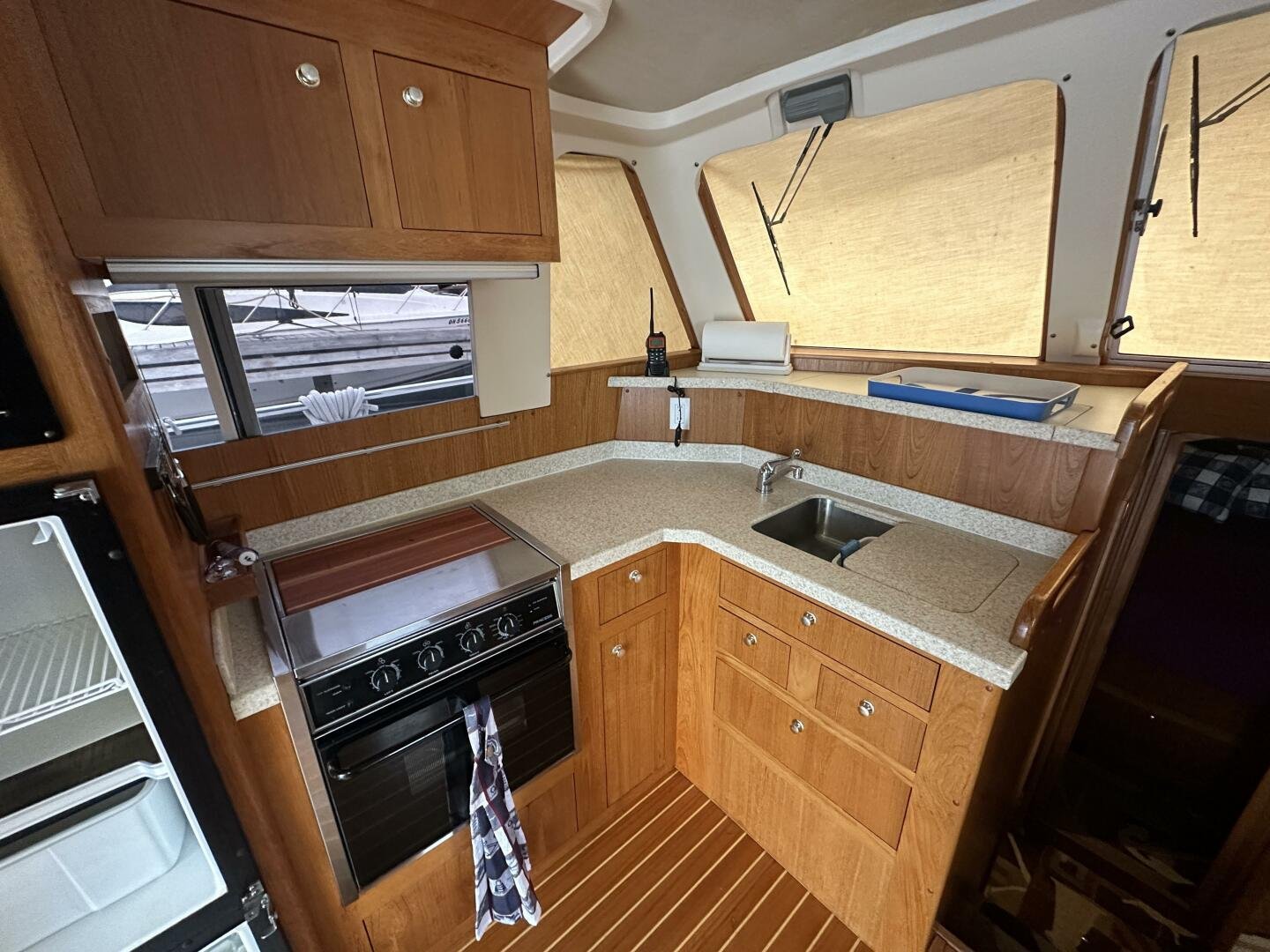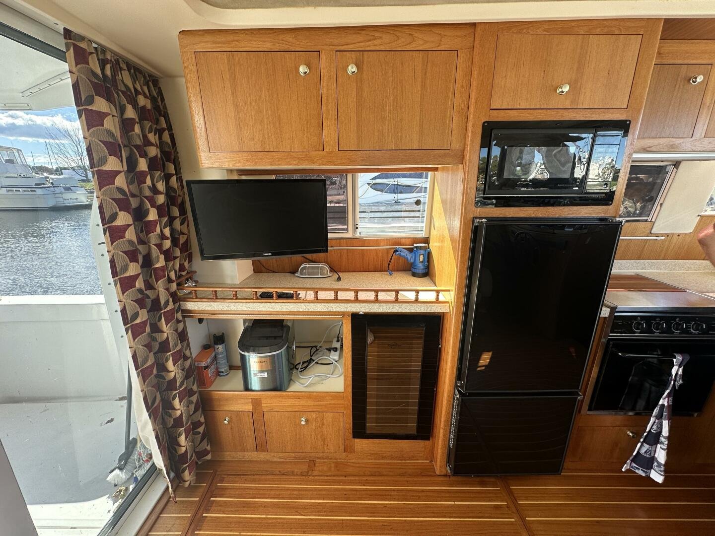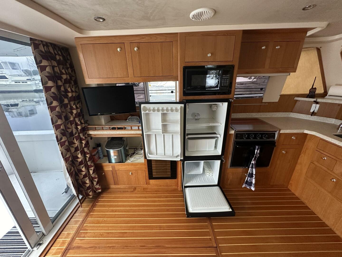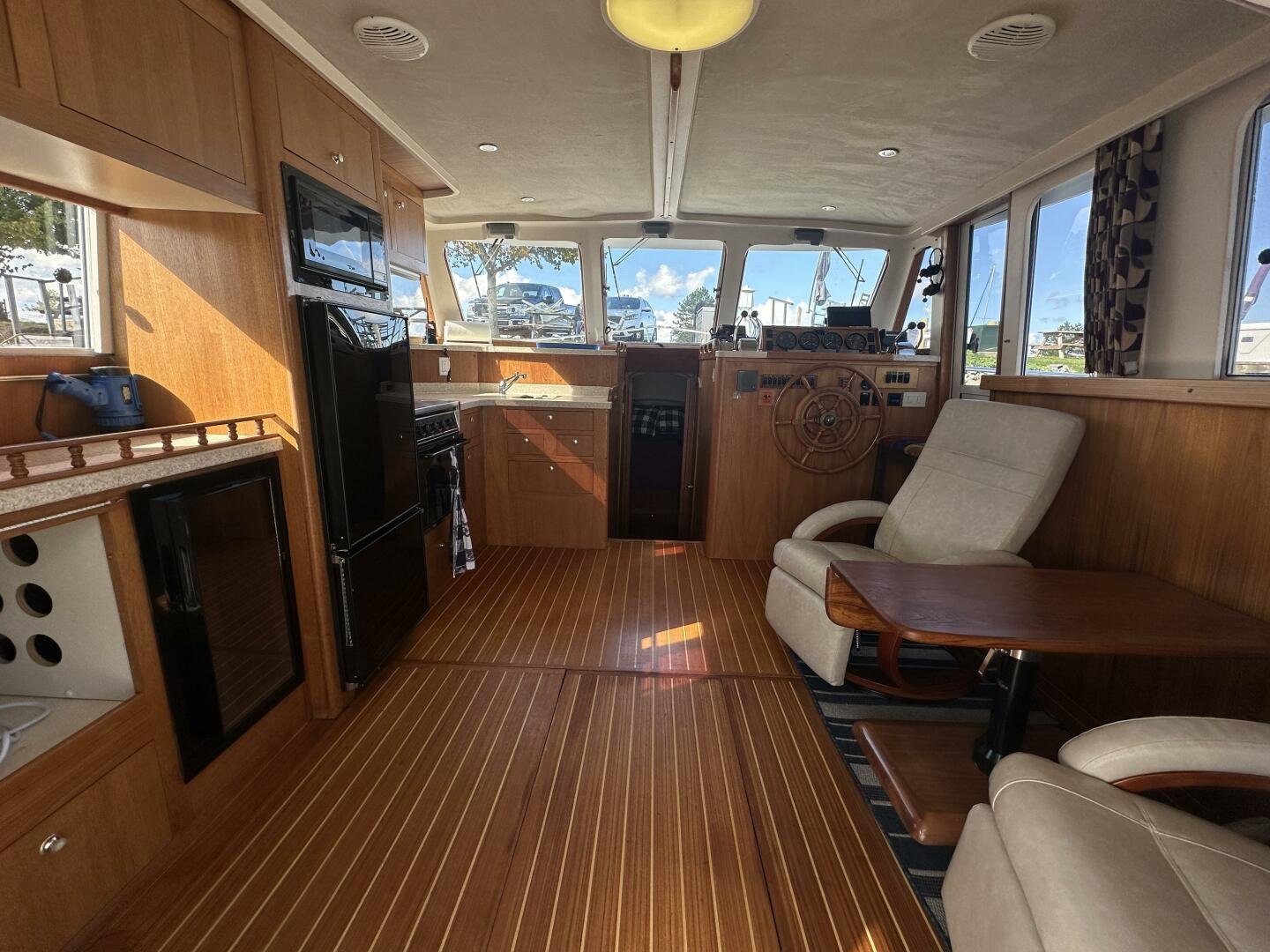 Entering the salon you'll find the television, wine fridge, 3/4 fridge, and L-shaped galley to Port. To Stb there are two recliner chairs and the secondary helm with full electronics.