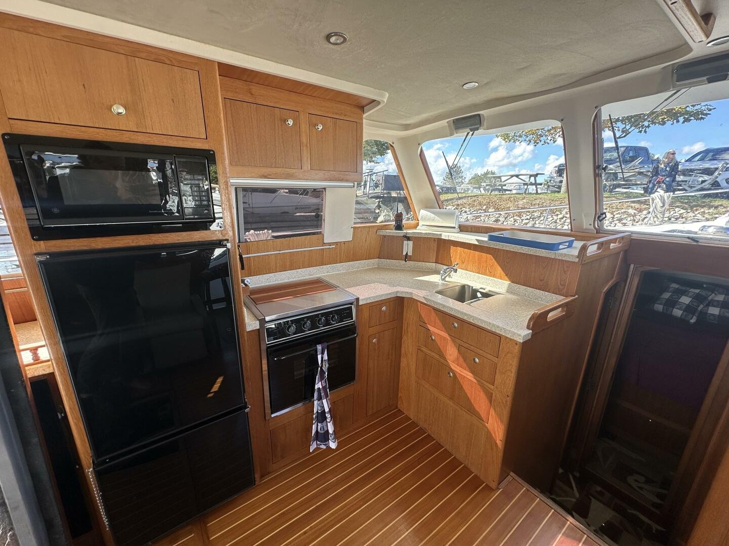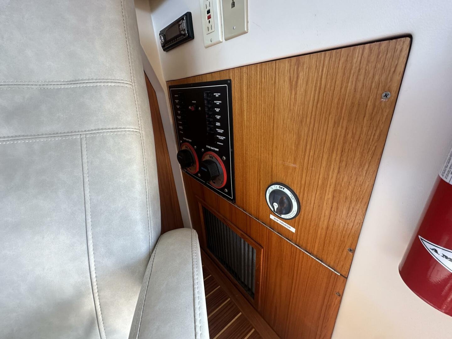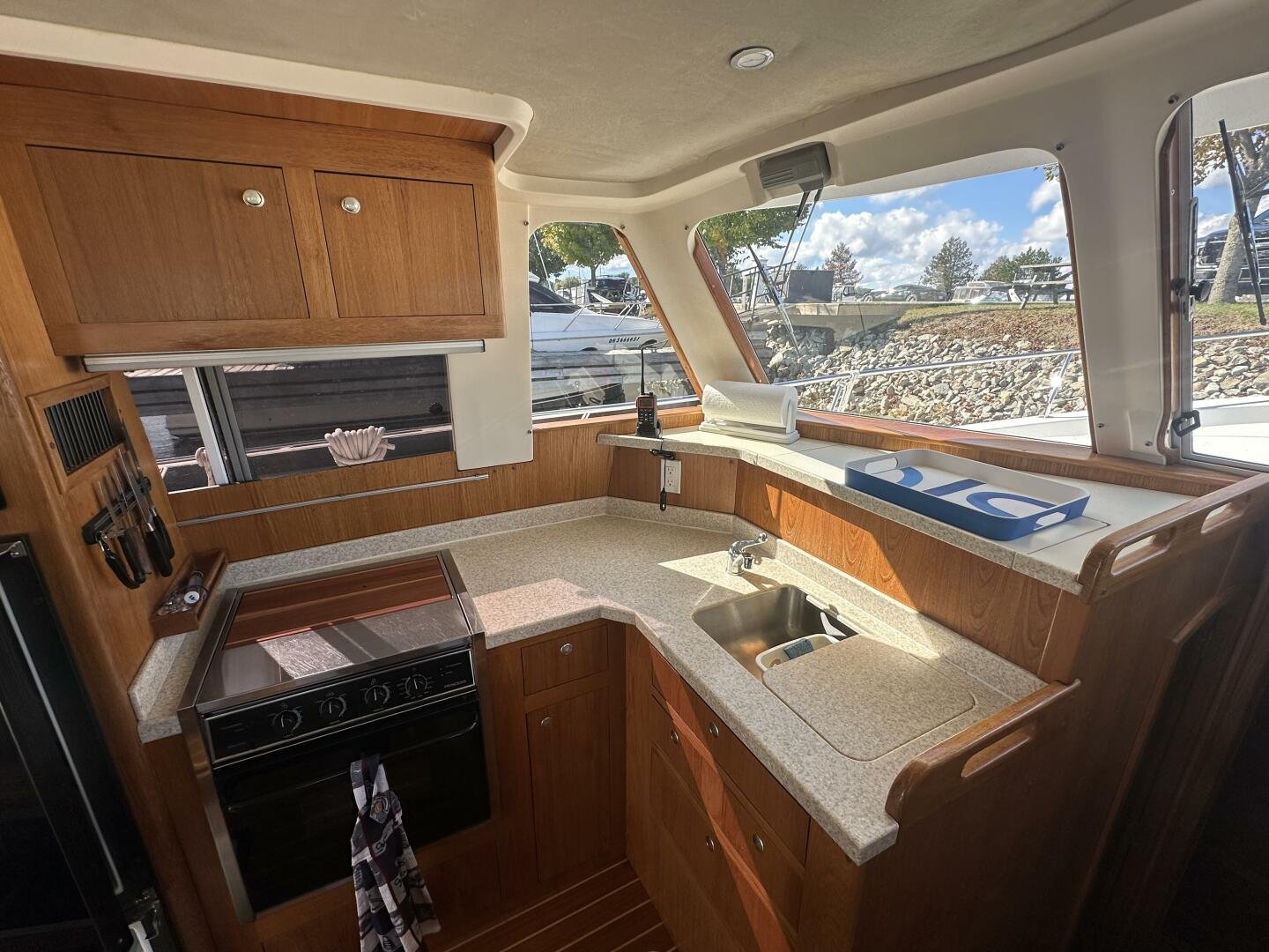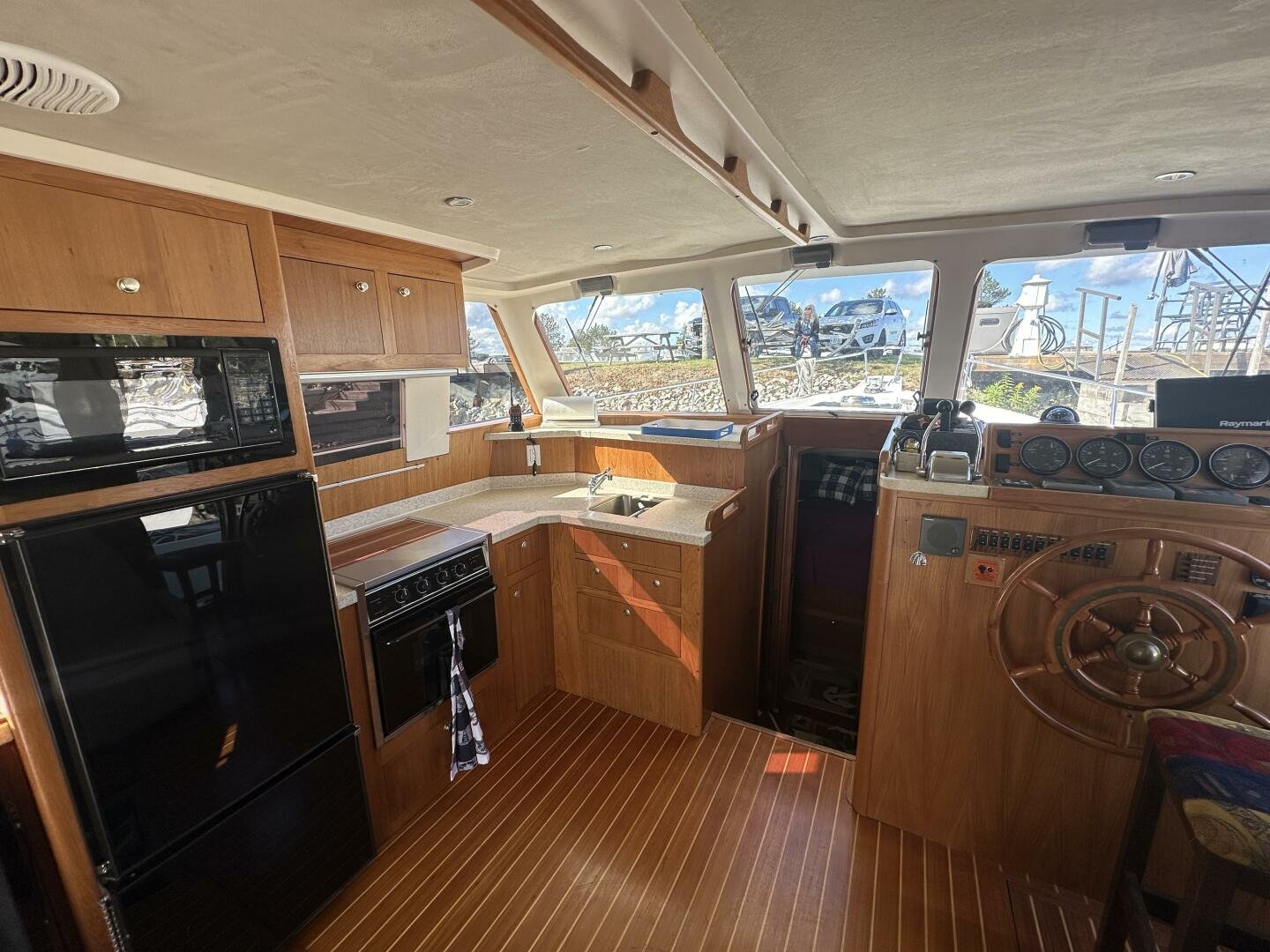 Entering the salon you'll find the television, wine fridge, 3/4 fridge, and L-shaped galley to Port. To Stb there are two recliner chairs and the secondary helm with full electronics.