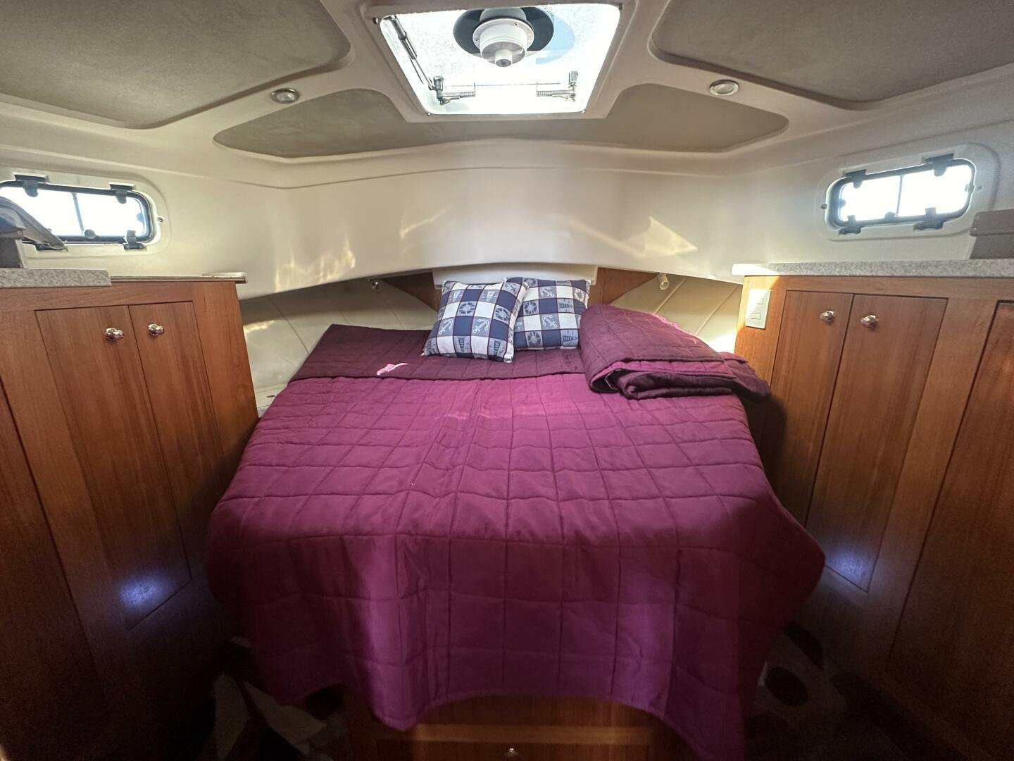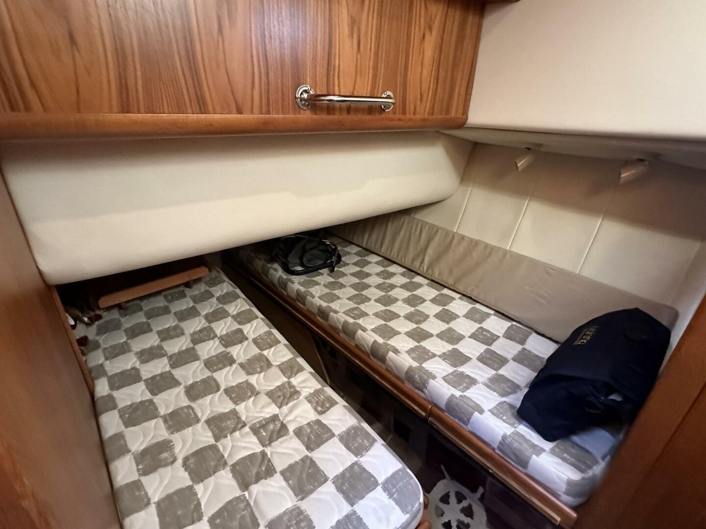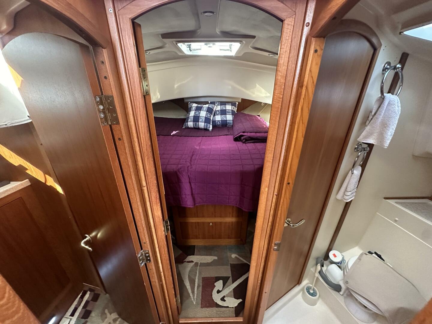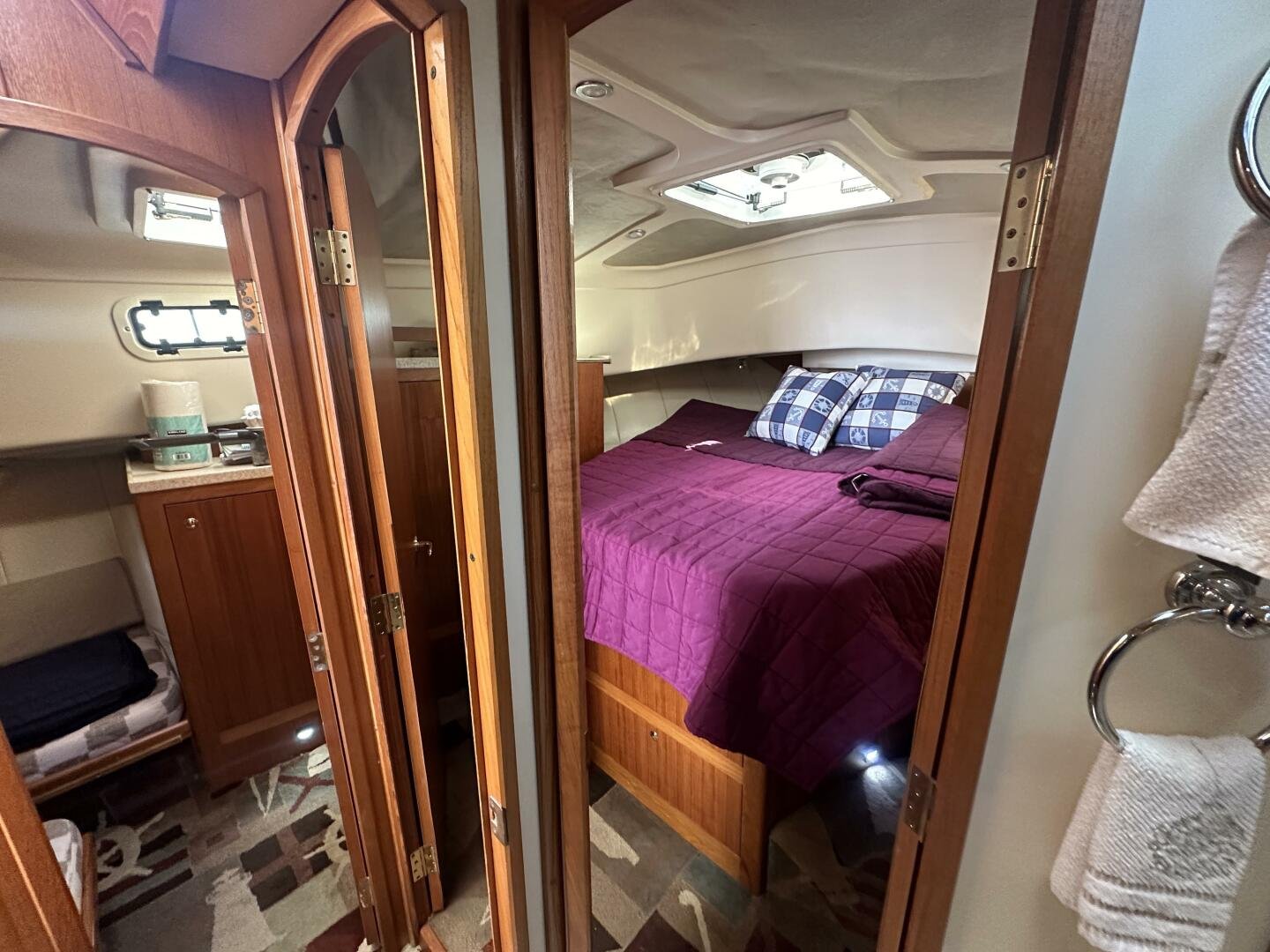Down the companionway the secondary suite features twin singles that convert to a full-size bed, a center-line v-berth with an island bed, and an en-suite head + separate shower with access for day use.