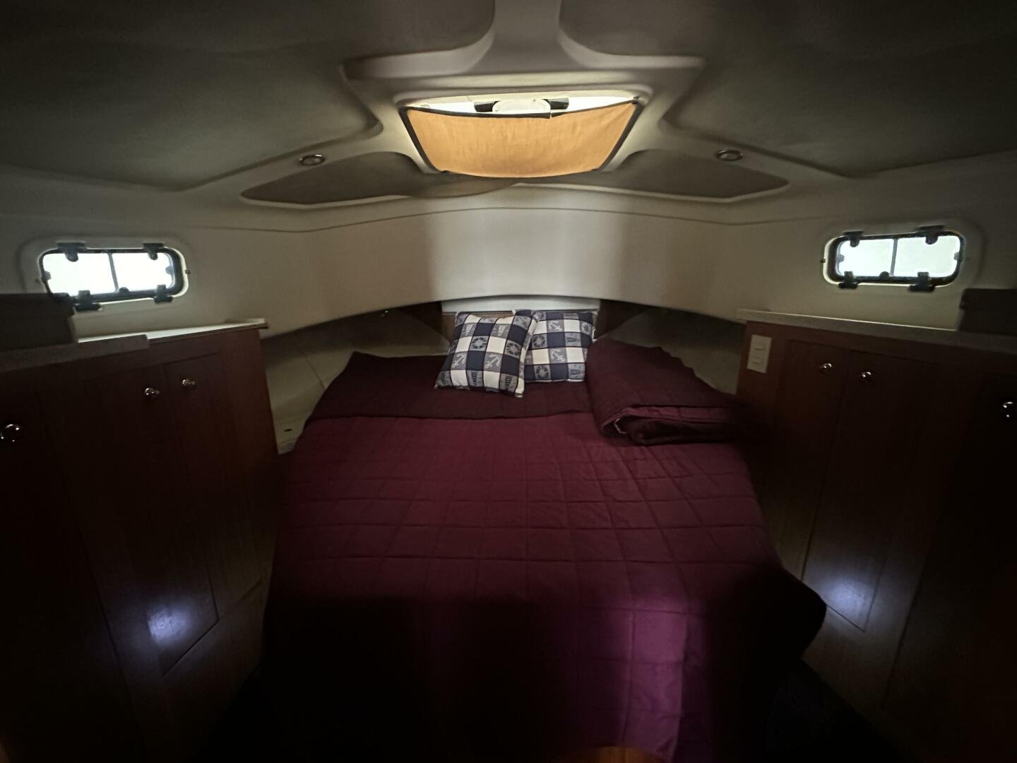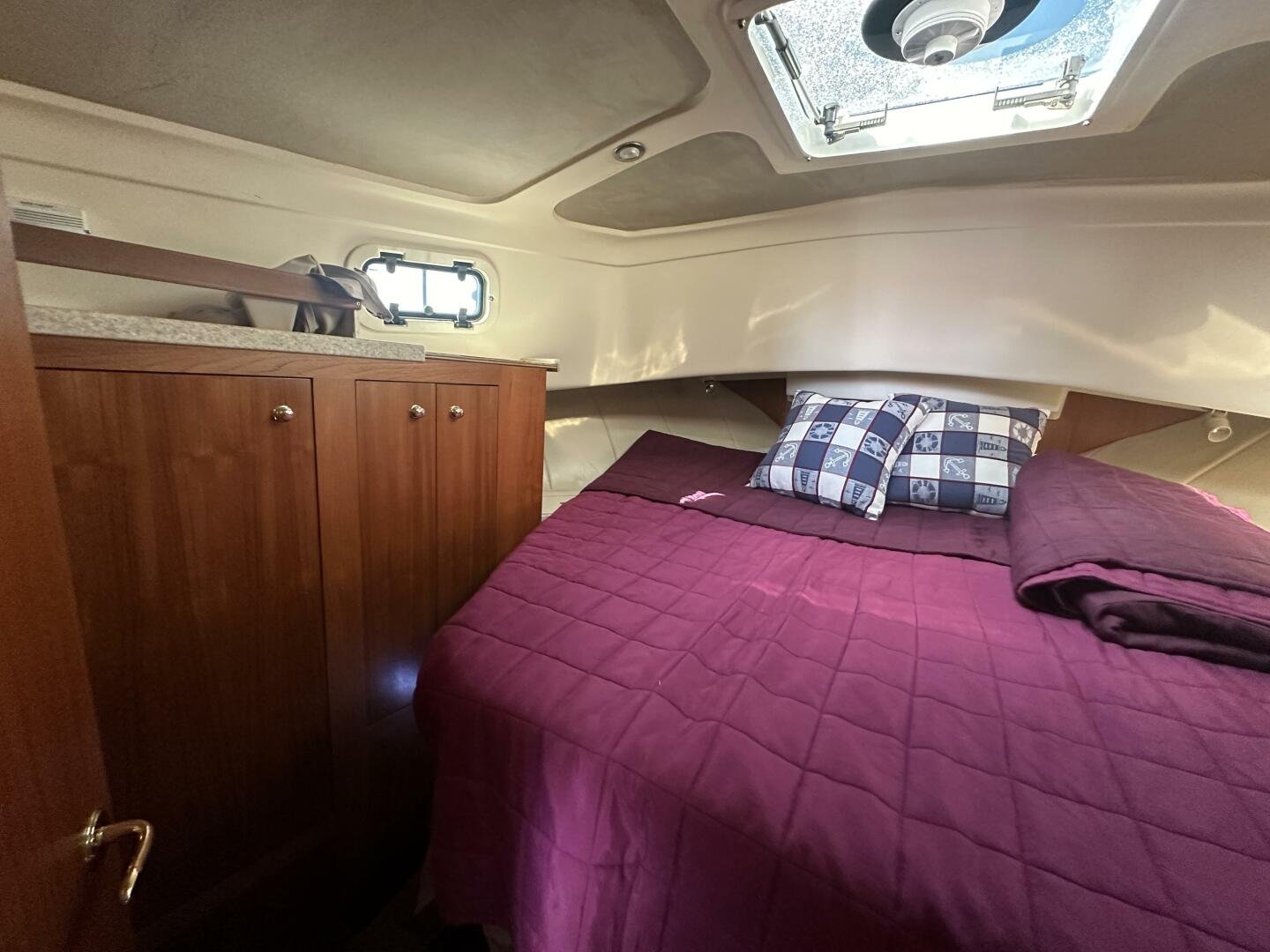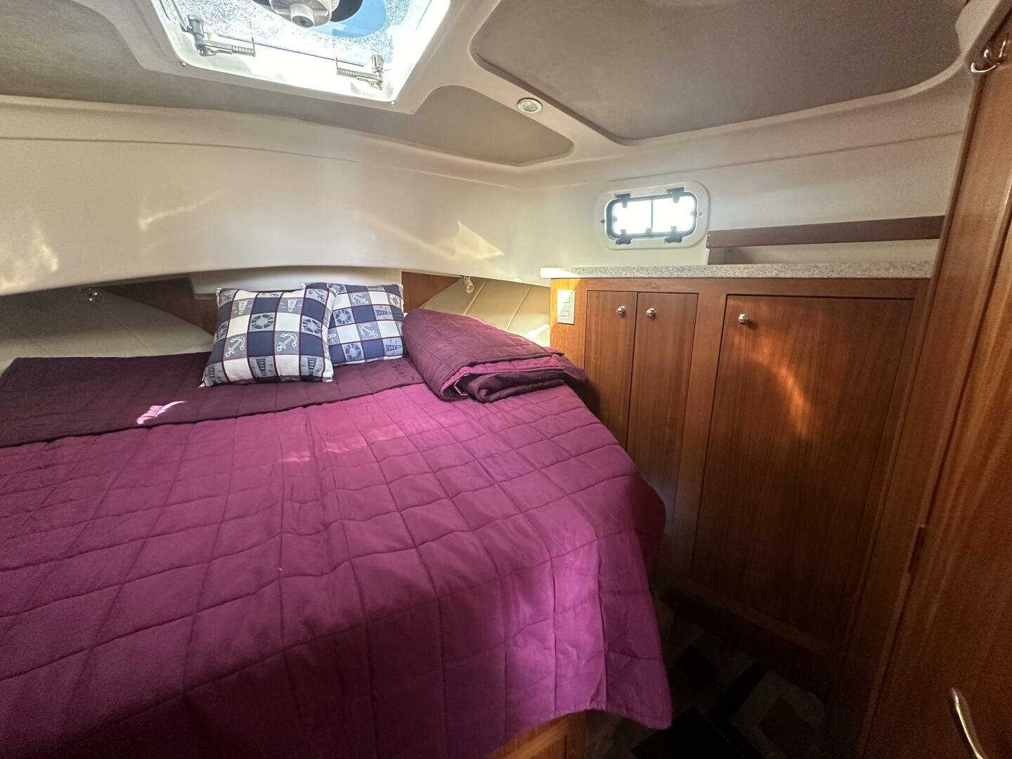 Down the companionway the secondary suite features twin singles that convert to a full-size bed, a center-line v-berth with an island bed, and an en-suite head + separate shower with access for day use.