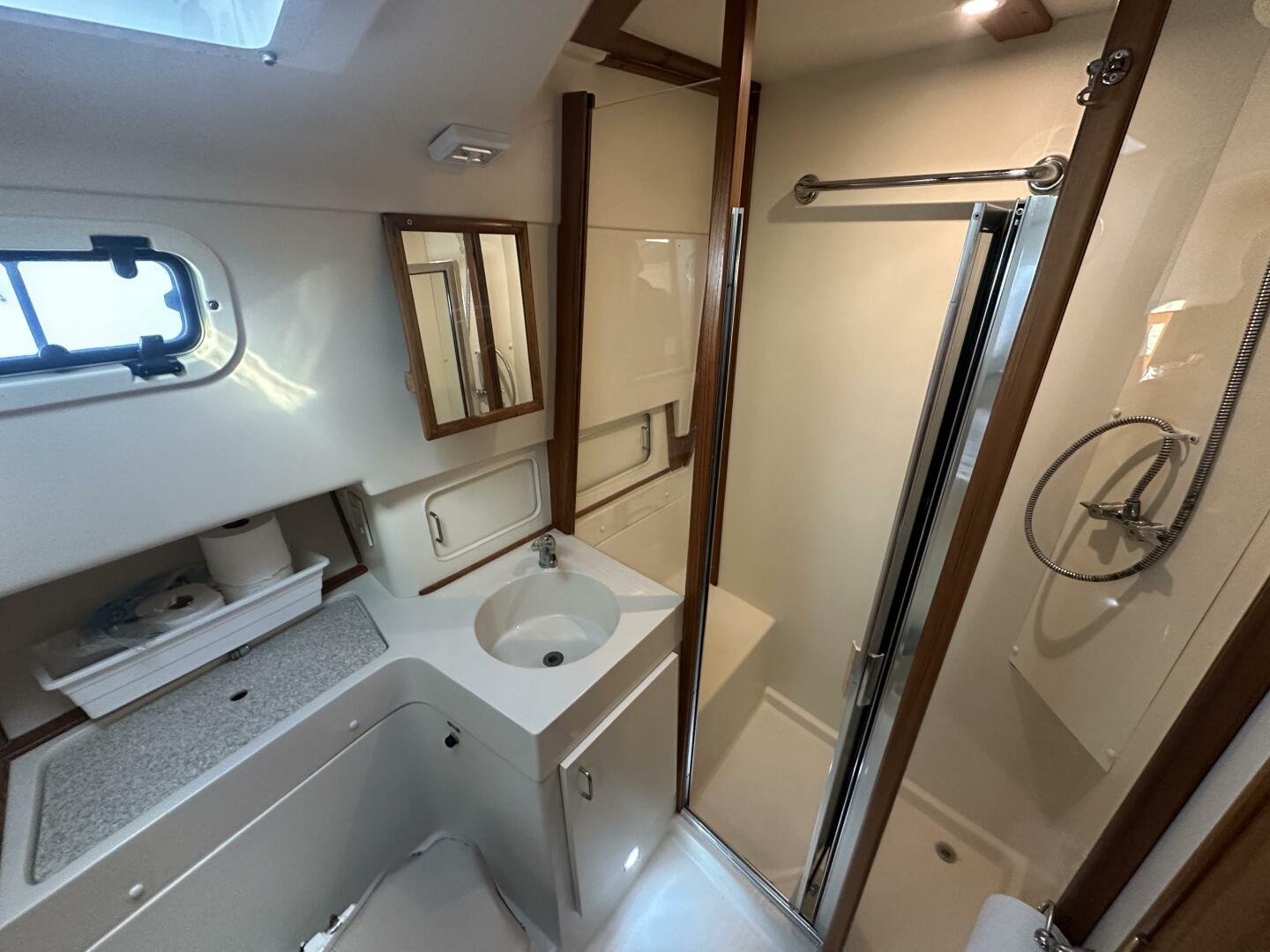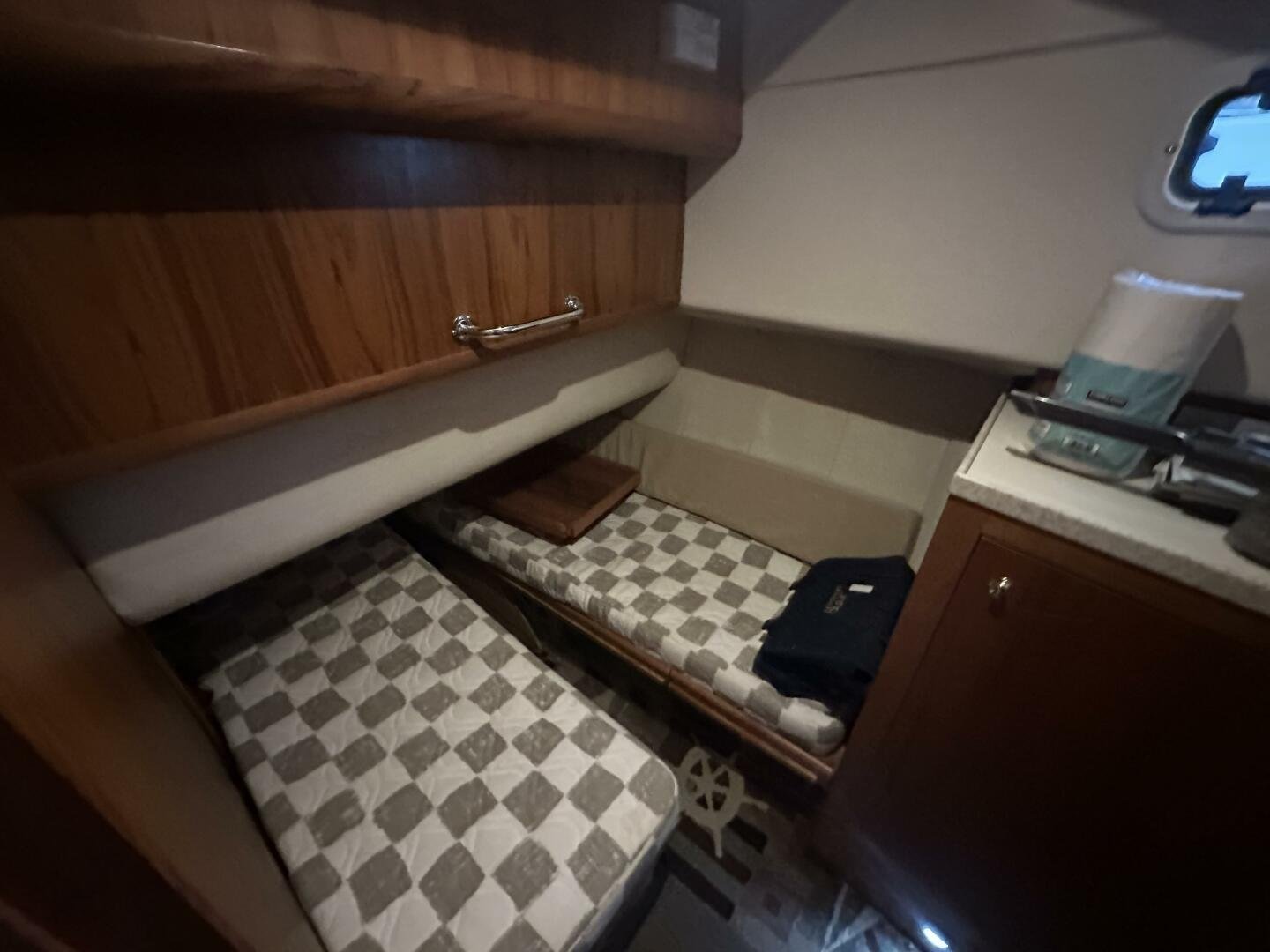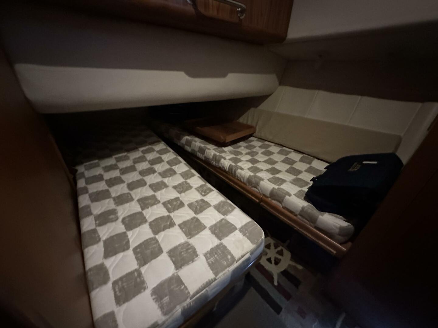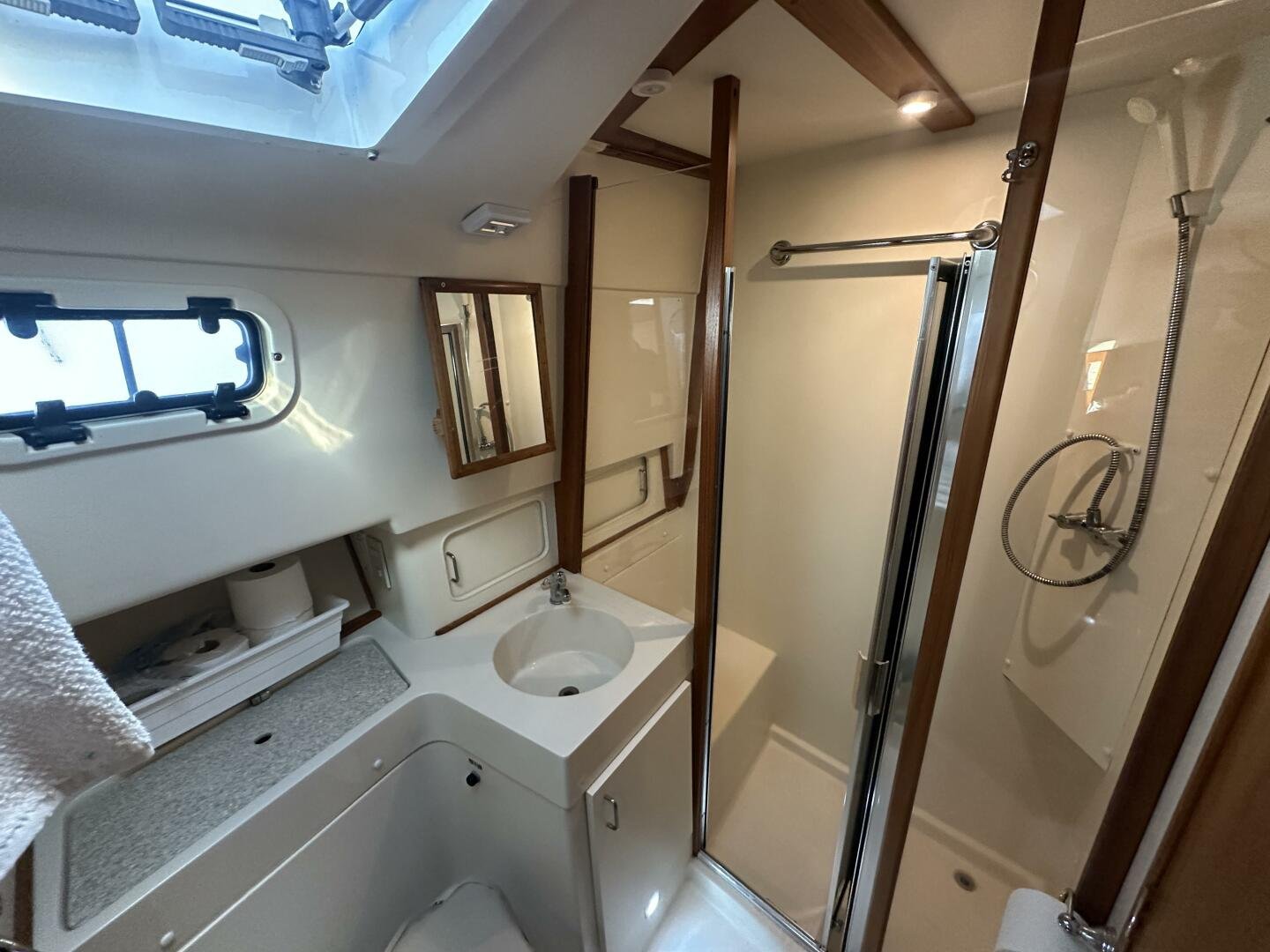 Down the companionway the secondary suite features twin singles that convert to a full-size bed, a center-line v-berth with an island bed, and an en-suite head + separate shower with access for day use.