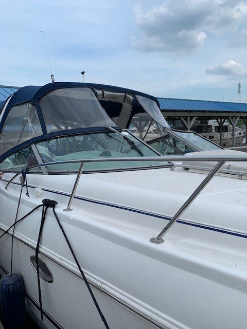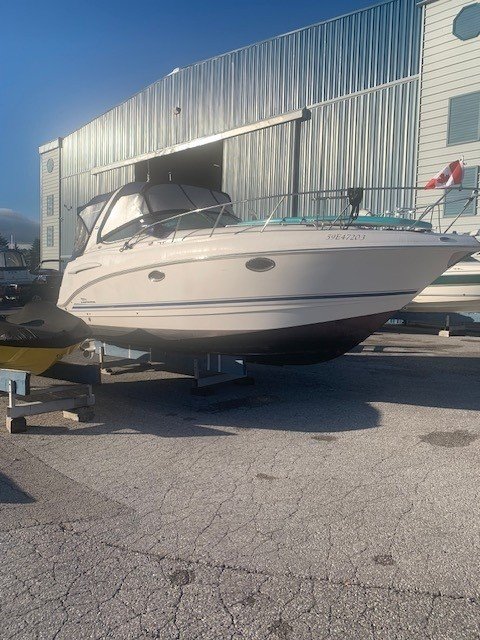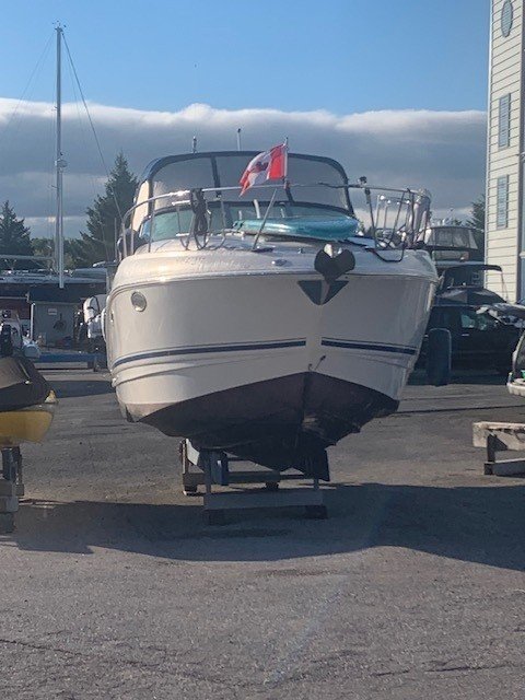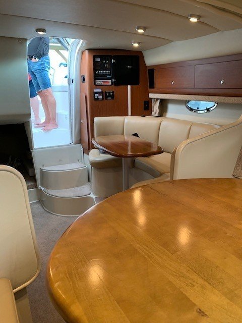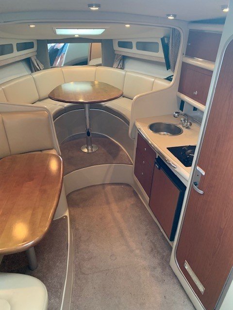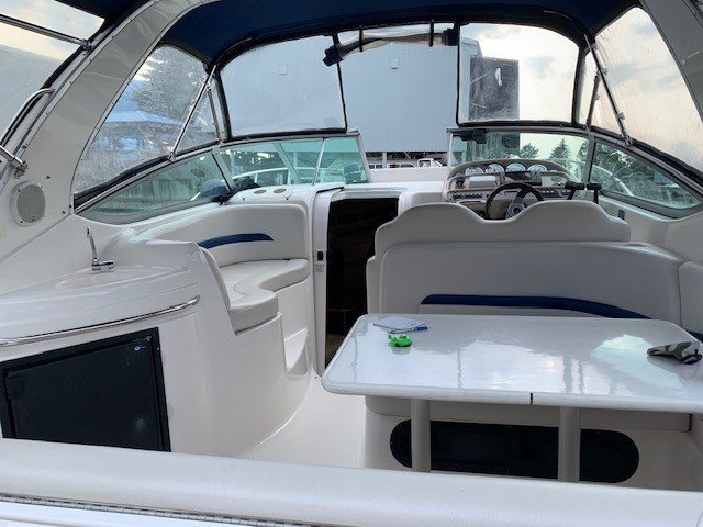 This Chaparral 280 pocket cruiser reflects the brand’s reputation for quality construction and efficient use of space. The 9-foot, 6-inch beam provides a spacious cockpit and a comfortable interior that sleeps six, with a forward V-berth, aft cabin, and convertible dinette. The galley is well equipped, and the head offers generous space for a boat of this size, with privacy curtains separating the sleeping areas.