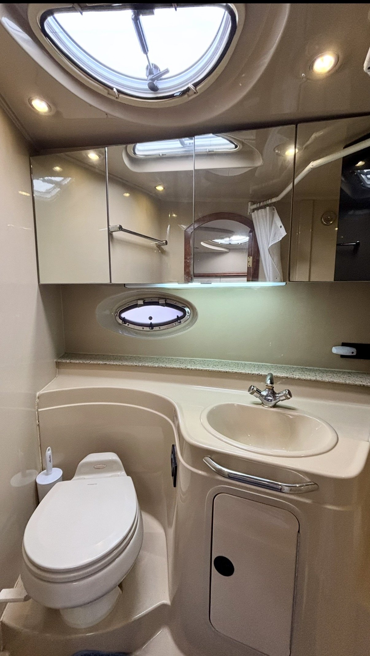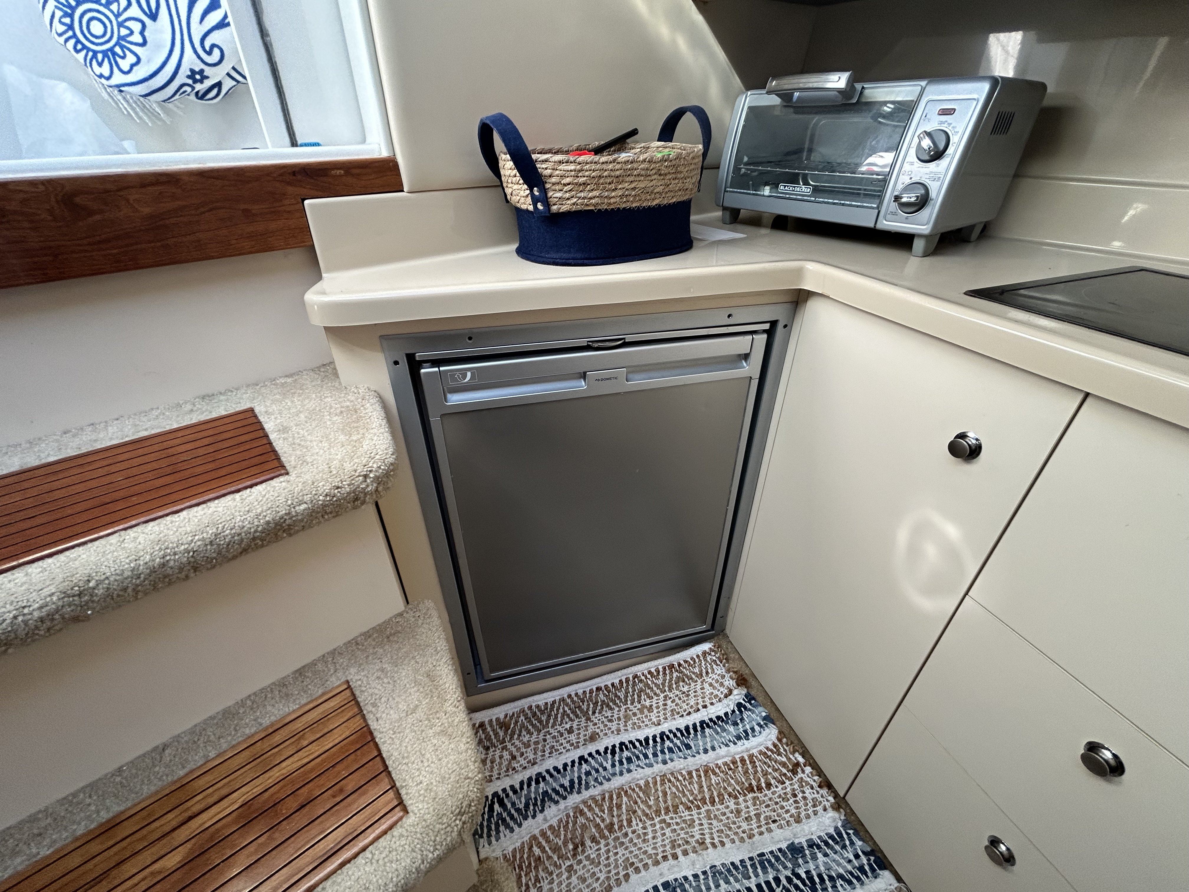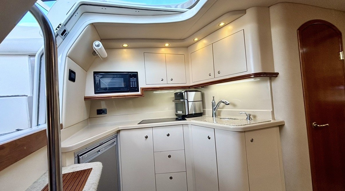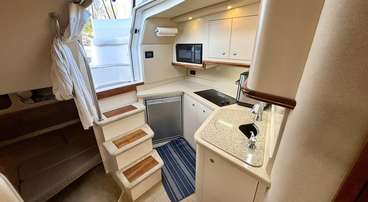 Down below, you find a vacuflush head, with a separate shower. On the Port side is a full galley with tons of counter space, microwave, stove top, fridge, freezer, and sink, with a U-shaped dinette to Starboard.