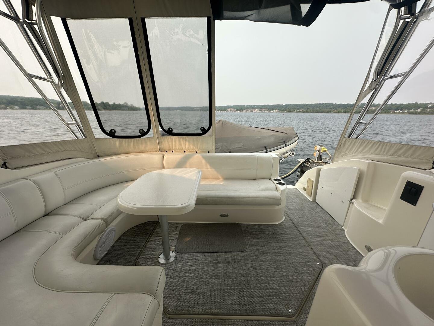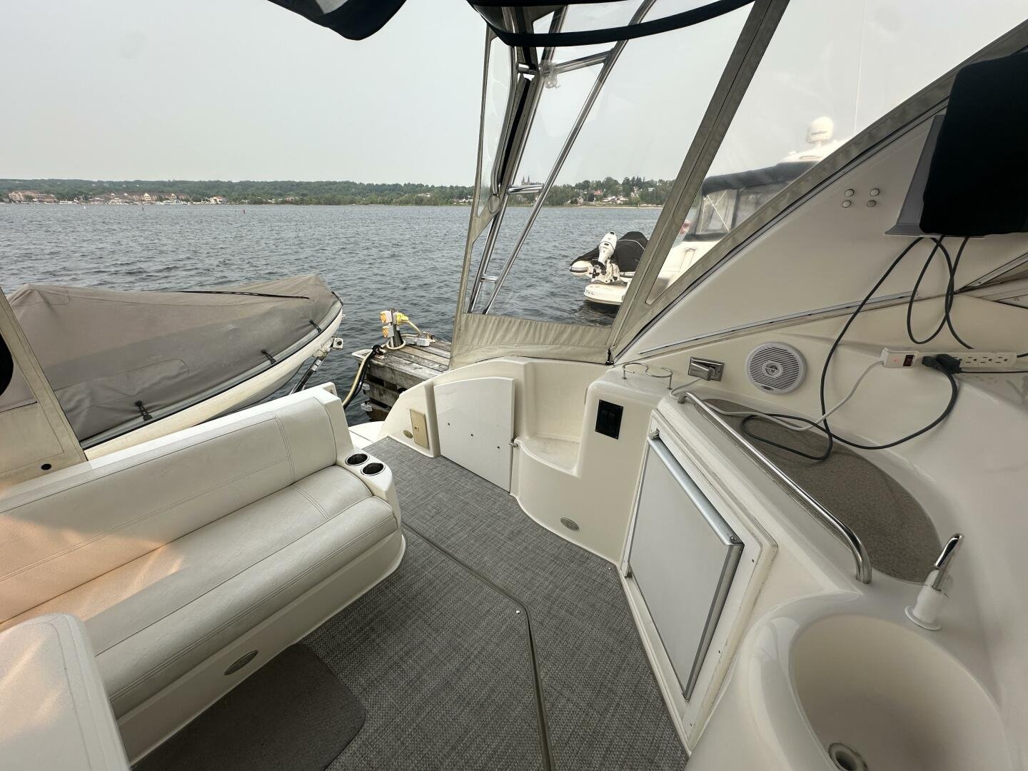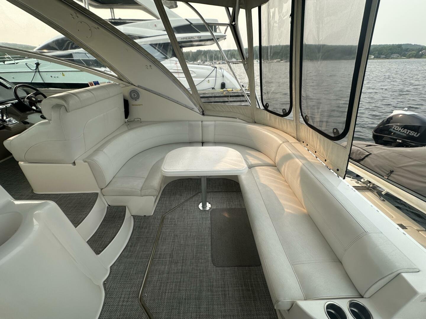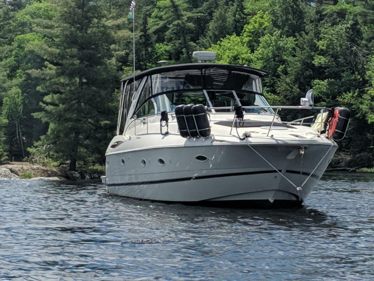 This freshwater example has a large custom aluminum canvas hardtop, fully enclosed by canvas. The cockpit provides ample seating and room for entertaining, with a bar sink and freezer. With the added bow & stern thruster, and windshield walk-through, handling this boat at the dock is a dream. The interior layout is spacious with a well-appointed galley, day head, and private forward stateroom with a separate head and shower. The vessel is also equipped with 800W in solar with a 2800W inverter, paired with 6x 428AH 6V Rolls batteries.