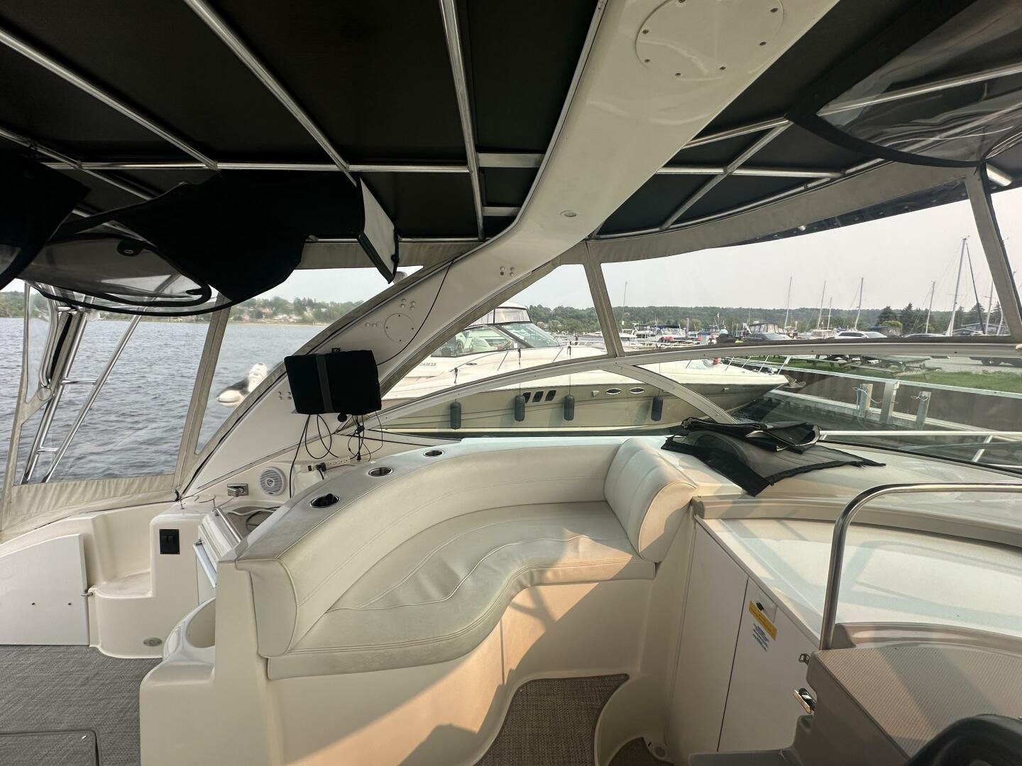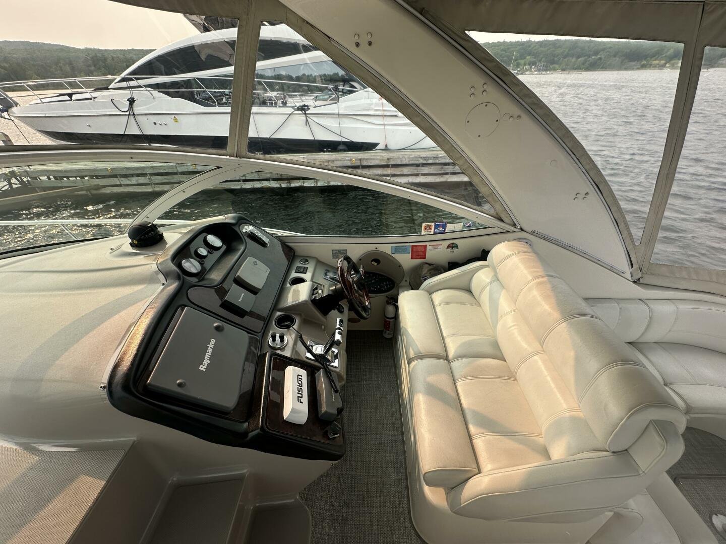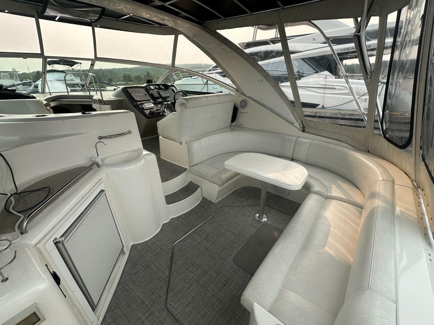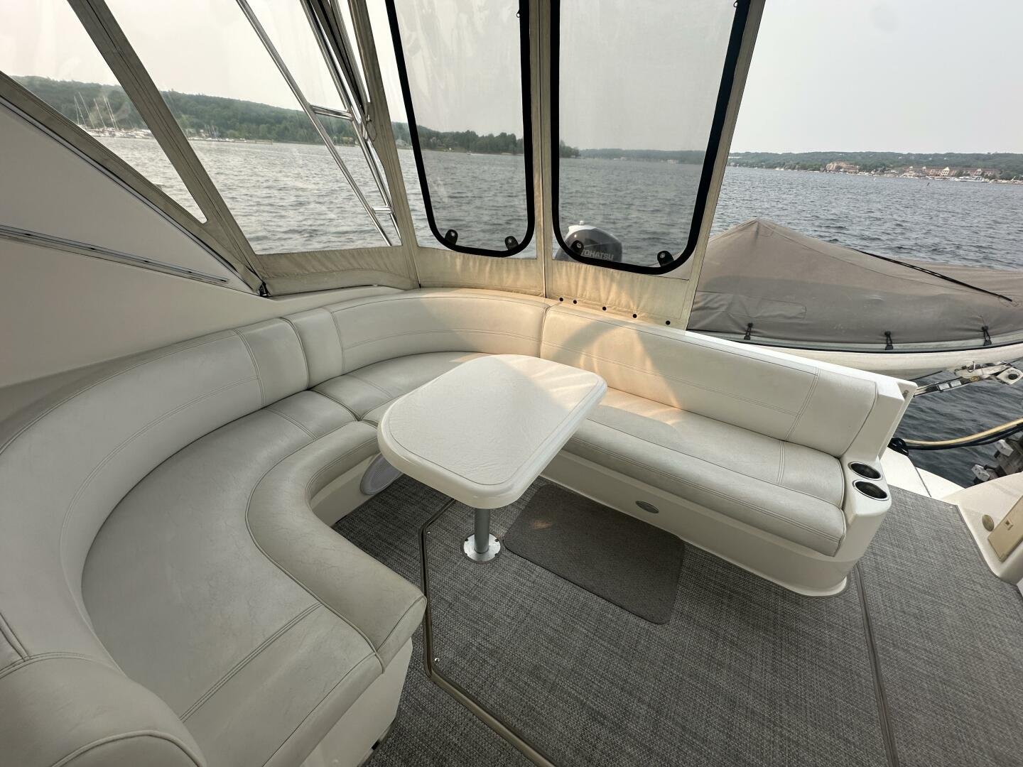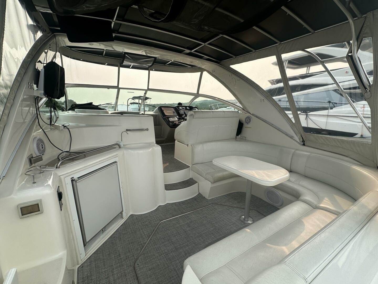 This freshwater example has a large custom aluminum canvas hardtop, fully enclosed by canvas. The cockpit provides ample seating and room for entertaining, with a bar sink and freezer. With the added bow & stern thruster, and windshield walk-through, handling this boat at the dock is a dream. The interior layout is spacious with a well-appointed galley, day head, and private forward stateroom with a separate head and shower. The vessel is also equipped with 800W in solar with a 2800W inverter, paired with 6x 428AH 6V Rolls batteries.