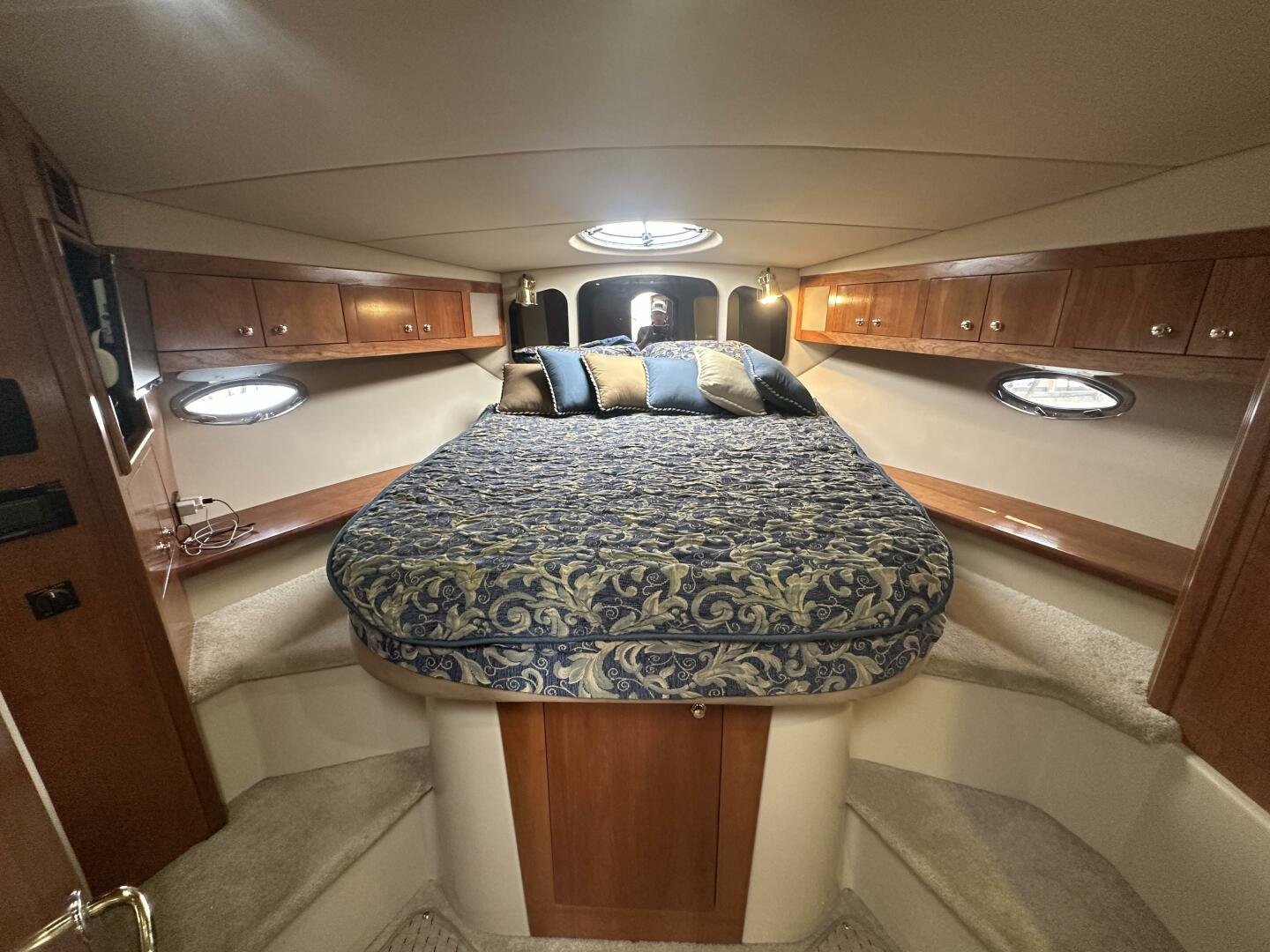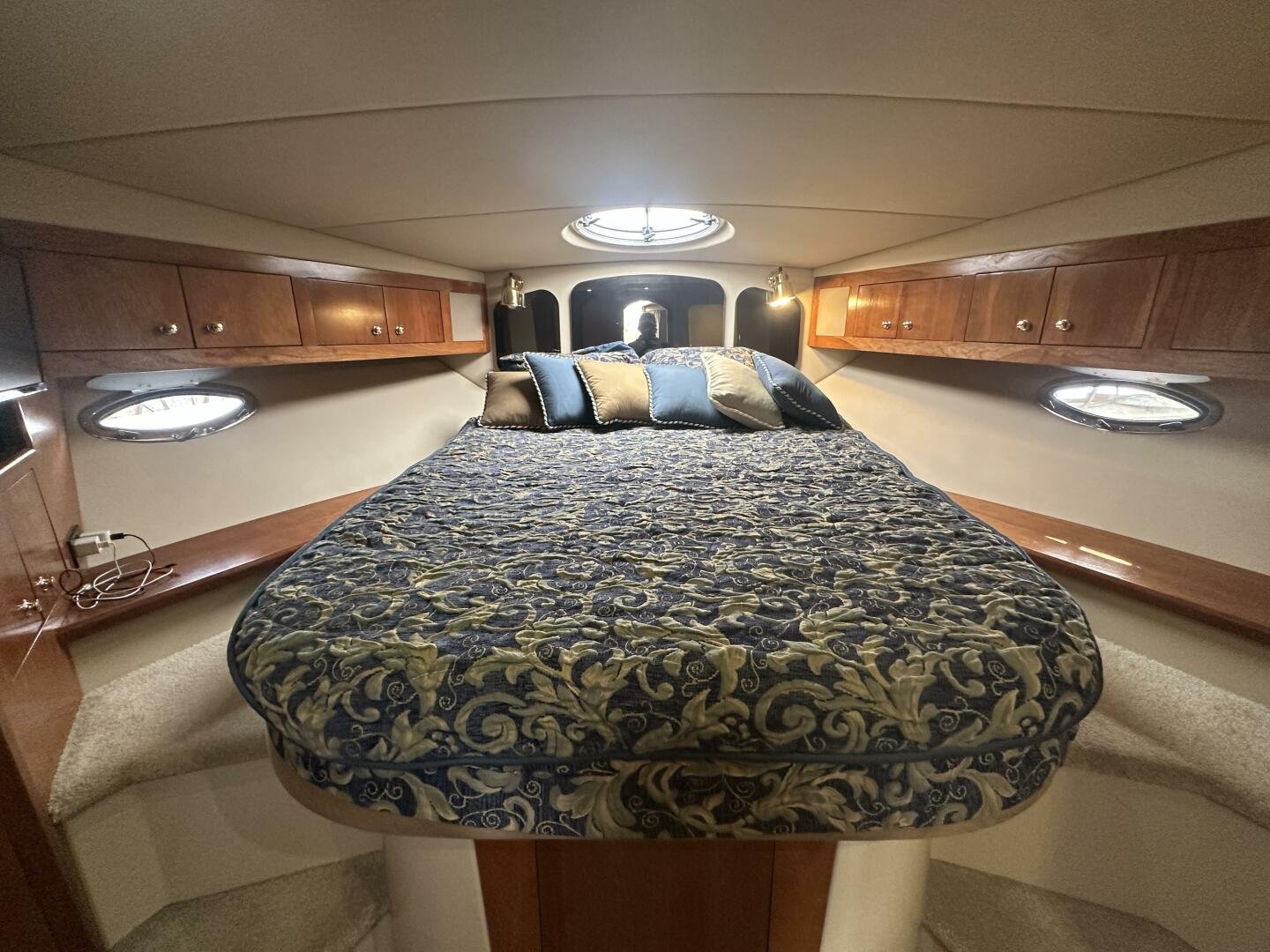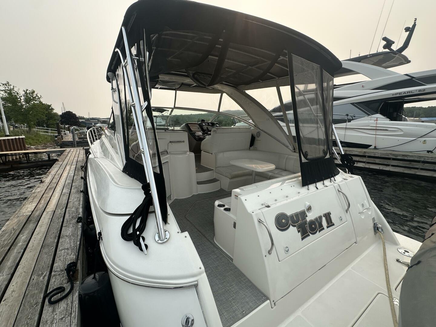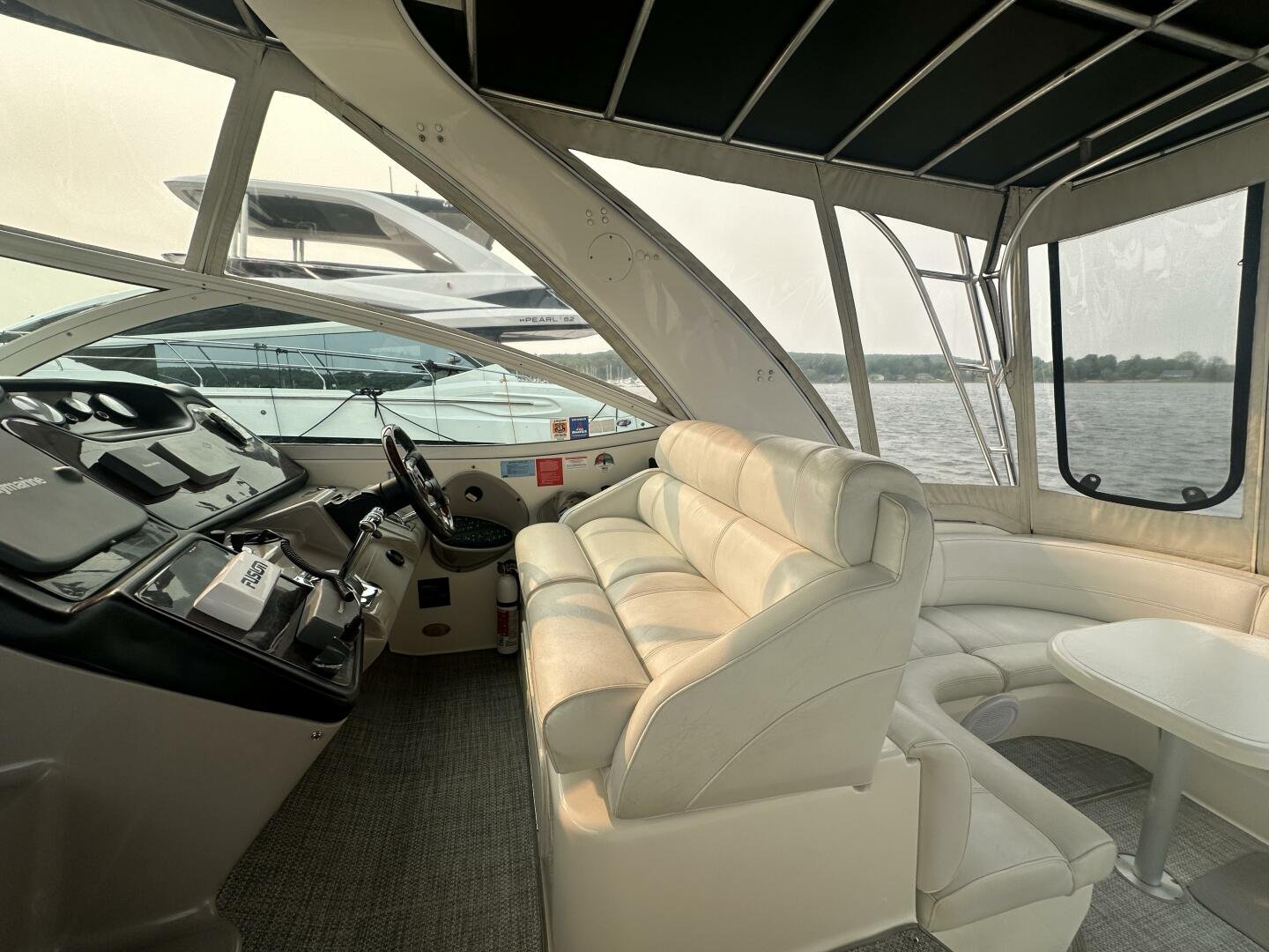 This freshwater example has a large custom aluminum canvas hardtop, fully enclosed by canvas. The cockpit provides ample seating and room for entertaining, with a bar sink and freezer. With the added bow & stern thruster, and windshield walk-through, handling this boat at the dock is a dream. The interior layout is spacious with a well-appointed galley, day head, and private forward stateroom with a separate head and shower. The vessel is also equipped with 800W in solar with a 2800W inverter, paired with 6x 428AH 6V Rolls batteries.