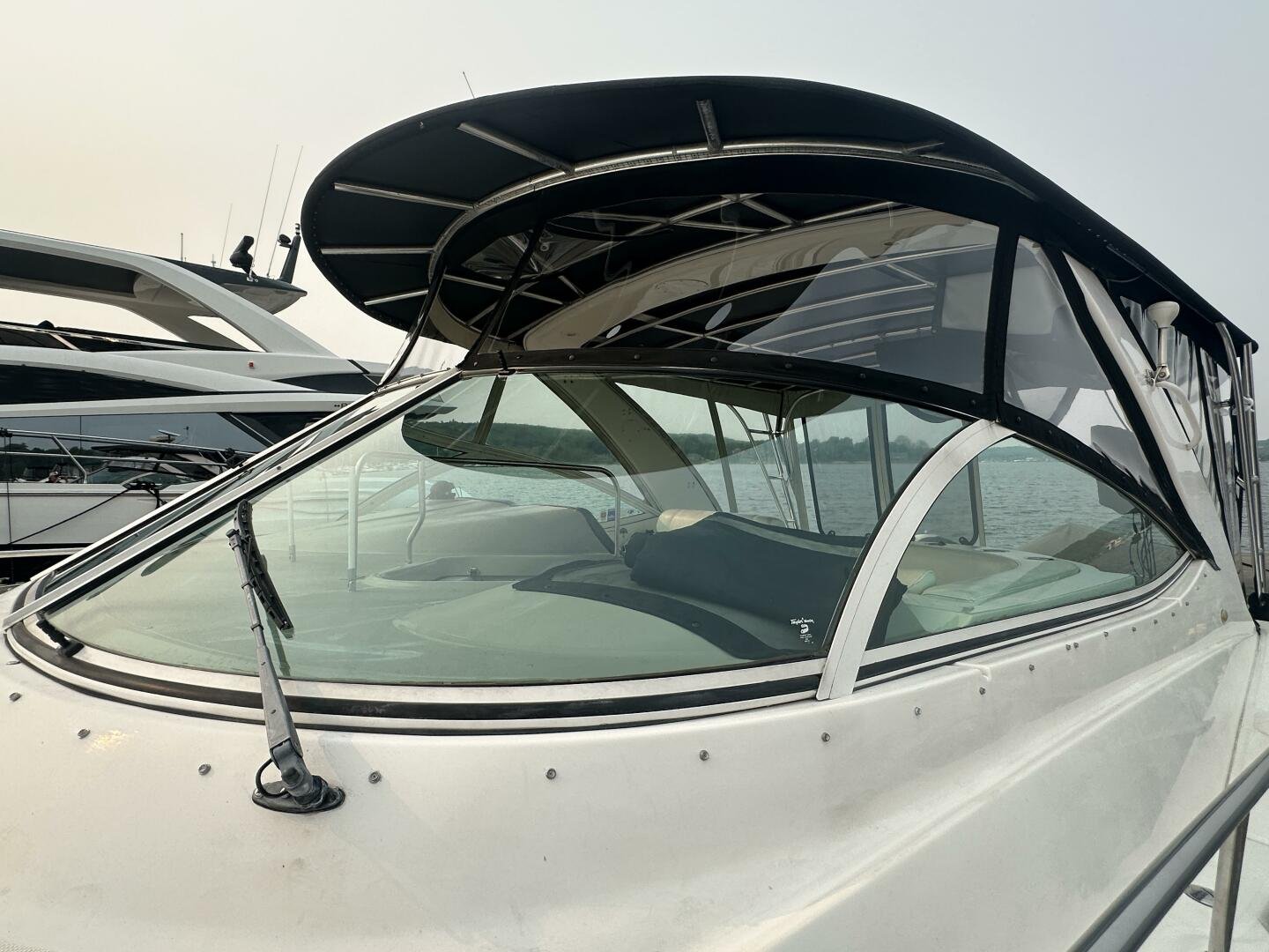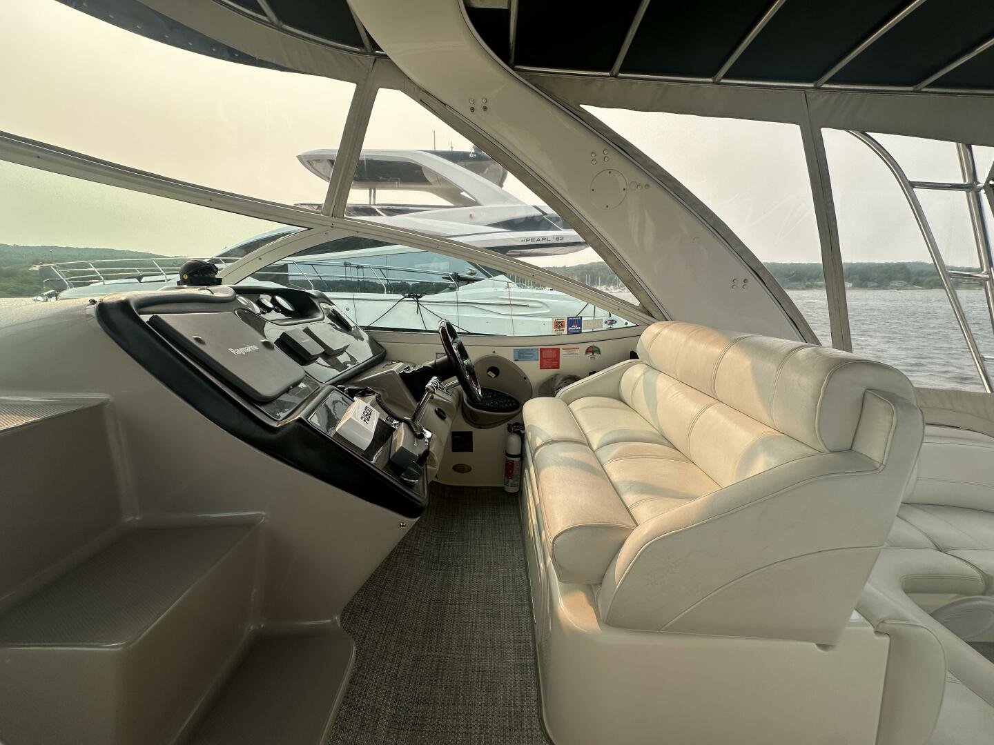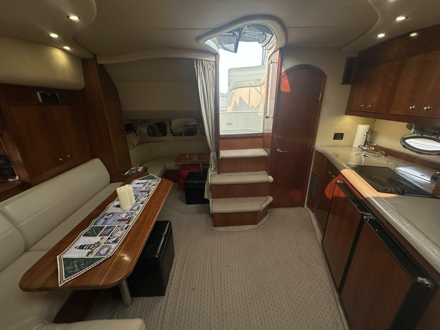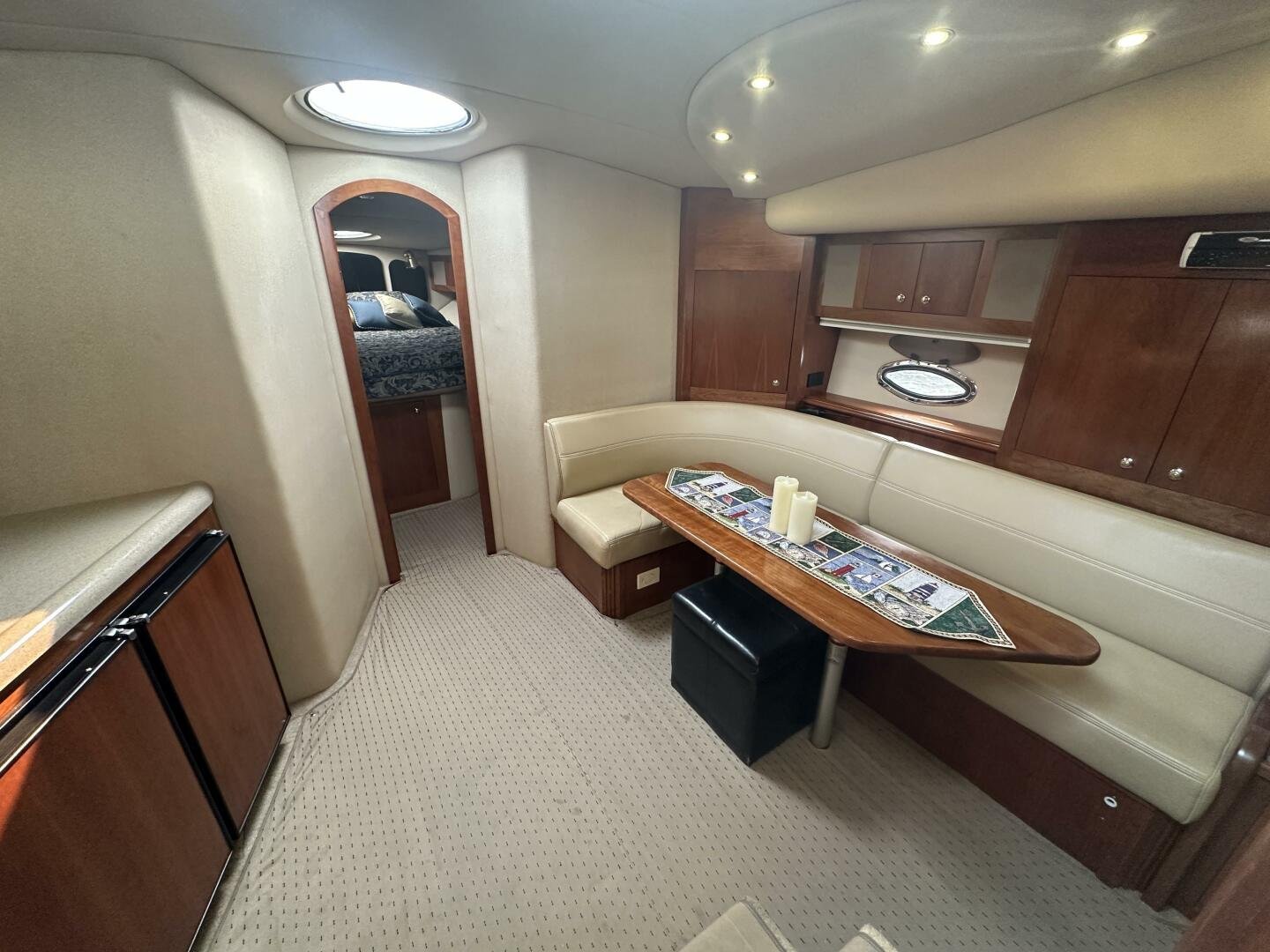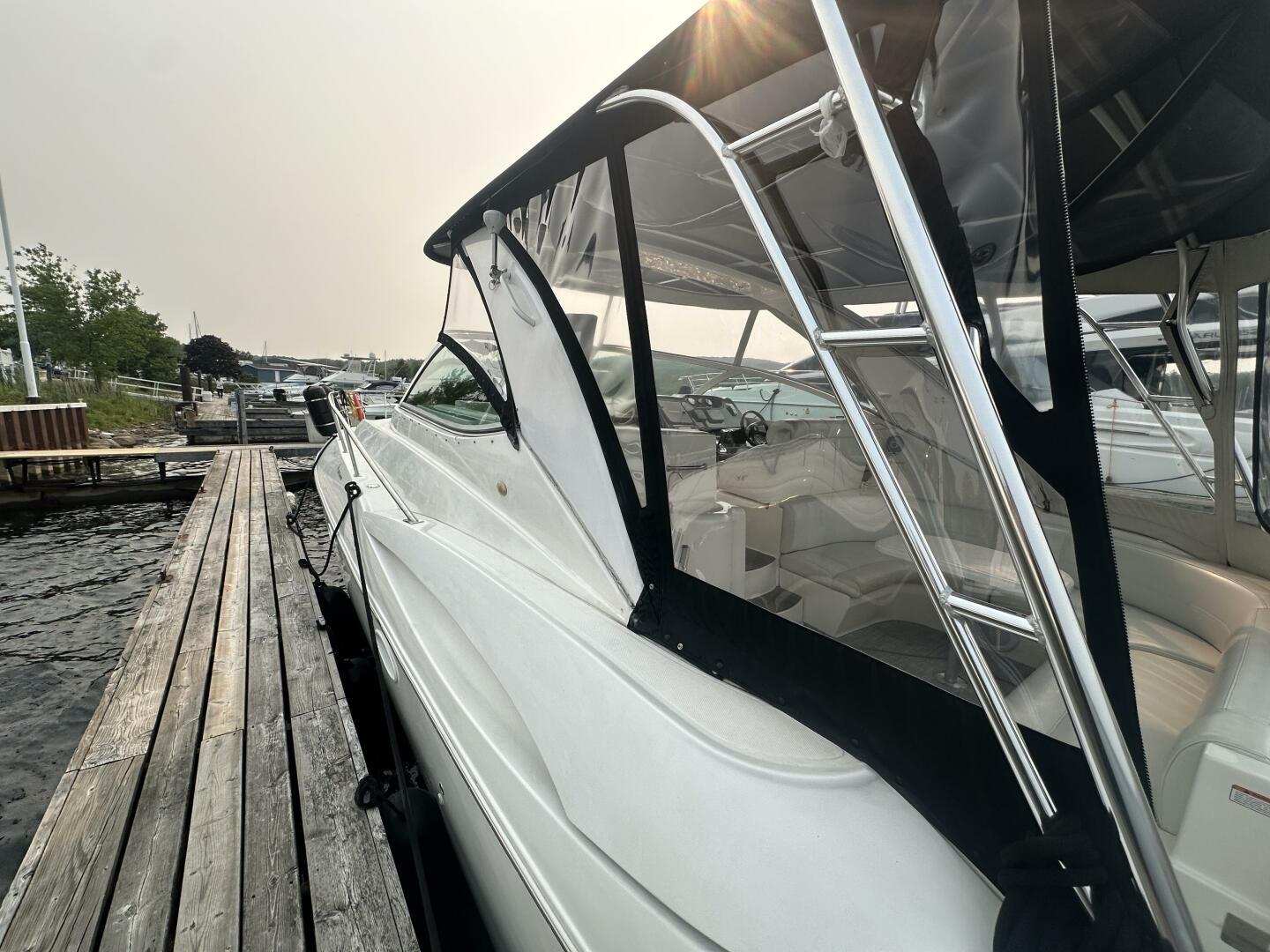 This freshwater example has a large custom aluminum canvas hardtop, fully enclosed by canvas. The cockpit provides ample seating and room for entertaining, with a bar sink and freezer. With the added bow & stern thruster, and windshield walk-through, handling this boat at the dock is a dream. The interior layout is spacious with a well-appointed galley, day head, and private forward stateroom with a separate head and shower. The vessel is also equipped with 800W in solar with a 2800W inverter, paired with 6x 428AH 6V Rolls batteries.