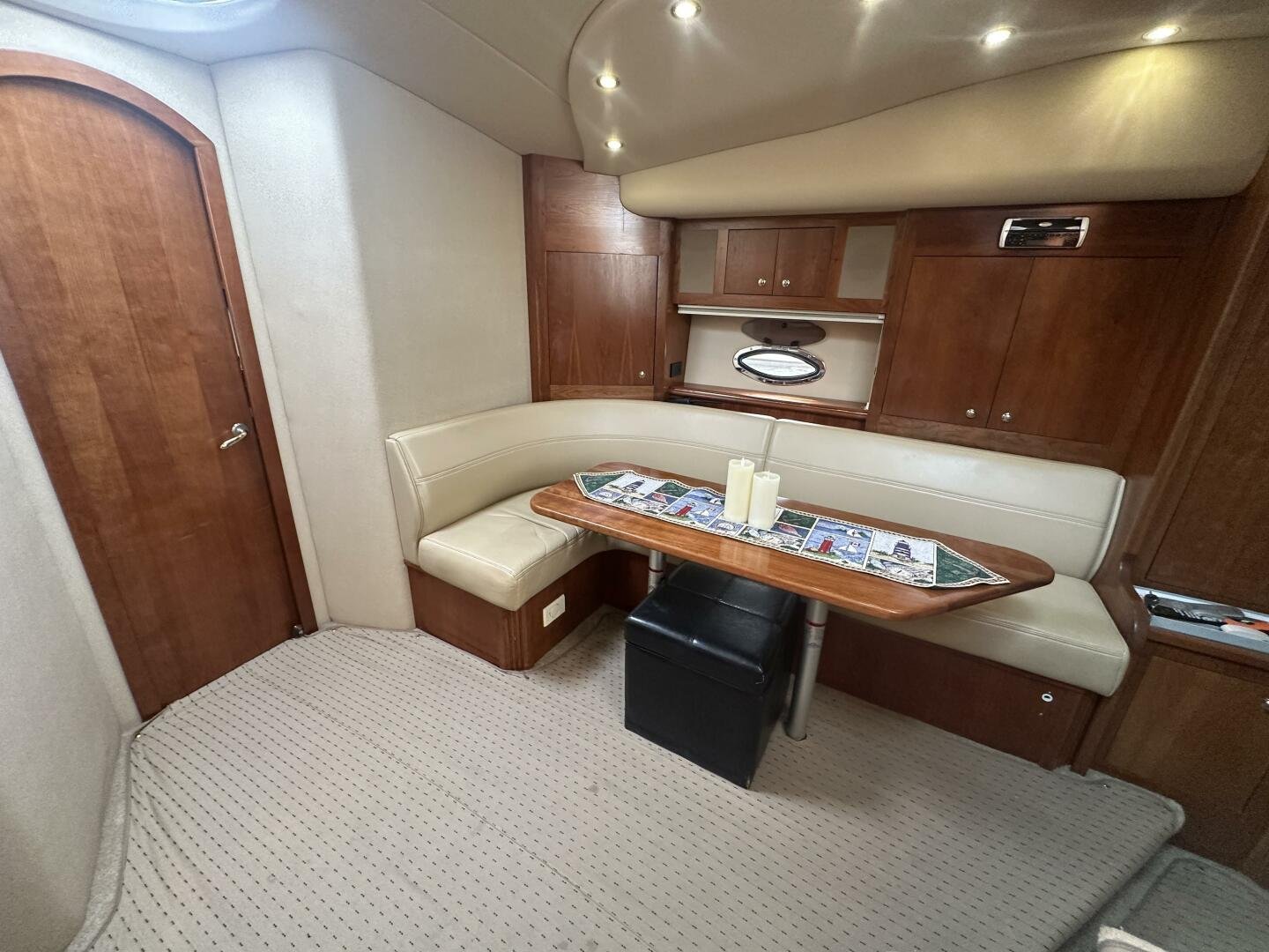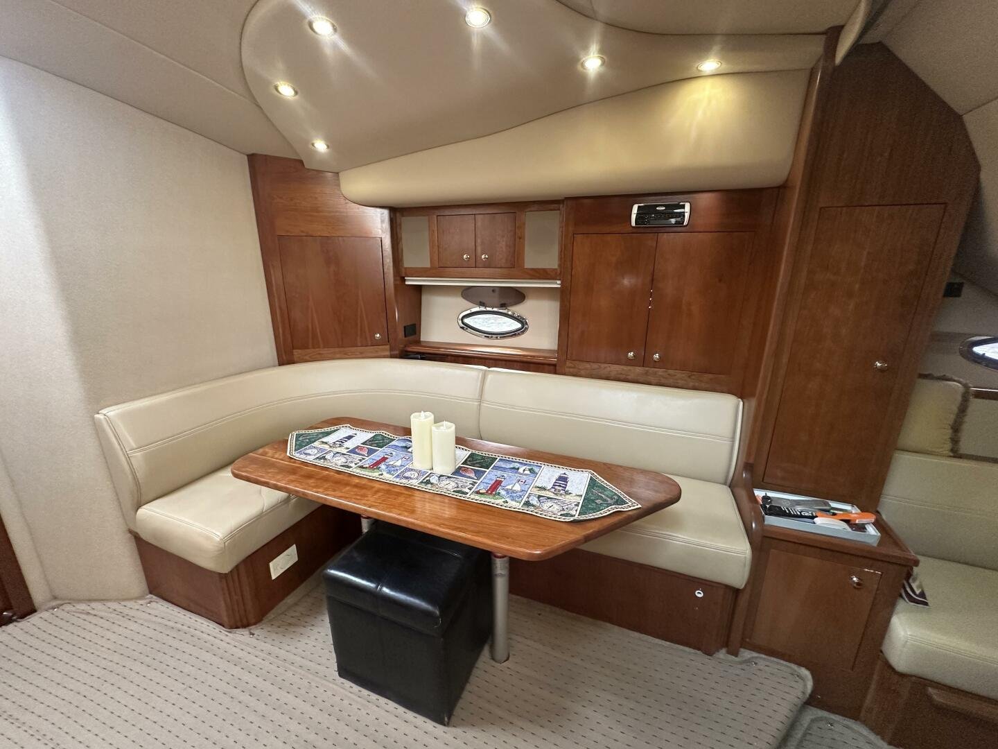 The Cruisers 3970 Express is perfect for enjoying quality time on the water with friends and family. From the double helm seat and companion helm lounge to the large wrap-around cockpit seating aft, all on board will have plenty of space to stretch out and enjoy the ride. She also offers convenient foredeck access with a cabin walk-around and molded-in steps to a walk-through windshield.The standard integrated swim platform, sunlounge / table, cockpit shower and cockpit refrigerator / ice maker will be welcome amenities on warm summer days. Below deck, the roomy salon area features a crescent-shaped convertible dinette / sofa, a ventilated skylight with screens. The full-service galley has all the appointments necessary for liveaboard cruising, offering a large refrigerator/freezer, a microwave oven and plenty of workspace and storage. The forward stateroom area incorporates a large island berth with easy access from either side, spacious lockers and a ventilated skylight with screens. The shower compartment is separate from the head; they occupy spaces opposite one another just aft of the forward stateroom, which also has private access to the head compartment. The primary layout features a comfortable sofa / sleeper in its amidship cabin area, lending to the open feel of the salon. A second head lies just to port of the settee, with a sink and vanity located outside the head compartment door for increased convenience if overnight guests will be using this space as overnight accommodations. A privacy curtain provides additional privacy.