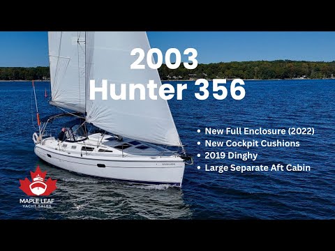 NEW FULL ENCLOSURE, COCKPIT CUSHIONS, LARGE AFT CABIN, GARMIN CHART PLOTTER, 2019 DINGY, SHOAL DRAFT, READY TO CRUISE. This 2003 Hunter 356 is a 35′6″ cruising sailboat with a 12′ beam and 5' draft. It also features Hunters proven fractional “B&R” style rig for easier sail handling. Below deck you’ll find comfortable accommodations for family or guests: with two private cabins, a convertible salon berth, full galley, and decent tankage for extended weekends or cruising. On deck, the layout emphasizes ease: all control lines led aft, a spacious cockpit, and a walk‑through transom with swim platform make it a friendly boat for cruising, sailing, and just relaxing at anchor or at the dock. In short: The Hunter 356 offers a strong blend of comfort, ease of handling, and cruising capability.