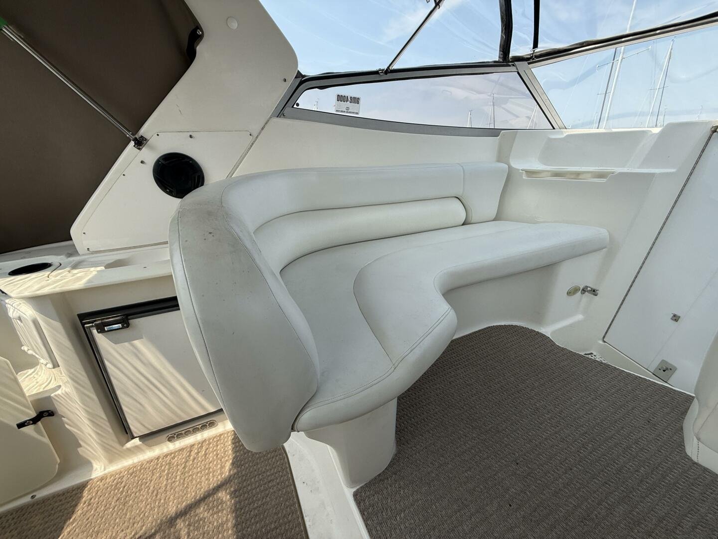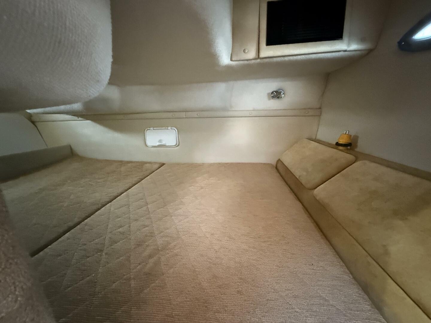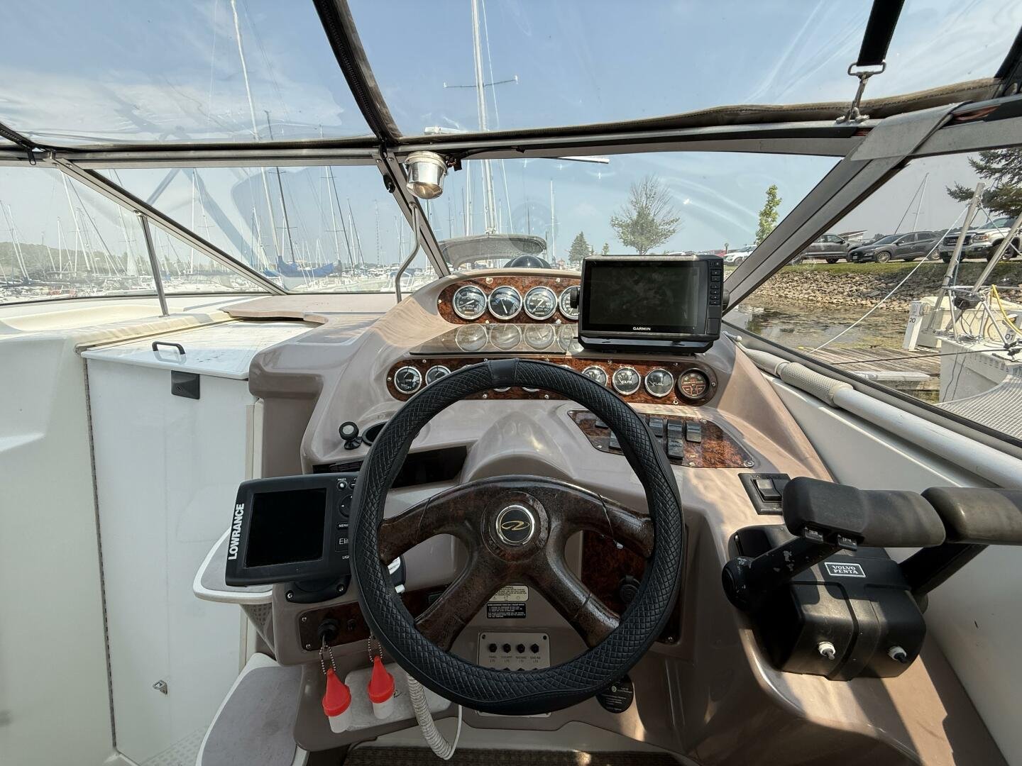 Maxi-volume express cruiser with innovative topside seating is versatile, stylish, agile. Broad 9'11" beam allows for spacious interior with large head, cherry cabinetry, berths for six. Refrigerator under forward berth allows storage space under galley counter. Pivoting helm seat, aft L-shaped lounge with removable table, foldaway aft settee maximize cockpit space. Note walk-through windshield, performance-enhancing stepped hull.