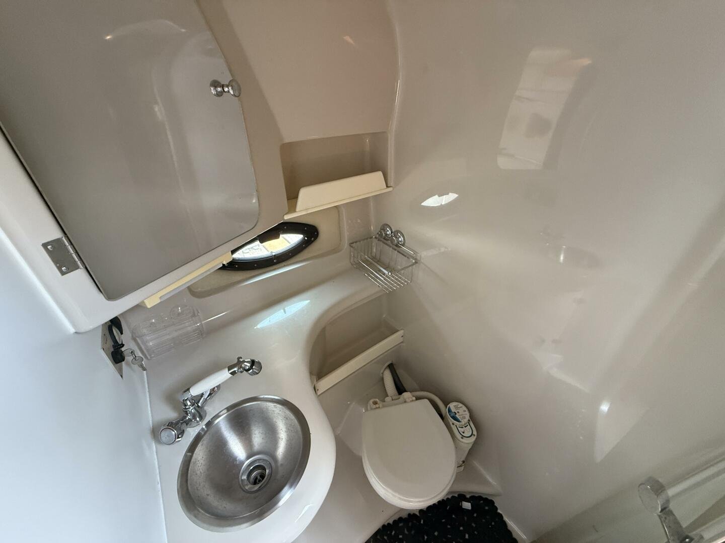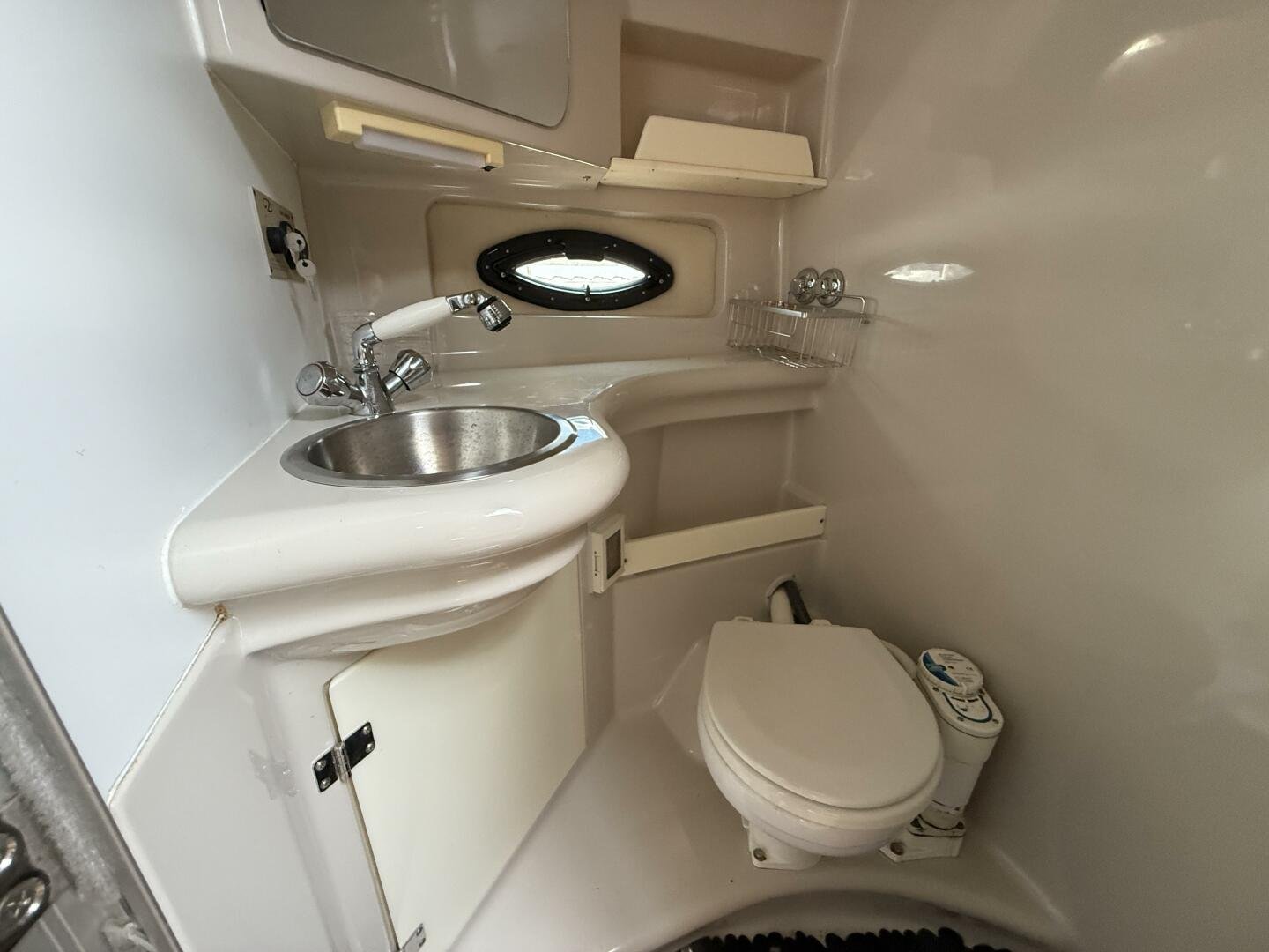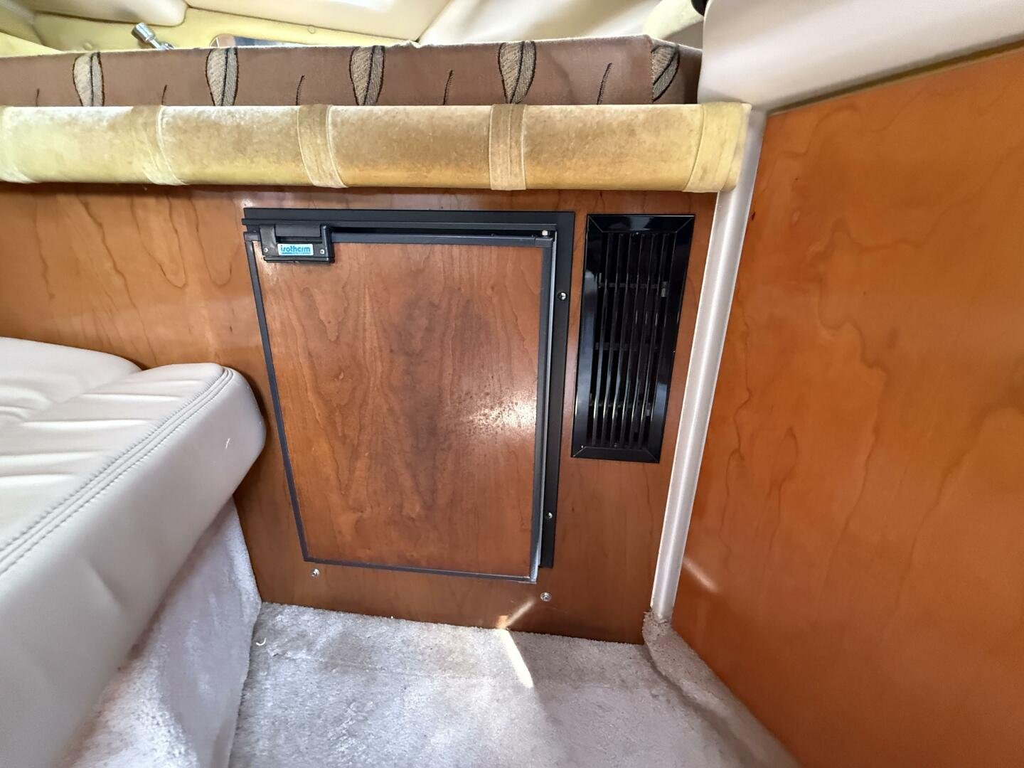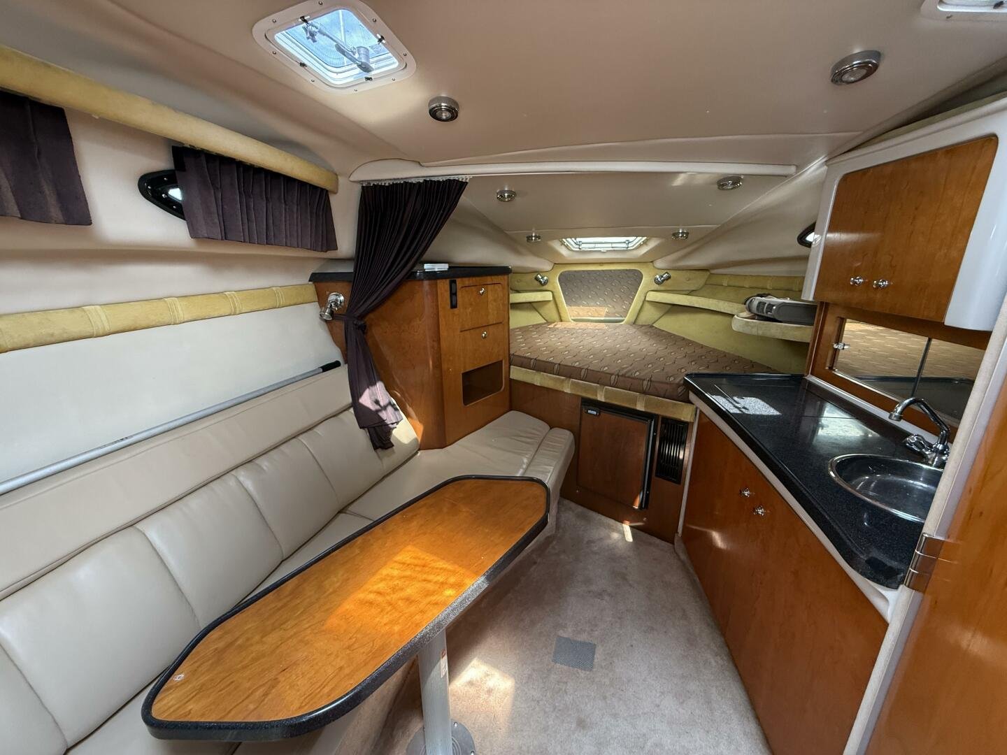 Maxi-volume express cruiser with innovative topside seating is versatile, stylish, agile. Broad 9'11" beam allows for spacious interior with large head, cherry cabinetry, berths for six. Refrigerator under forward berth allows storage space under galley counter. Pivoting helm seat, aft L-shaped lounge with removable table, foldaway aft settee maximize cockpit space. Note walk-through windshield, performance-enhancing stepped hull.
