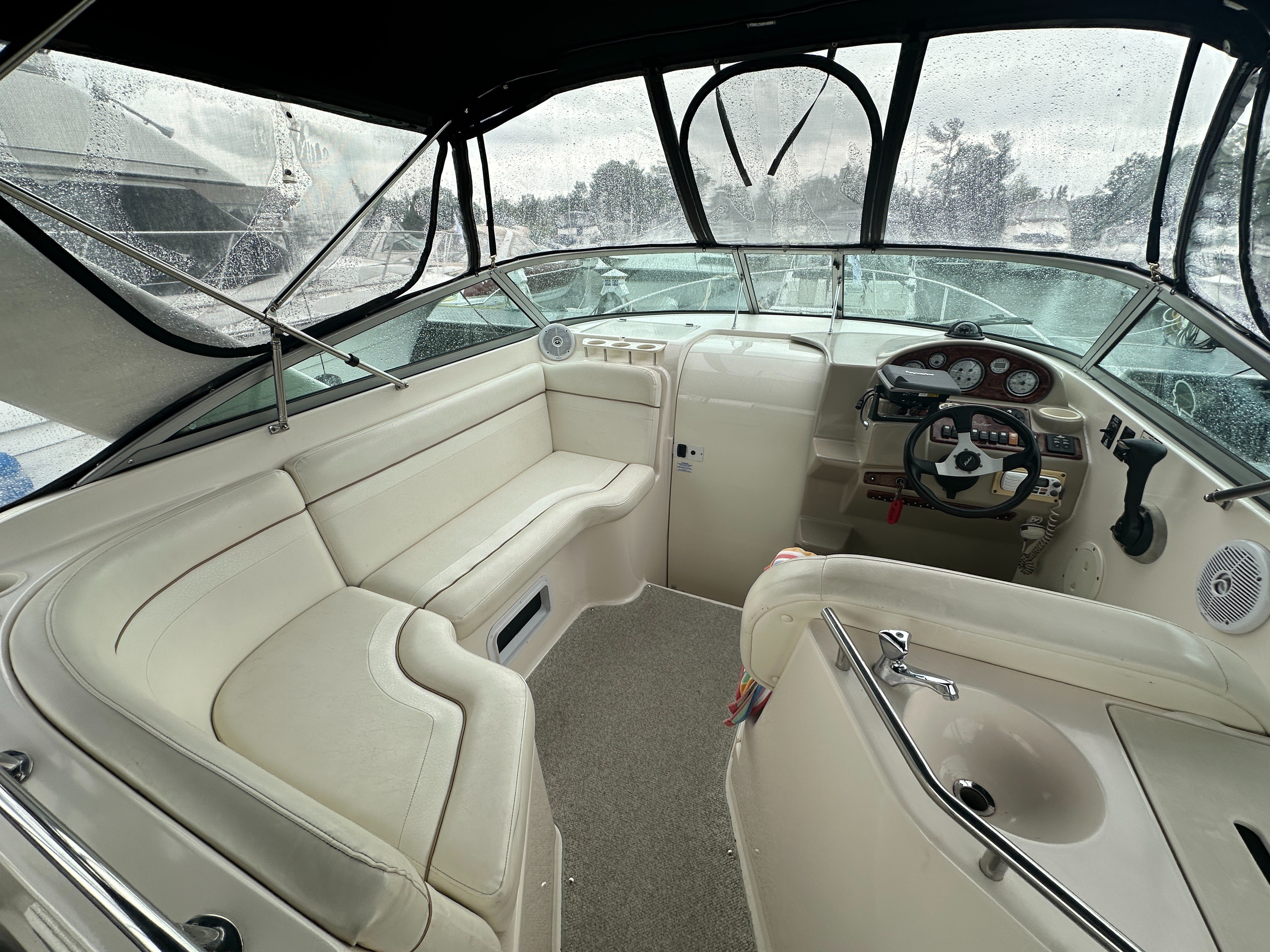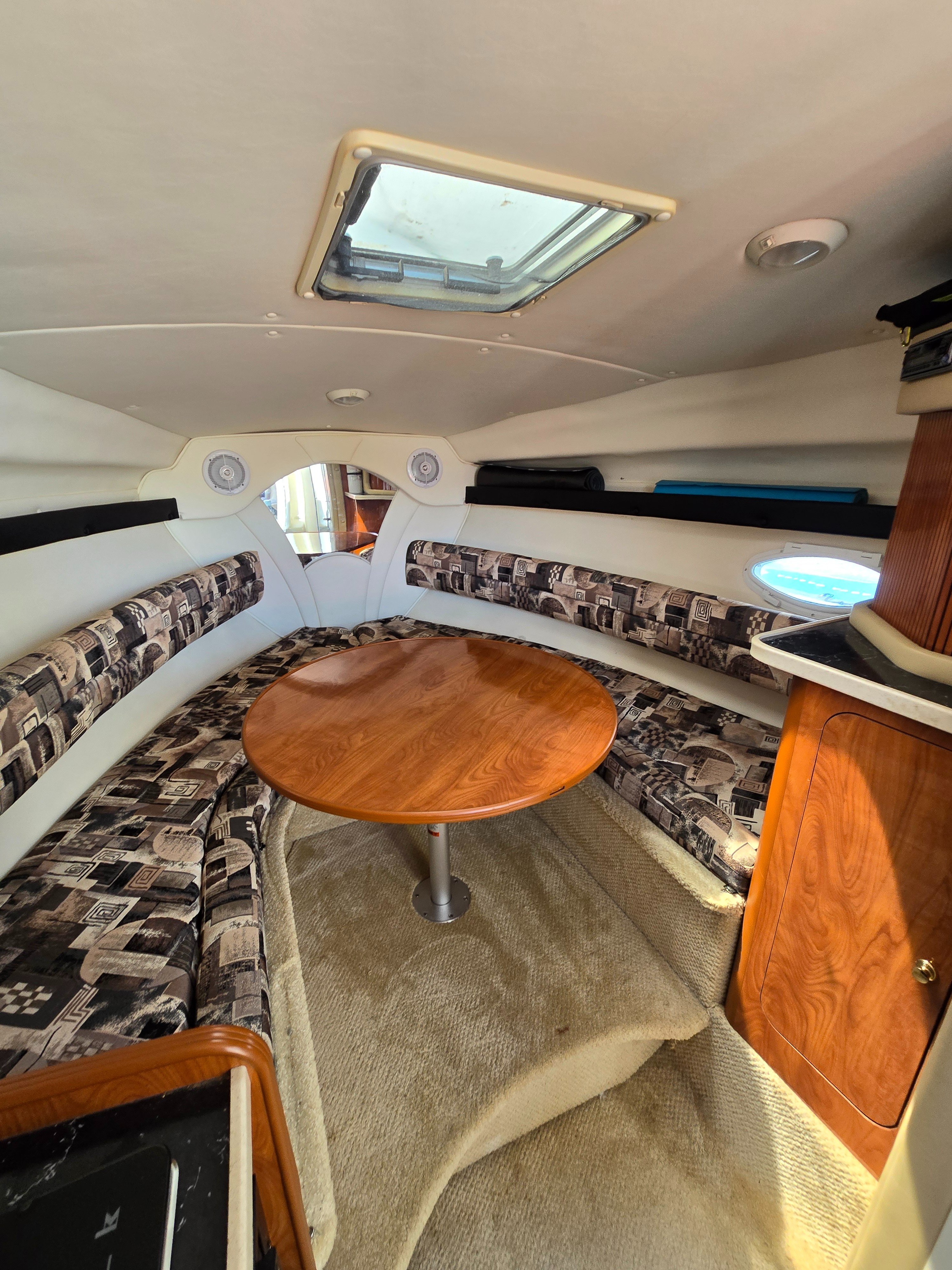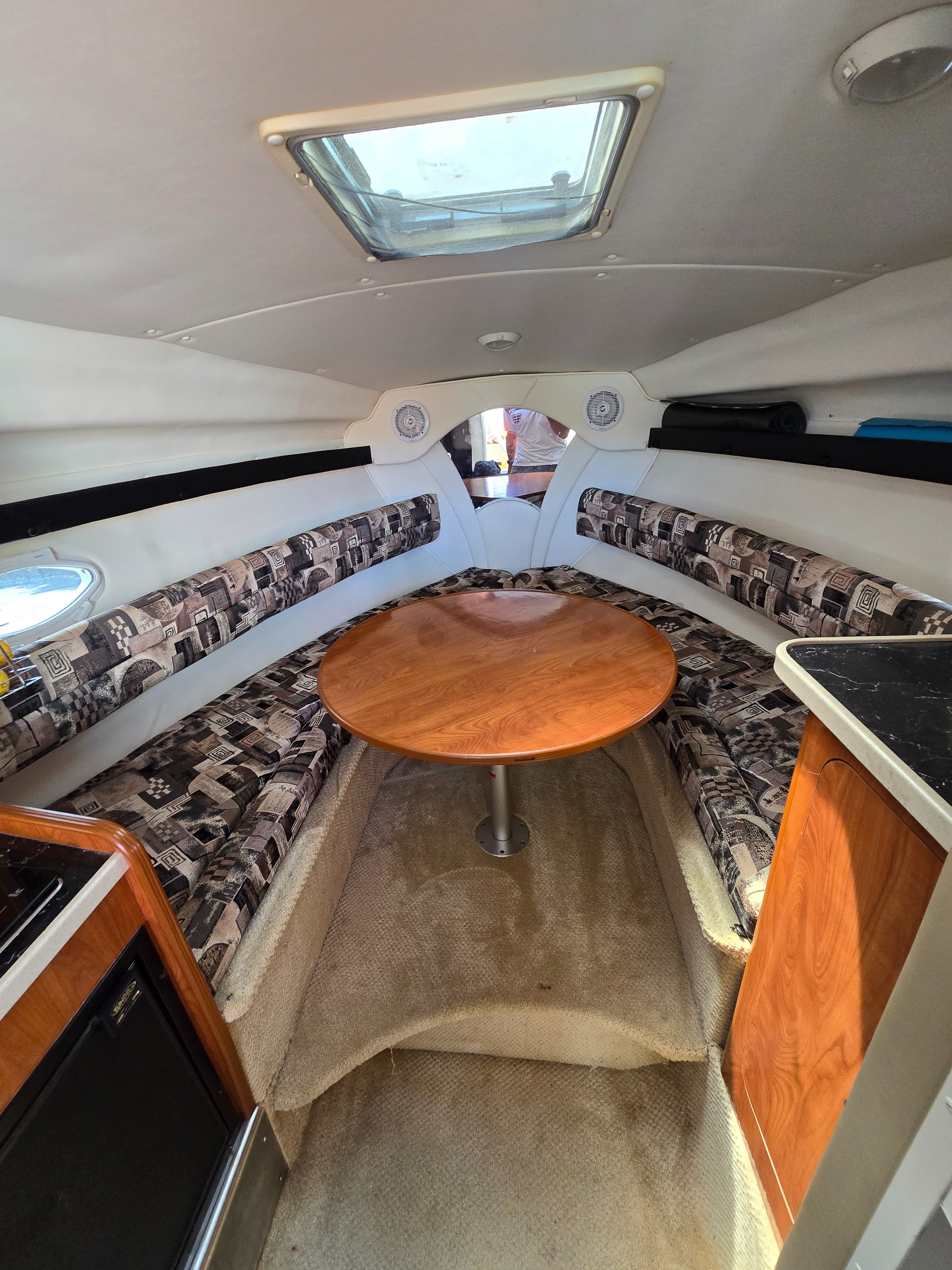 Built on a solid fiberglass modified-V hull, the 270 is not like most 27-footers thanks to her generous 9-foot, 1-inch beam. The interior is arranged like most midcabin cruisers her size with a convertible dinette/V-berth forward, complete galley, enclosed head with shower, and a double berth aft with a curtain for privacy. The single-level cockpit—updated in 2002 with a wet bar and double helm seat—has lounge seating aft and a transom door. Standard features include a walk-through windshield, electric engine hatch (which is actually part of the rear seat), windshield wiper, and transom shower.