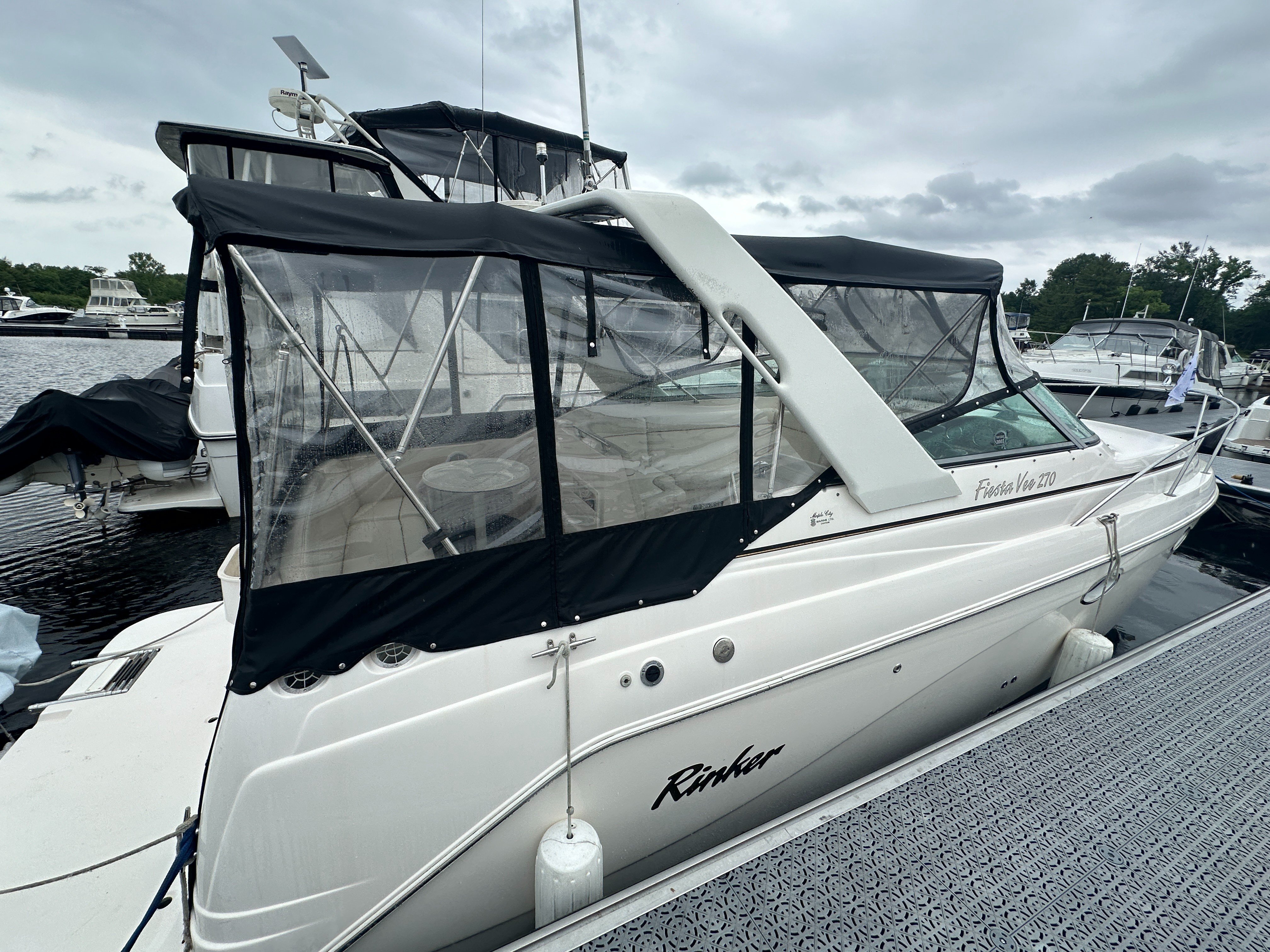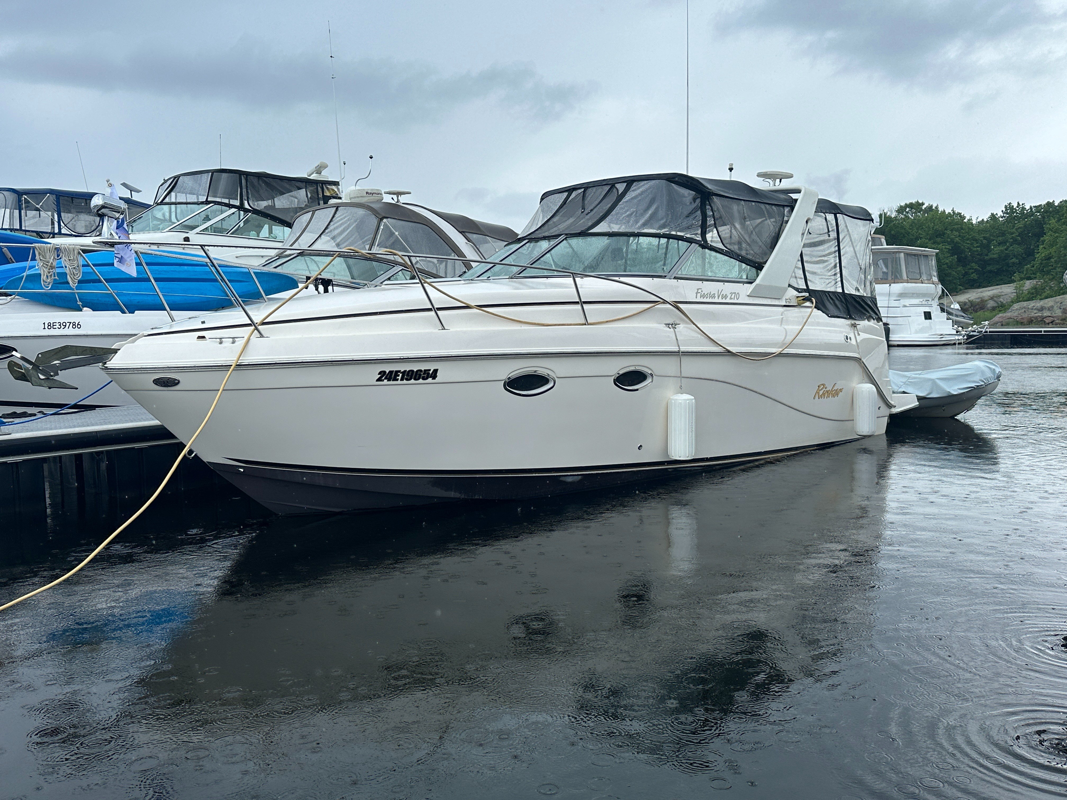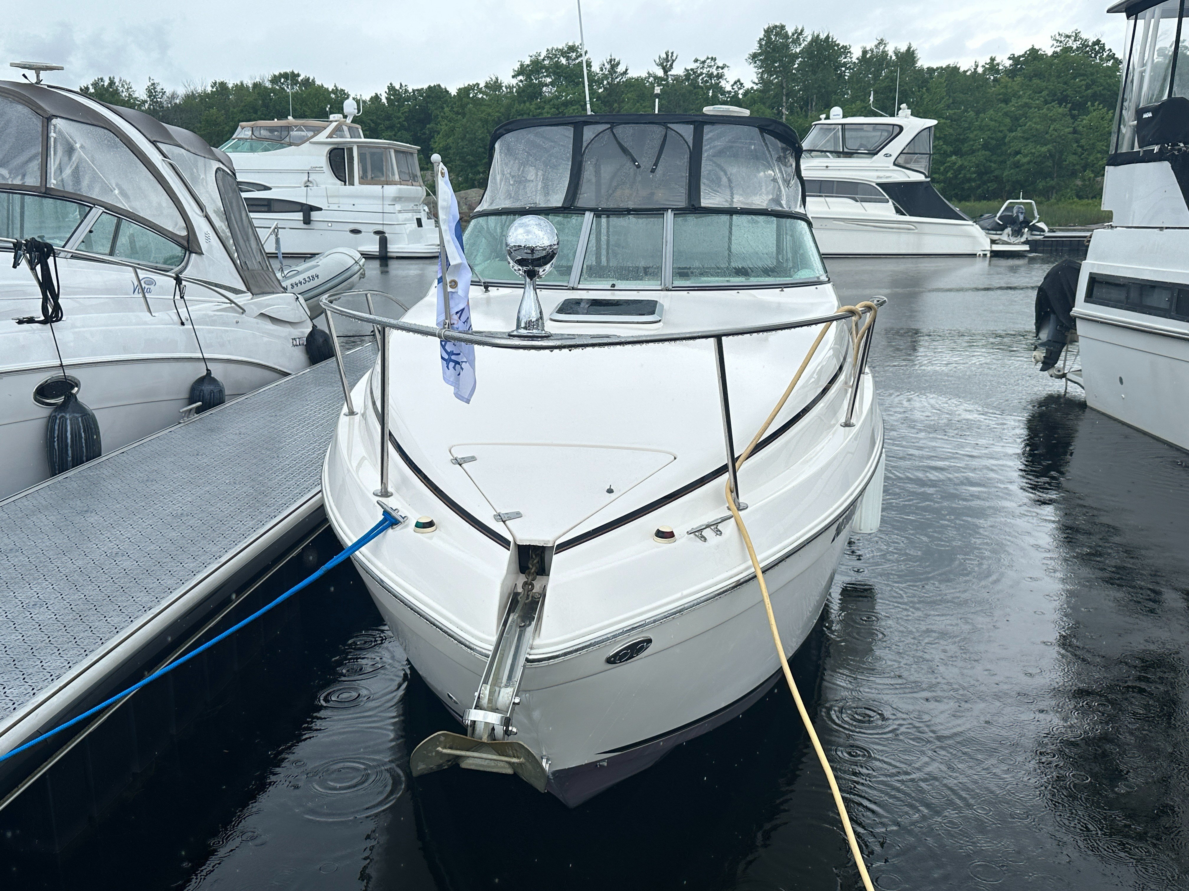 Built on a solid fiberglass modified-V hull, the 270 is not like most 27-footers thanks to her generous 9-foot, 1-inch beam. The interior is arranged like most midcabin cruisers her size with a convertible dinette/V-berth forward, complete galley, enclosed head with shower, and a double berth aft with a curtain for privacy. The single-level cockpit—updated in 2002 with a wet bar and double helm seat—has lounge seating aft and a transom door. Standard features include a walk-through windshield, electric engine hatch (which is actually part of the rear seat), windshield wiper, and transom shower.