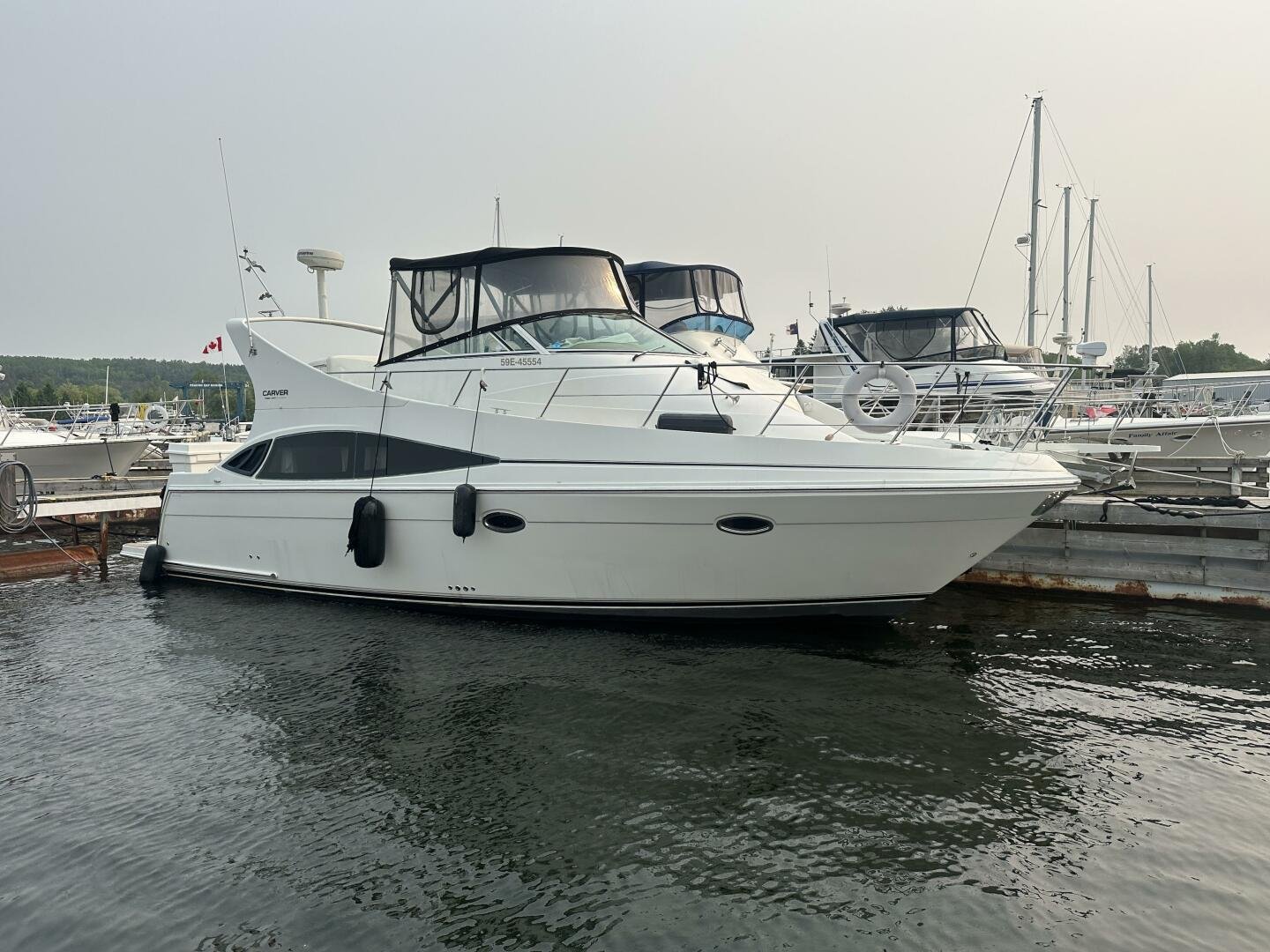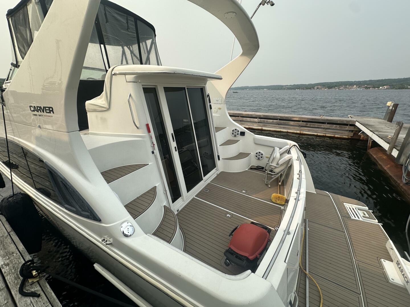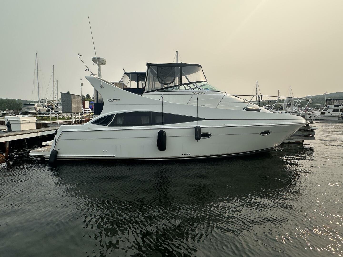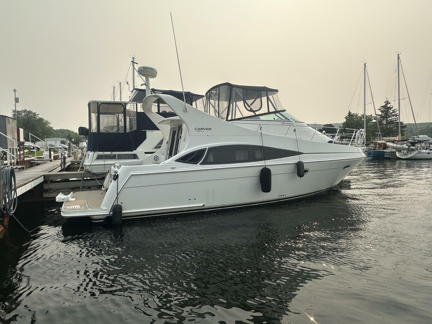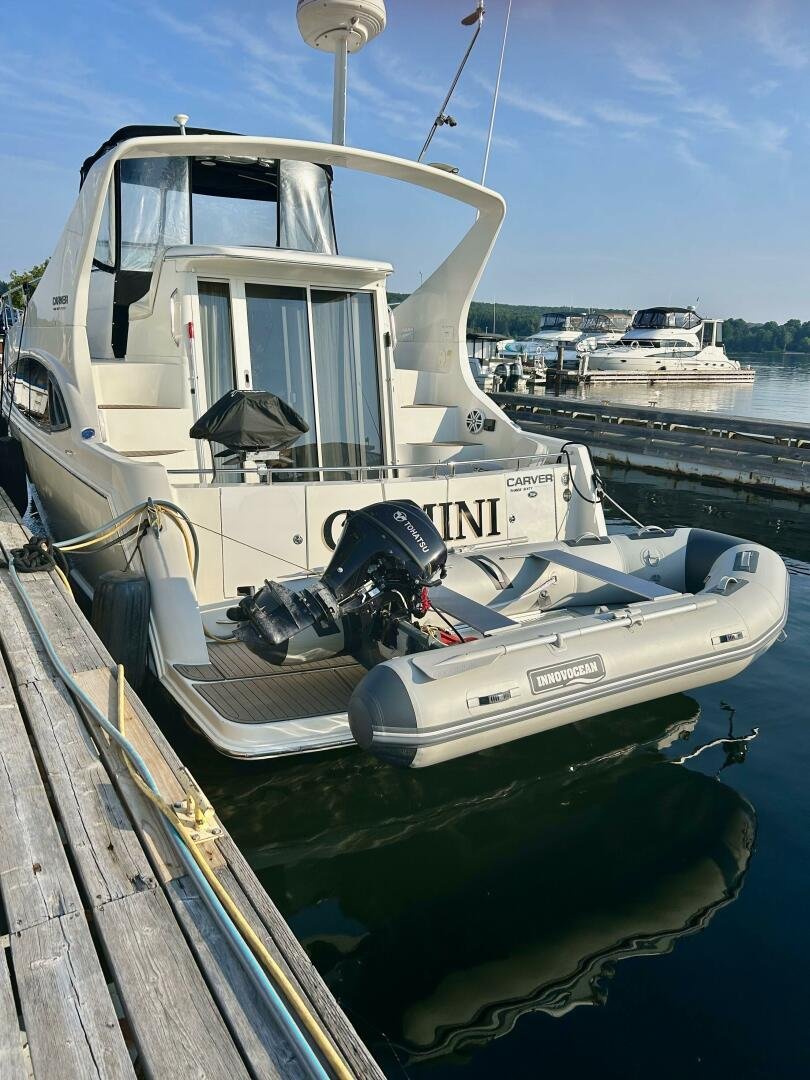 This freshwater boat is clean and ready to go for summer 2025, with a 2023 survey available! The Carver 360 Mariner has an extremely desirable layout. With a large extended swim platform (with a swivel carrier rack), entering through the starboard transom door you are met with an open cockpit, and large molded steps on both sides to the bridge. The bridge is fully enclosed and provides comfortable seating for up to 10 guests. You enter the main cabin through sliding doors and are met with a large couch to port (pull-out), and a dinette with seating for four to starboard that converts to an additional sleeping area. The galley is well appointed with a sink, twin electric burners, microwave, and fridge/freezer. There is a large head and separate shower with a separate entrance from the main salon, as well as an en-suite entrance. The main cabin has a center-line island bed with twin hanging lockers and ample storage.