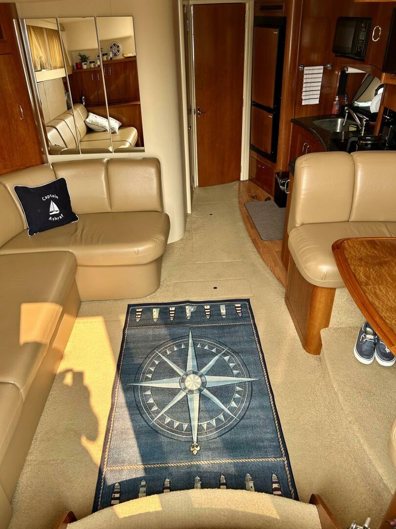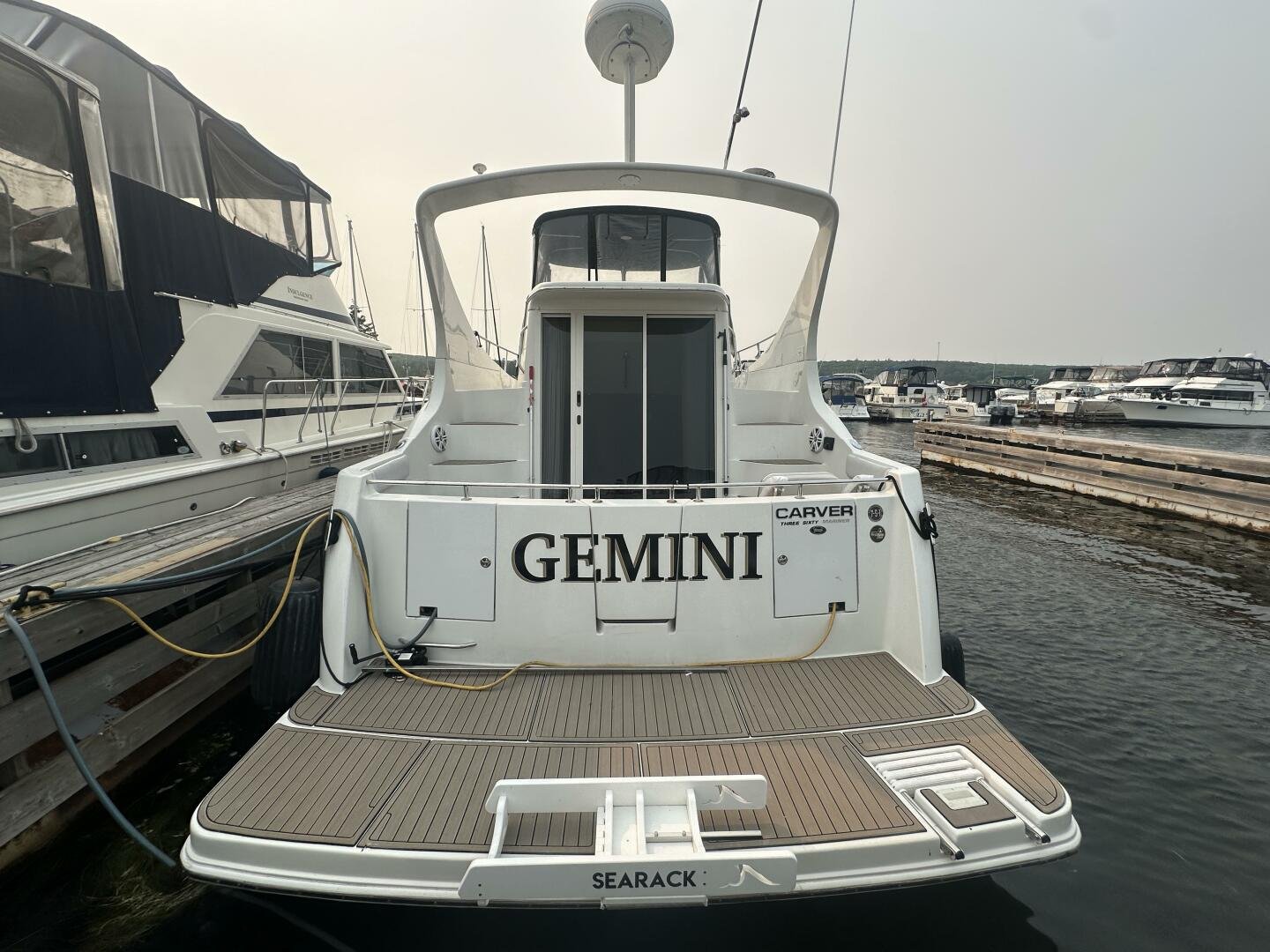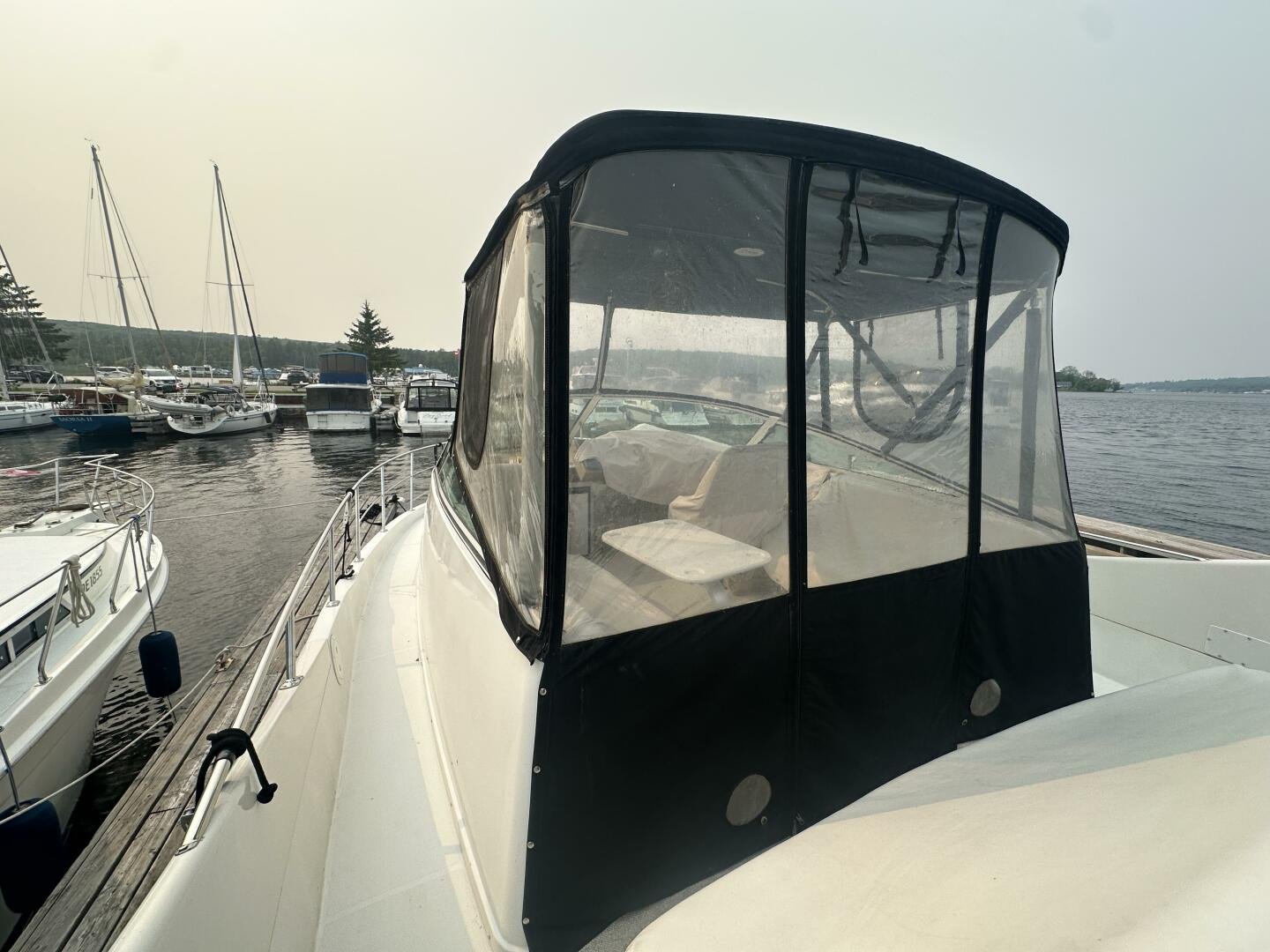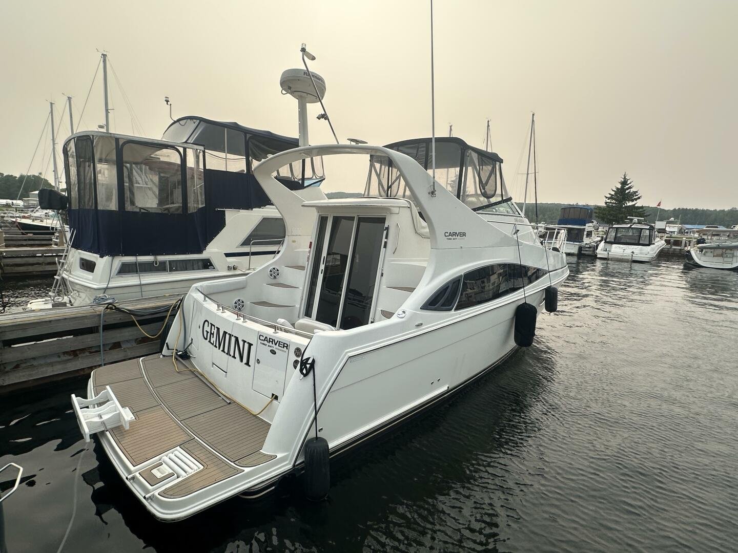 This freshwater boat is clean and ready to go for summer 2025, with a 2023 survey available! The Carver 360 Mariner has an extremely desirable layout. With a large extended swim platform (with a swivel carrier rack), entering through the starboard transom door you are met with an open cockpit, and large molded steps on both sides to the bridge. The bridge is fully enclosed and provides comfortable seating for up to 10 guests. You enter the main cabin through sliding doors and are met with a large couch to port (pull-out), and a dinette with seating for four to starboard that converts to an additional sleeping area. The galley is well appointed with a sink, twin electric burners, microwave, and fridge/freezer. There is a large head and separate shower with a separate entrance from the main salon, as well as an en-suite entrance. The main cabin has a center-line island bed with twin hanging lockers and ample storage.