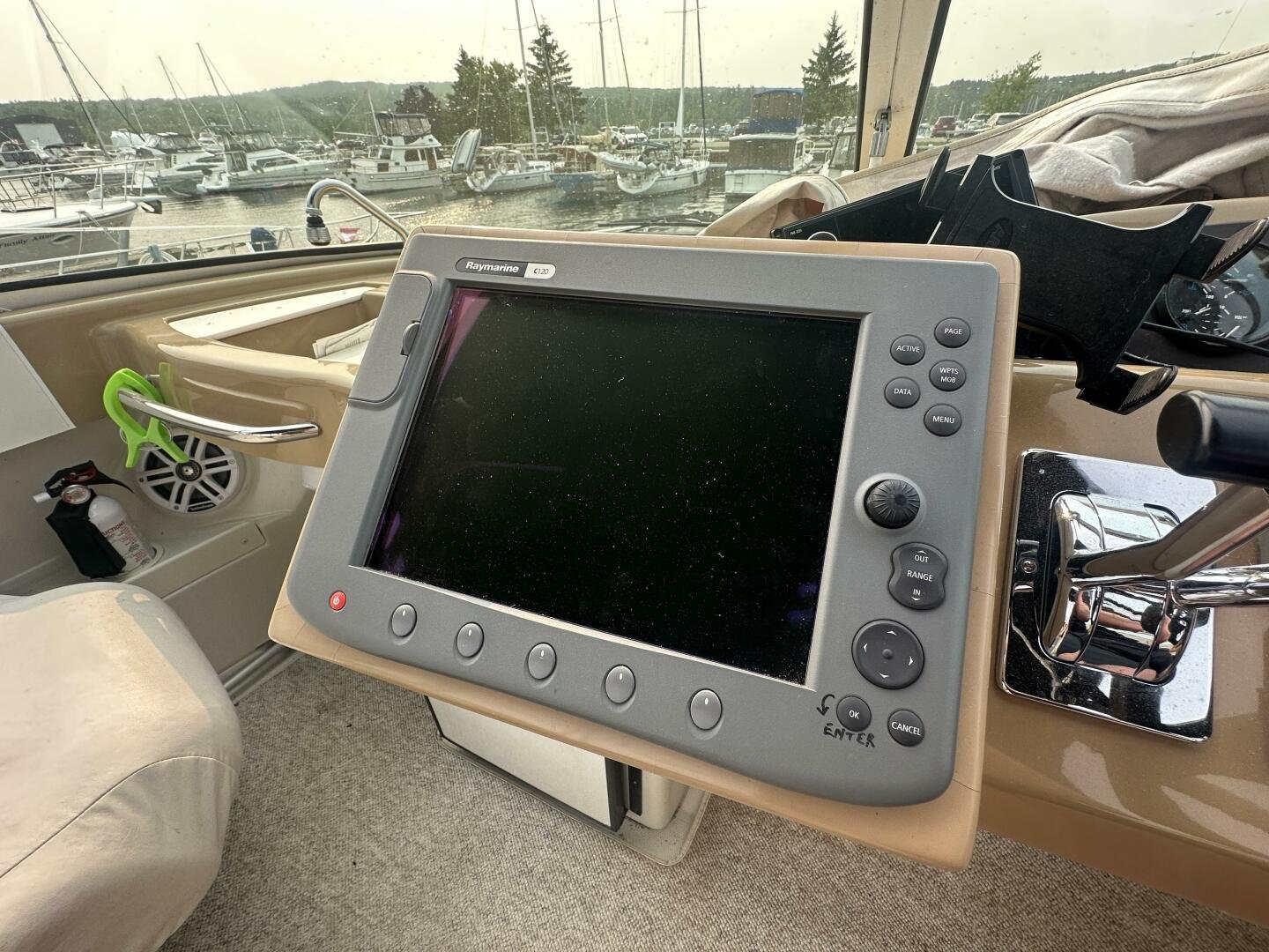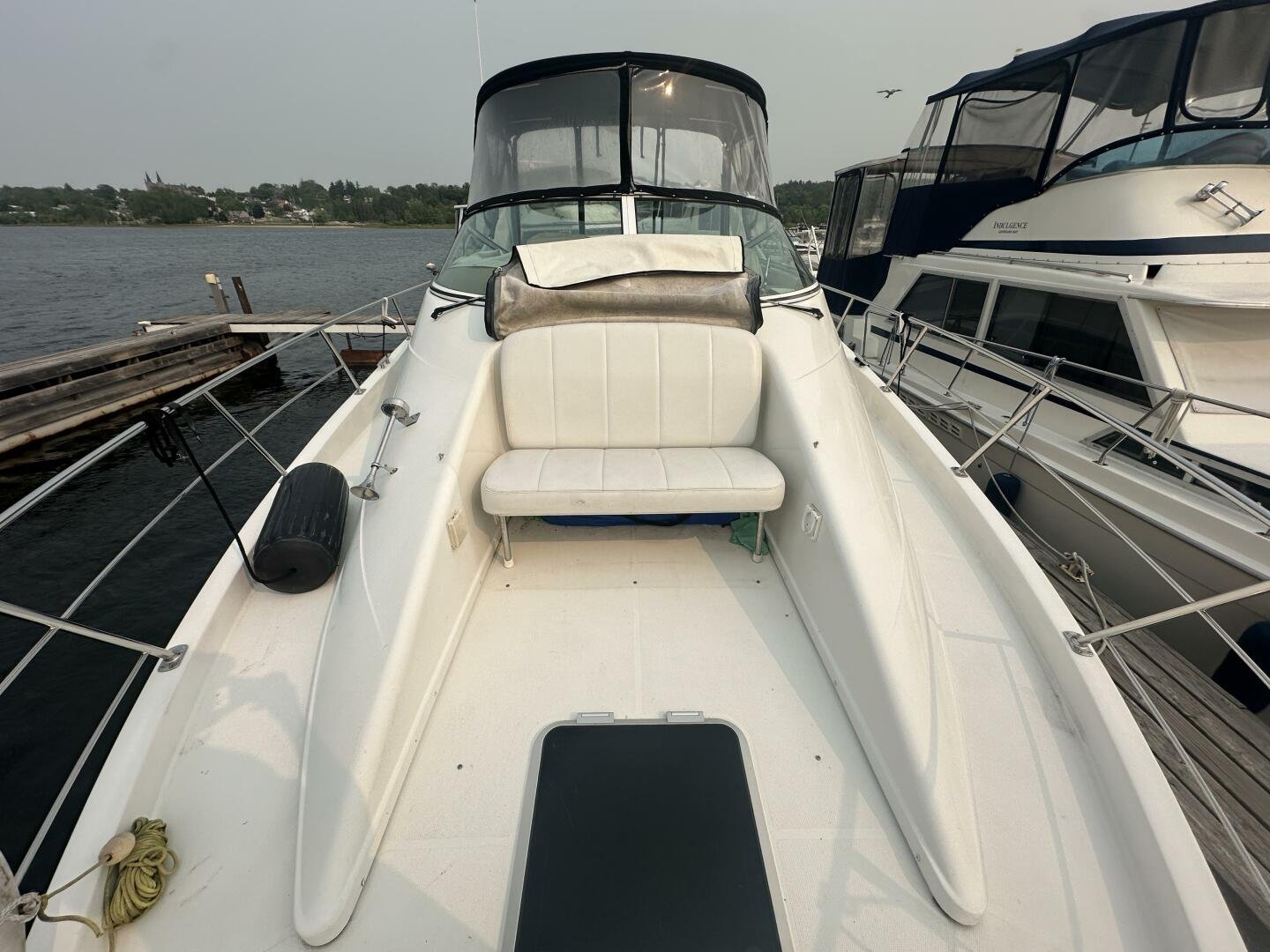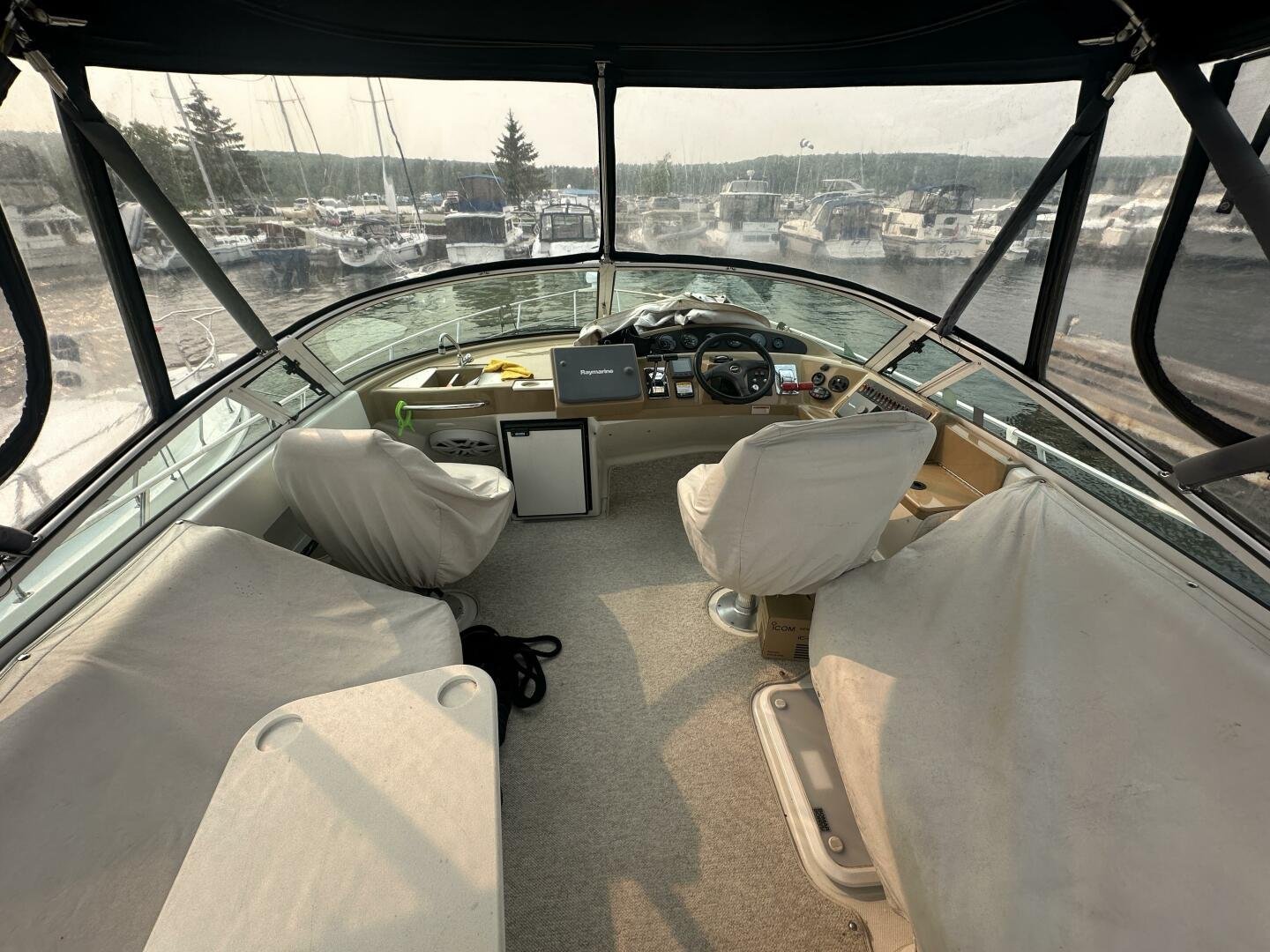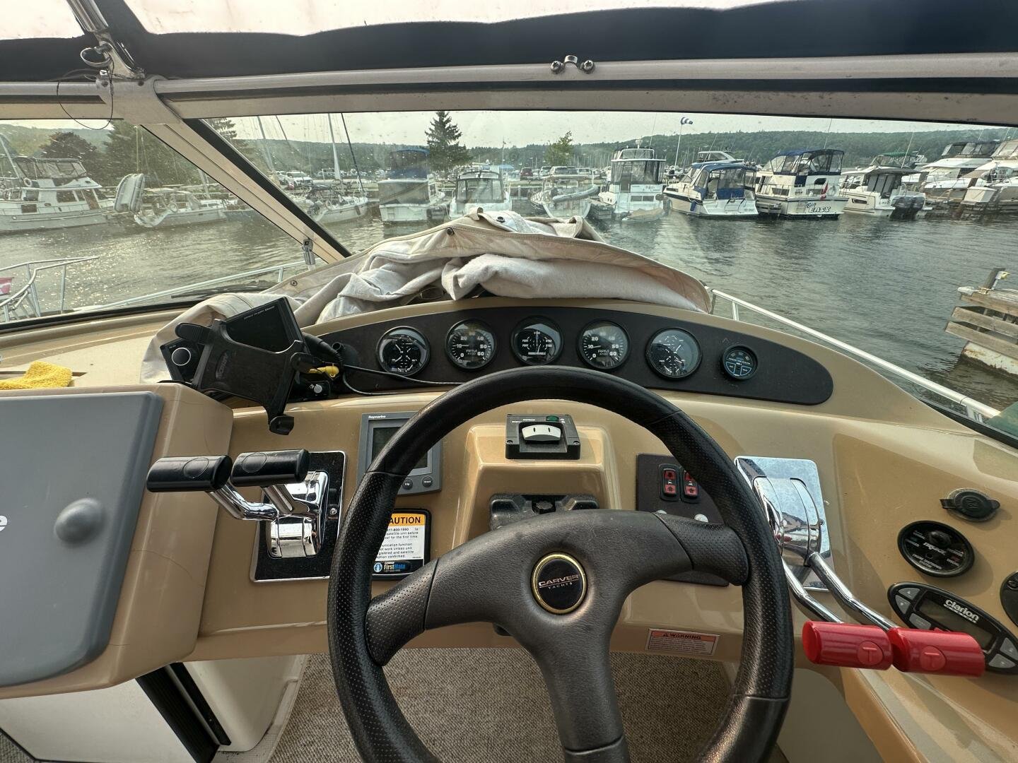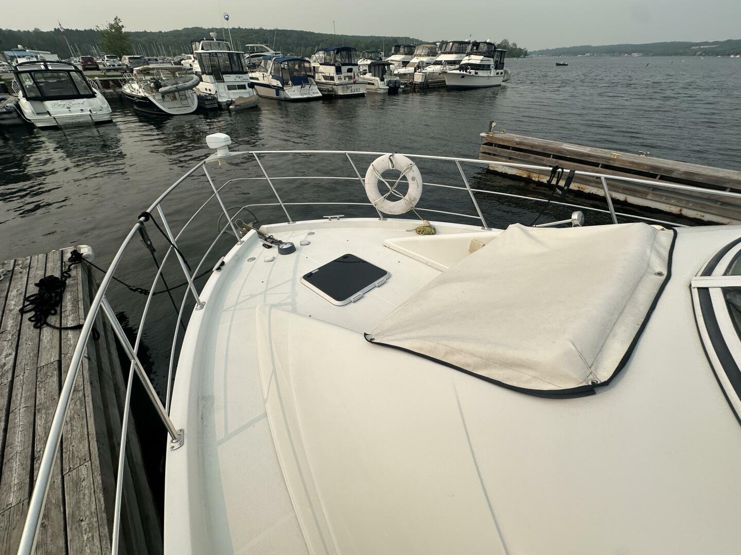 This freshwater boat is clean and ready to go for summer 2025, with a 2023 survey available! The Carver 360 Mariner has an extremely desirable layout. With a large extended swim platform (with a swivel carrier rack), entering through the starboard transom door you are met with an open cockpit, and large molded steps on both sides to the bridge. The bridge is fully enclosed and provides comfortable seating for up to 10 guests. You enter the main cabin through sliding doors and are met with a large couch to port (pull-out), and a dinette with seating for four to starboard that converts to an additional sleeping area. The galley is well appointed with a sink, twin electric burners, microwave, and fridge/freezer. There is a large head and separate shower with a separate entrance from the main salon, as well as an en-suite entrance. The main cabin has a center-line island bed with twin hanging lockers and ample storage.