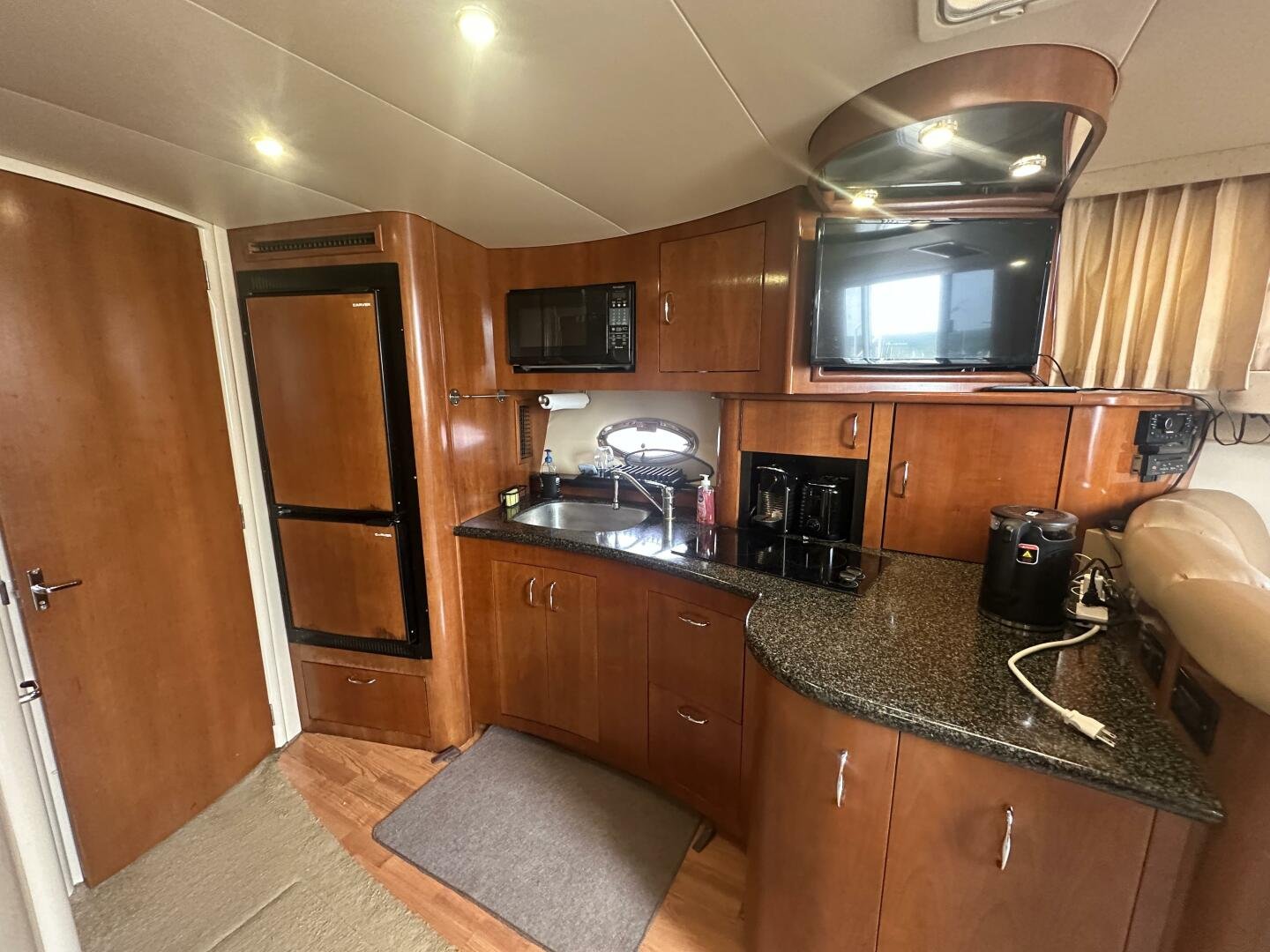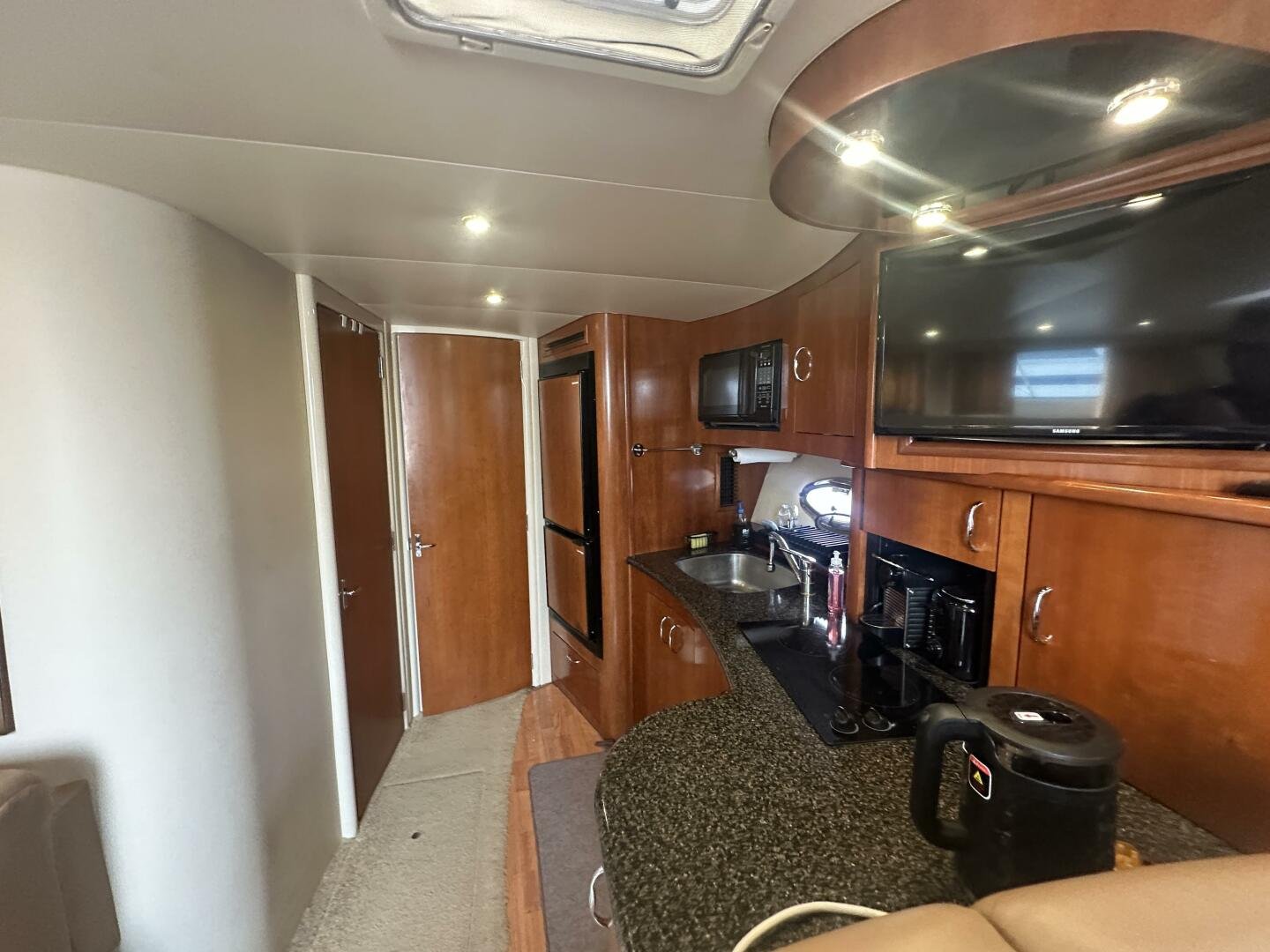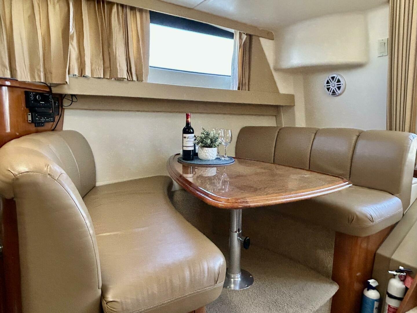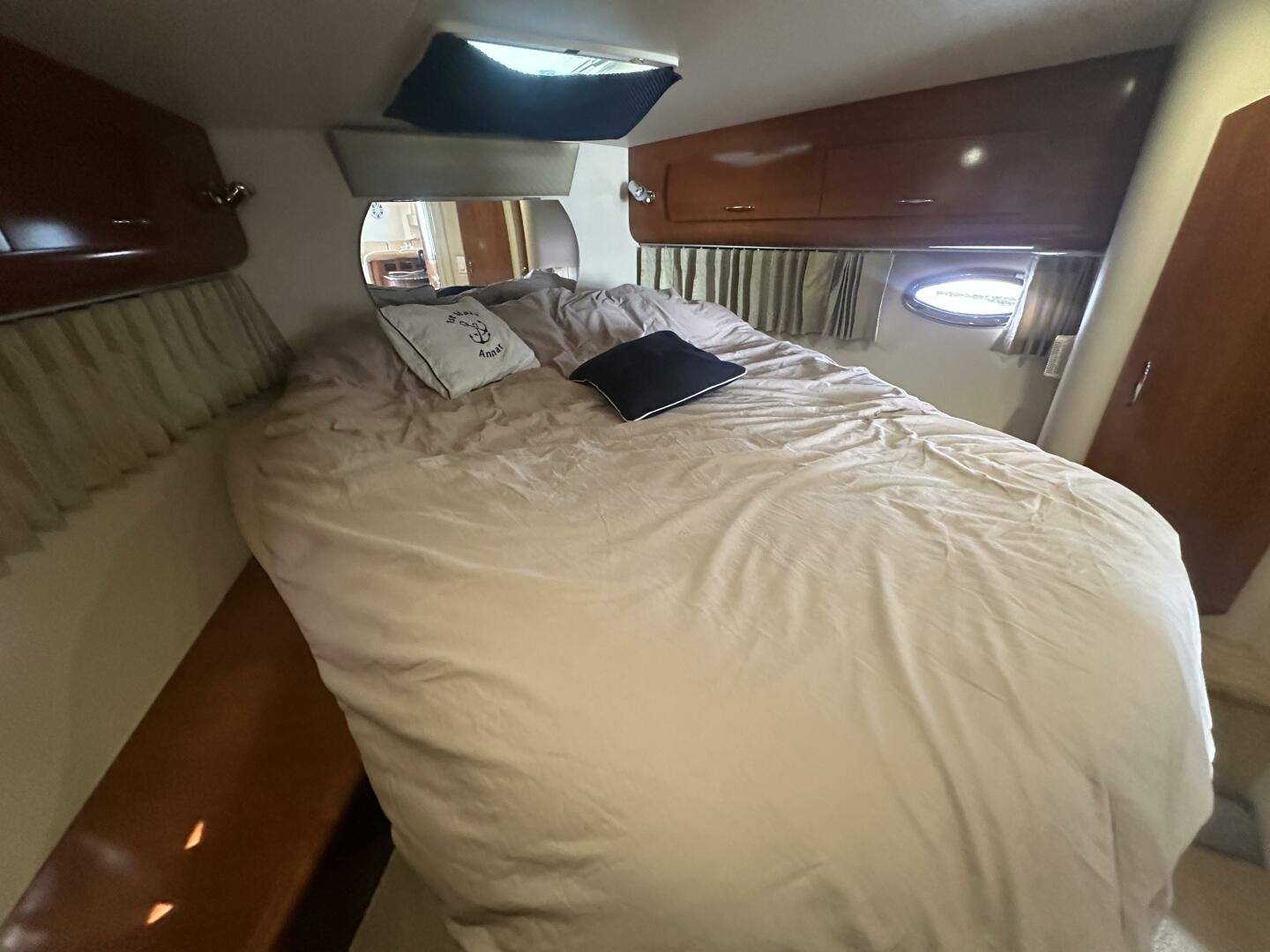 This freshwater boat is clean and ready to go for summer 2025, with a 2023 survey available! The Carver 360 Mariner has an extremely desirable layout. With a large extended swim platform (with a swivel carrier rack), entering through the starboard transom door you are met with an open cockpit, and large molded steps on both sides to the bridge. The bridge is fully enclosed and provides comfortable seating for up to 10 guests. You enter the main cabin through sliding doors and are met with a large couch to port (pull-out), and a dinette with seating for four to starboard that converts to an additional sleeping area. The galley is well appointed with a sink, twin electric burners, microwave, and fridge/freezer. There is a large head and separate shower with a separate entrance from the main salon, as well as an en-suite entrance. The main cabin has a center-line island bed with twin hanging lockers and ample storage.