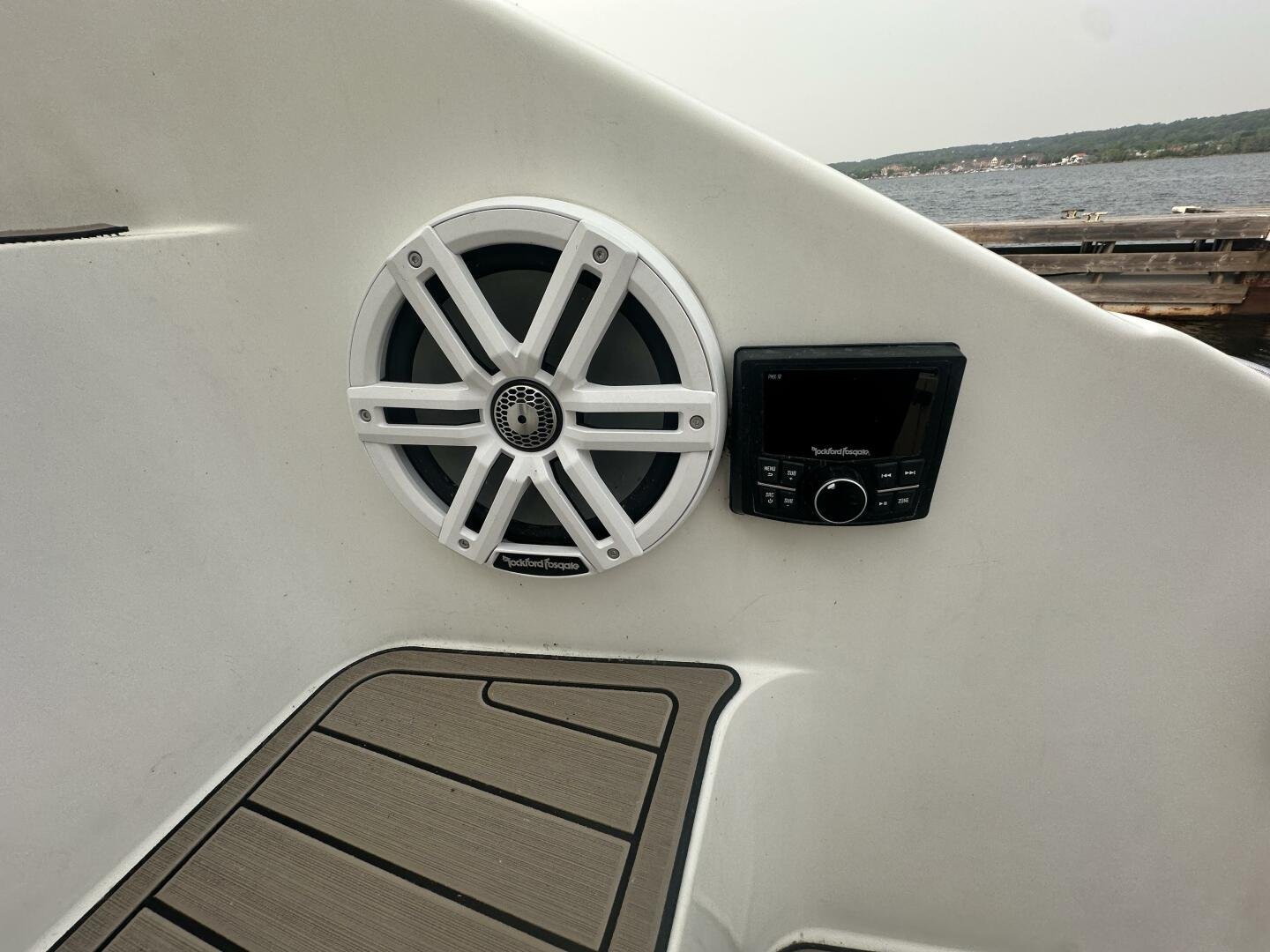 -One 12-inch flybridge sub with 4 x 8 inch speakers and 2 x 6.5 inch RGB LED speakers with Rockford Fosgate radio and 3 amplifier and terrace 4 x 8 inch speaker with amplifier