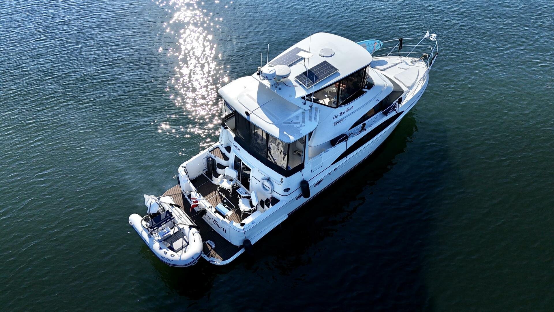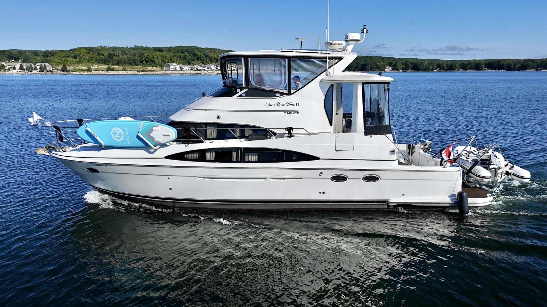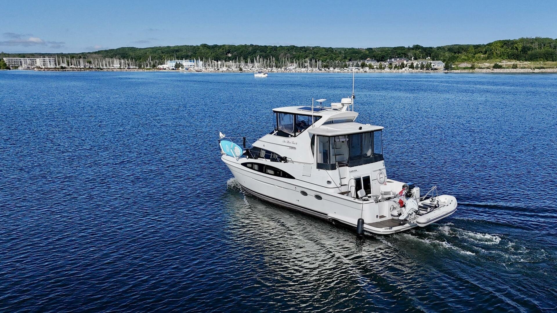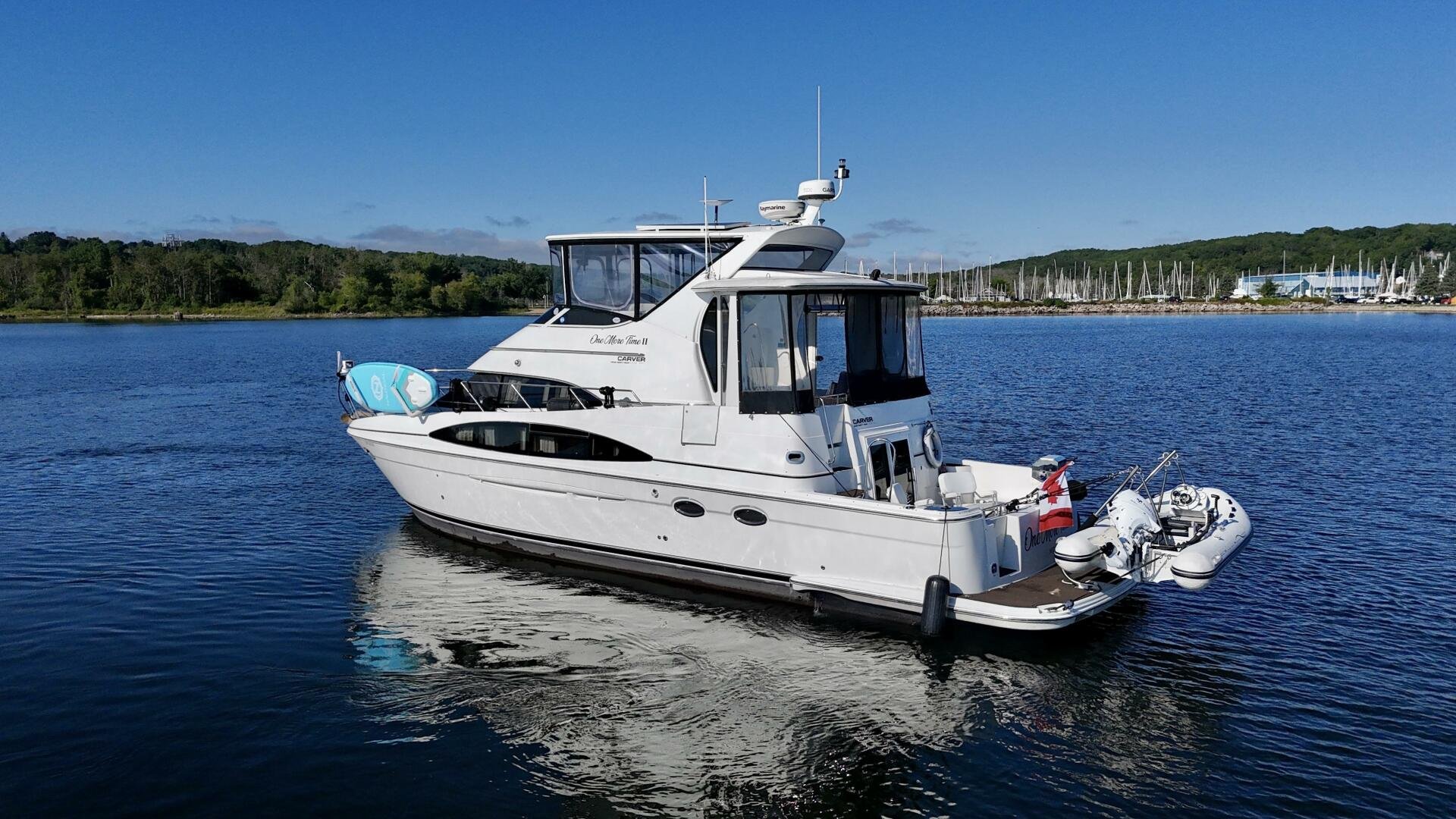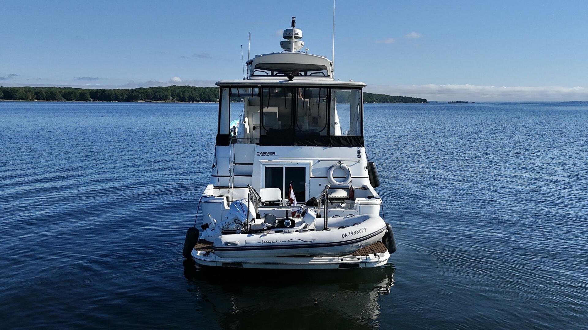 A 2004 Carver 444 CPMY featuring a hardtop and Volvo Penta power. The 444 has a great layout with plenty and makes an excellent floating cottage. The vessel has three different levels for easy boarding for various dock heights. The large platform and cockpit give plenty of outdoor space, with molded steps to bridge and a sliding door entrance to the main cabin. A fully enclosed bridge cockpit, and bridge with a hardtop provide plenty of seating. The salon is expansive with plenty of natural light, the galley and dinette blend in to give you a truly grand feel. Forward is the guest cabin with en-suite head. To aft you have a large stateroom with walk-around queen bed, and en-suite head with separate shower. This boat has been set up for cruising the Great Lakes with dinghy caddy, solar, lithium, and an inverter.