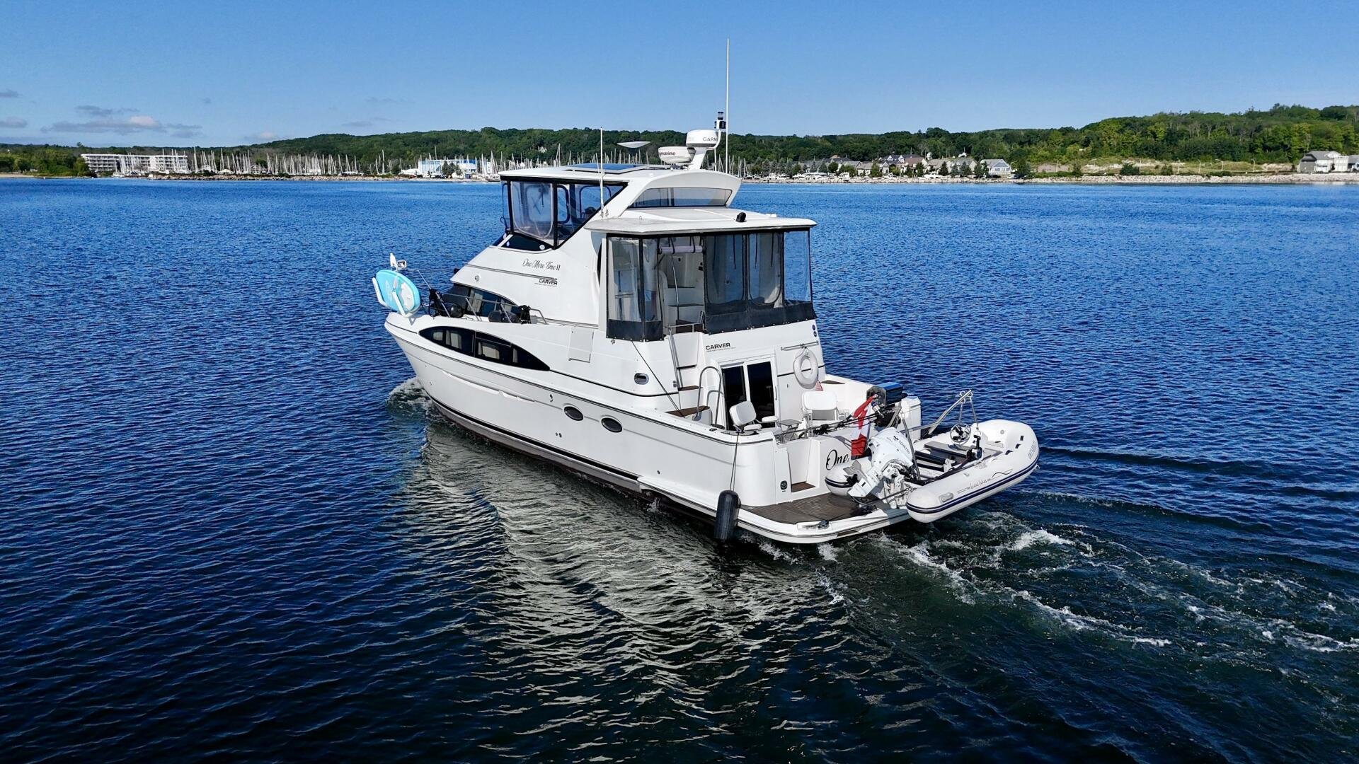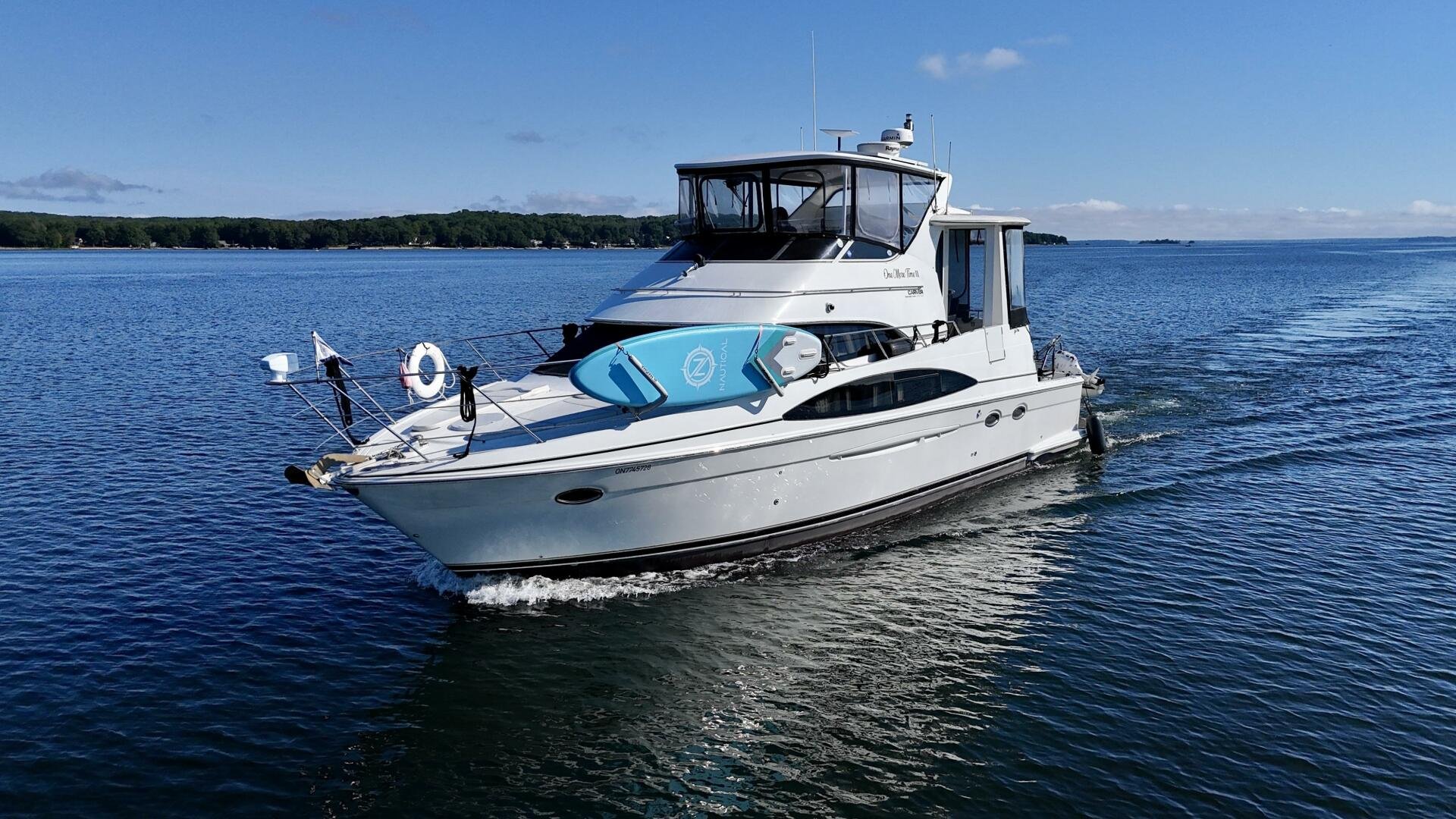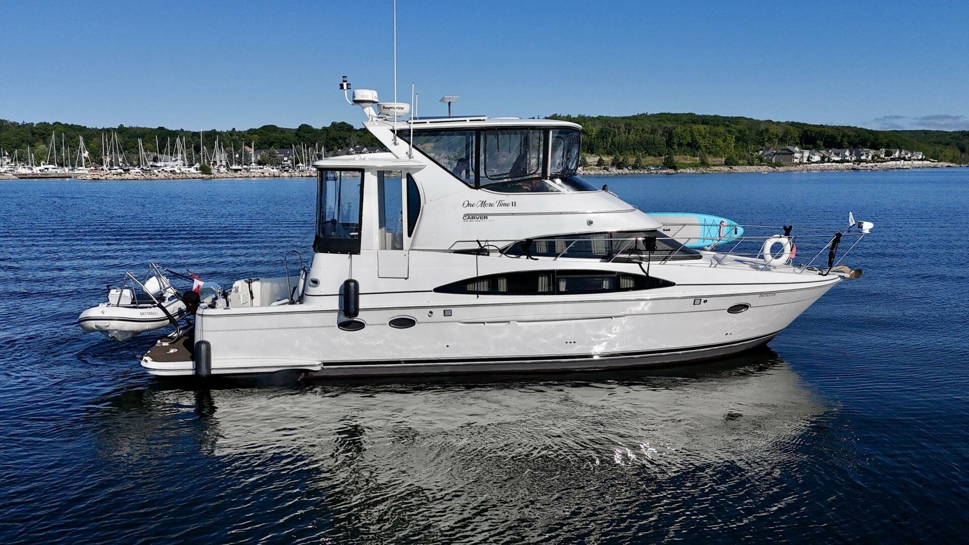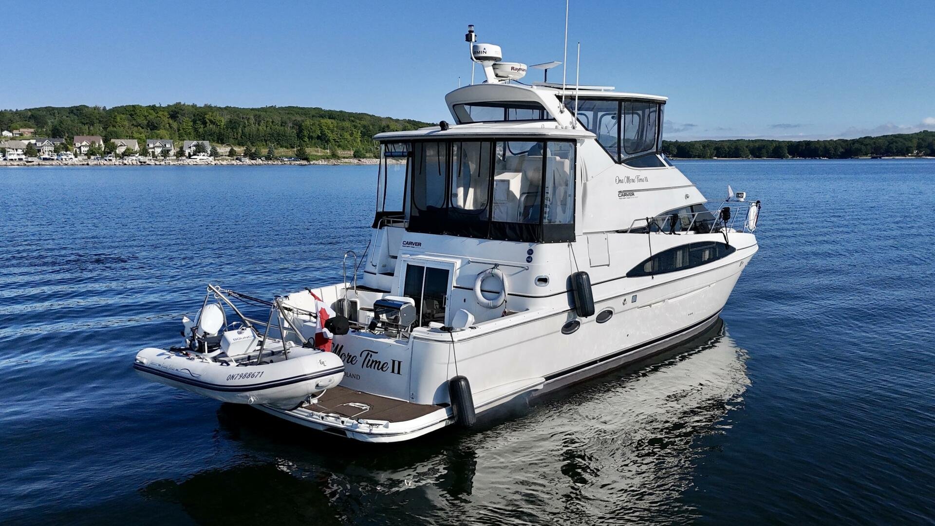 A 2004 Carver 444 CPMY featuring a hardtop and Volvo Penta power. The 444 has a great layout with plenty and makes an excellent floating cottage. The vessel has three different levels for easy boarding for various dock heights. The large platform and cockpit give plenty of outdoor space, with molded steps to bridge and a sliding door entrance to the main cabin. A fully enclosed bridge cockpit, and bridge with a hardtop provide plenty of seating. The salon is expansive with plenty of natural light, the galley and dinette blend in to give you a truly grand feel. Forward is the guest cabin with en-suite head. To aft you have a large stateroom with walk-around queen bed, and en-suite head with separate shower. This boat has been set up for cruising the Great Lakes with dinghy caddy, solar, lithium, and an inverter.