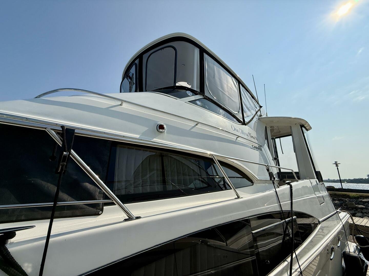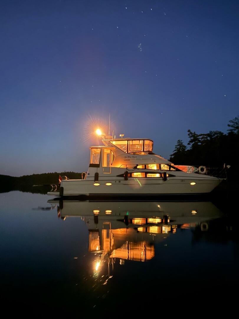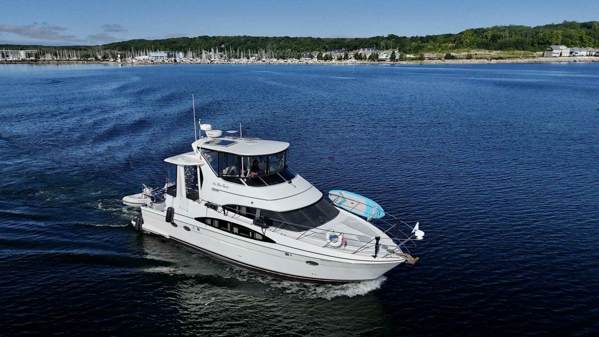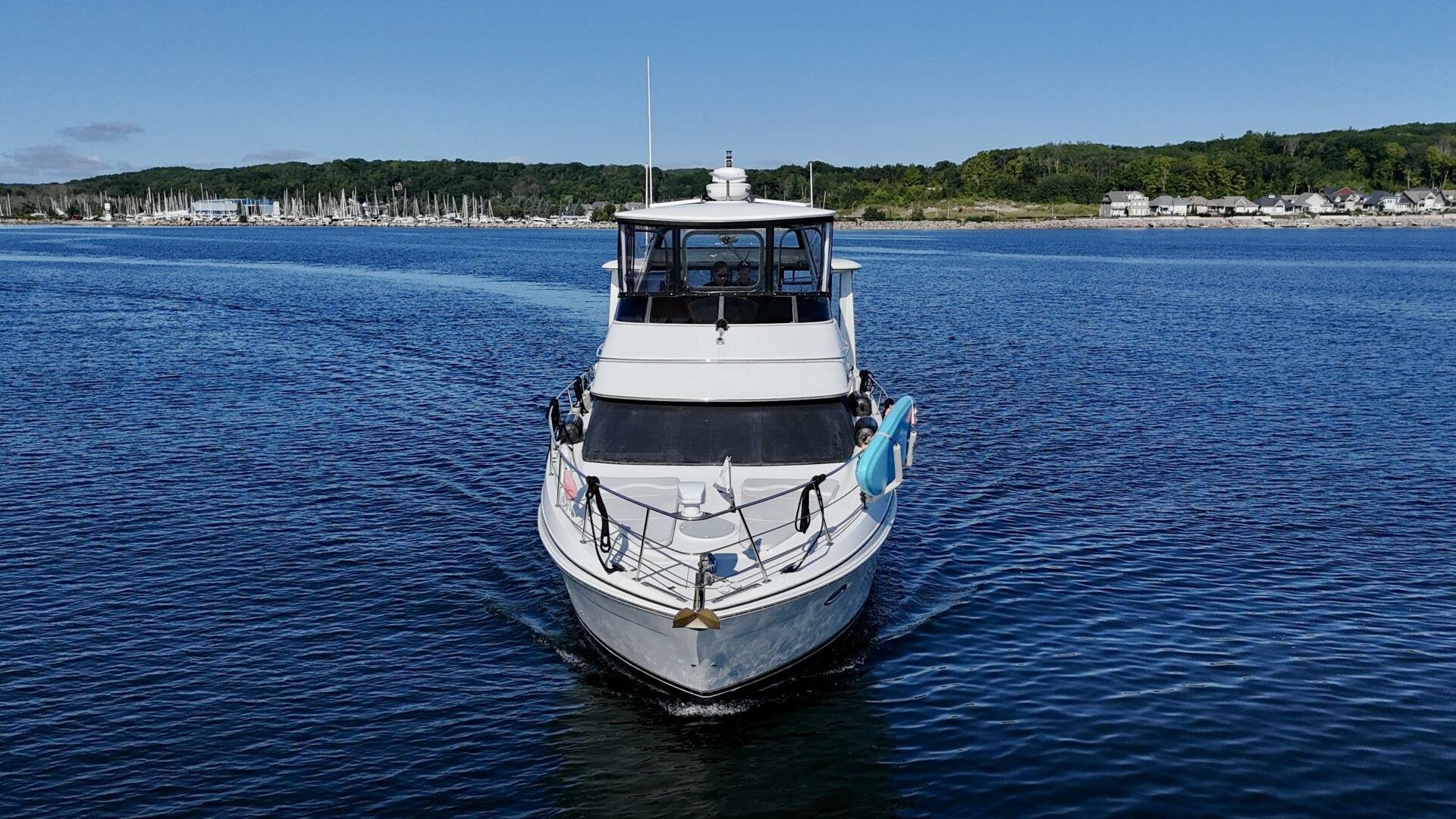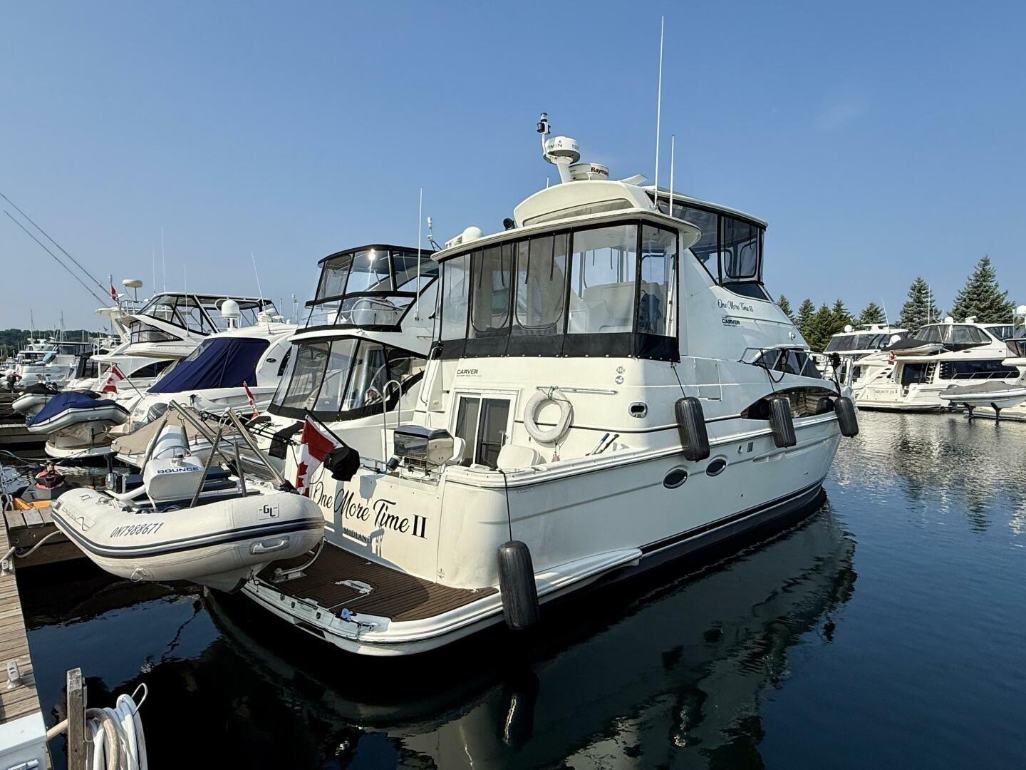 A 2004 Carver 444 CPMY featuring a hardtop and Volvo Penta power. The 444 has a great layout with plenty and makes an excellent floating cottage. The vessel has three different levels for easy boarding for various dock heights. The large platform and cockpit give plenty of outdoor space, with molded steps to bridge and a sliding door entrance to the main cabin. A fully enclosed bridge cockpit, and bridge with a hardtop provide plenty of seating. The salon is expansive with plenty of natural light, the galley and dinette blend in to give you a truly grand feel. Forward is the guest cabin with en-suite head. To aft you have a large stateroom with walk-around queen bed, and en-suite head with separate shower. This boat has been set up for cruising the Great Lakes with dinghy caddy, solar, lithium, and an inverter.