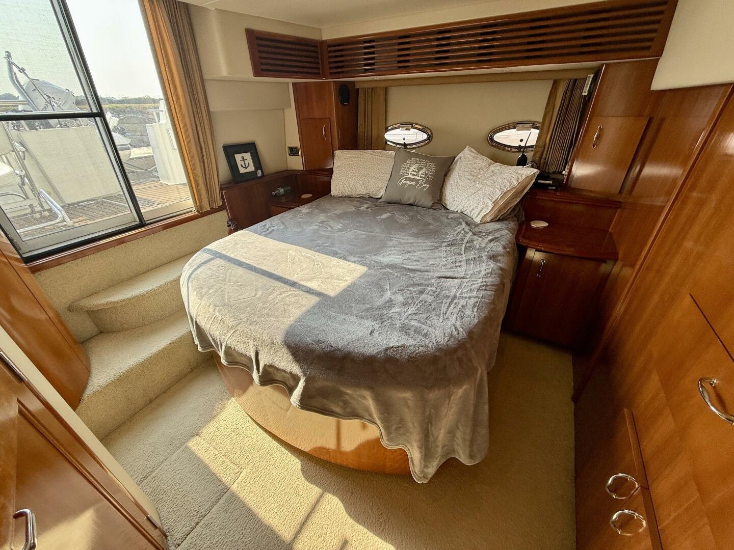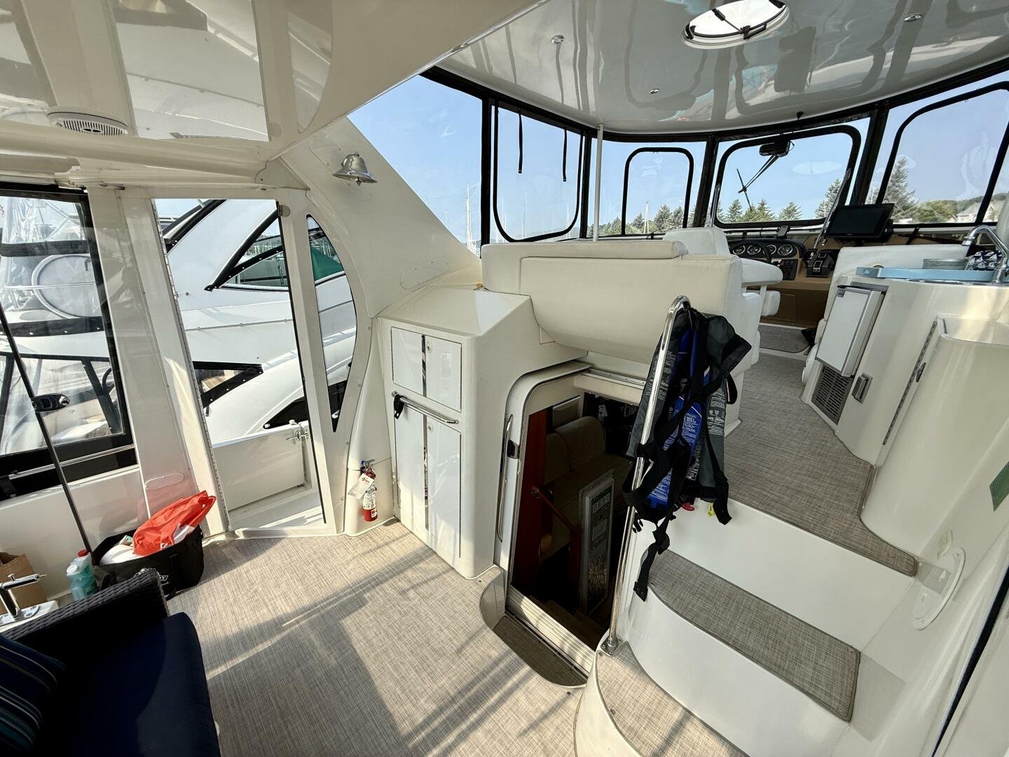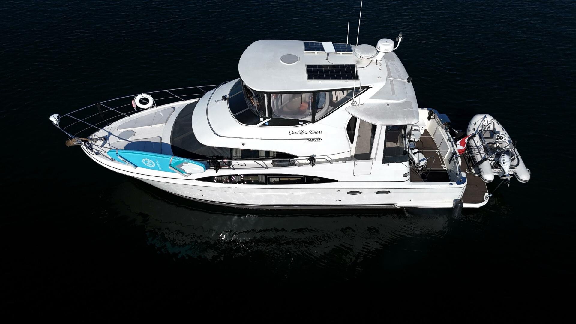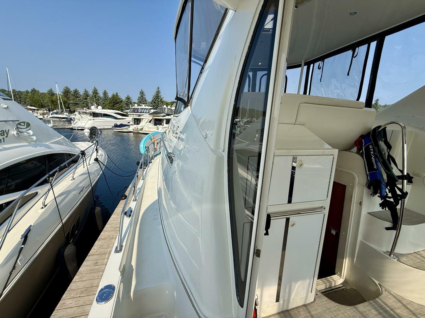 A 2004 Carver 444 CPMY featuring a hardtop and Volvo Penta power. The 444 has a great layout with plenty and makes an excellent floating cottage. The vessel has three different levels for easy boarding for various dock heights. The large platform and cockpit give plenty of outdoor space, with molded steps to bridge and a sliding door entrance to the main cabin. A fully enclosed bridge cockpit, and bridge with a hardtop provide plenty of seating. The salon is expansive with plenty of natural light, the galley and dinette blend in to give you a truly grand feel. Forward is the guest cabin with en-suite head. To aft you have a large stateroom with walk-around queen bed, and en-suite head with separate shower. This boat has been set up for cruising the Great Lakes with dinghy caddy, solar, lithium, and an inverter.