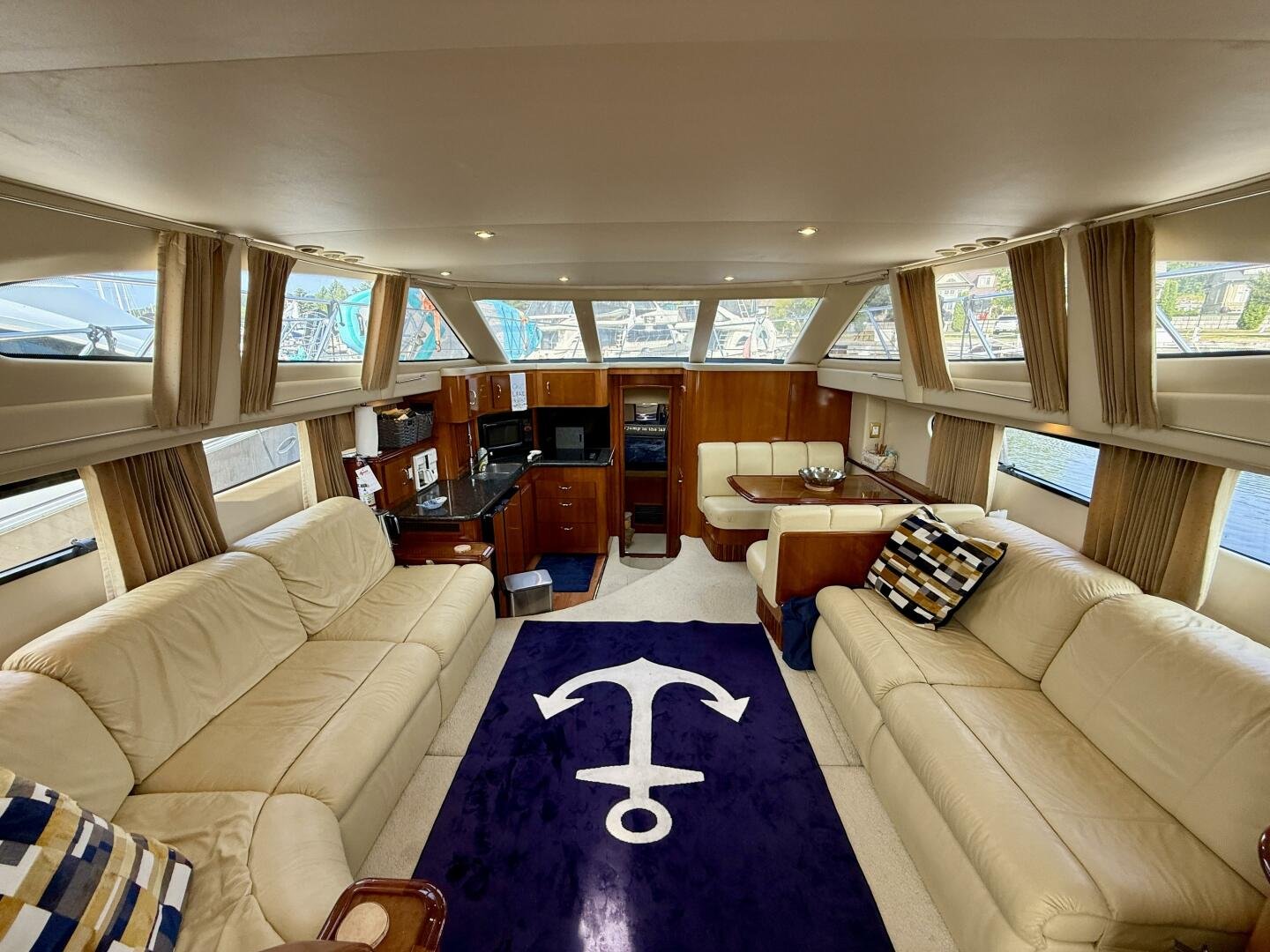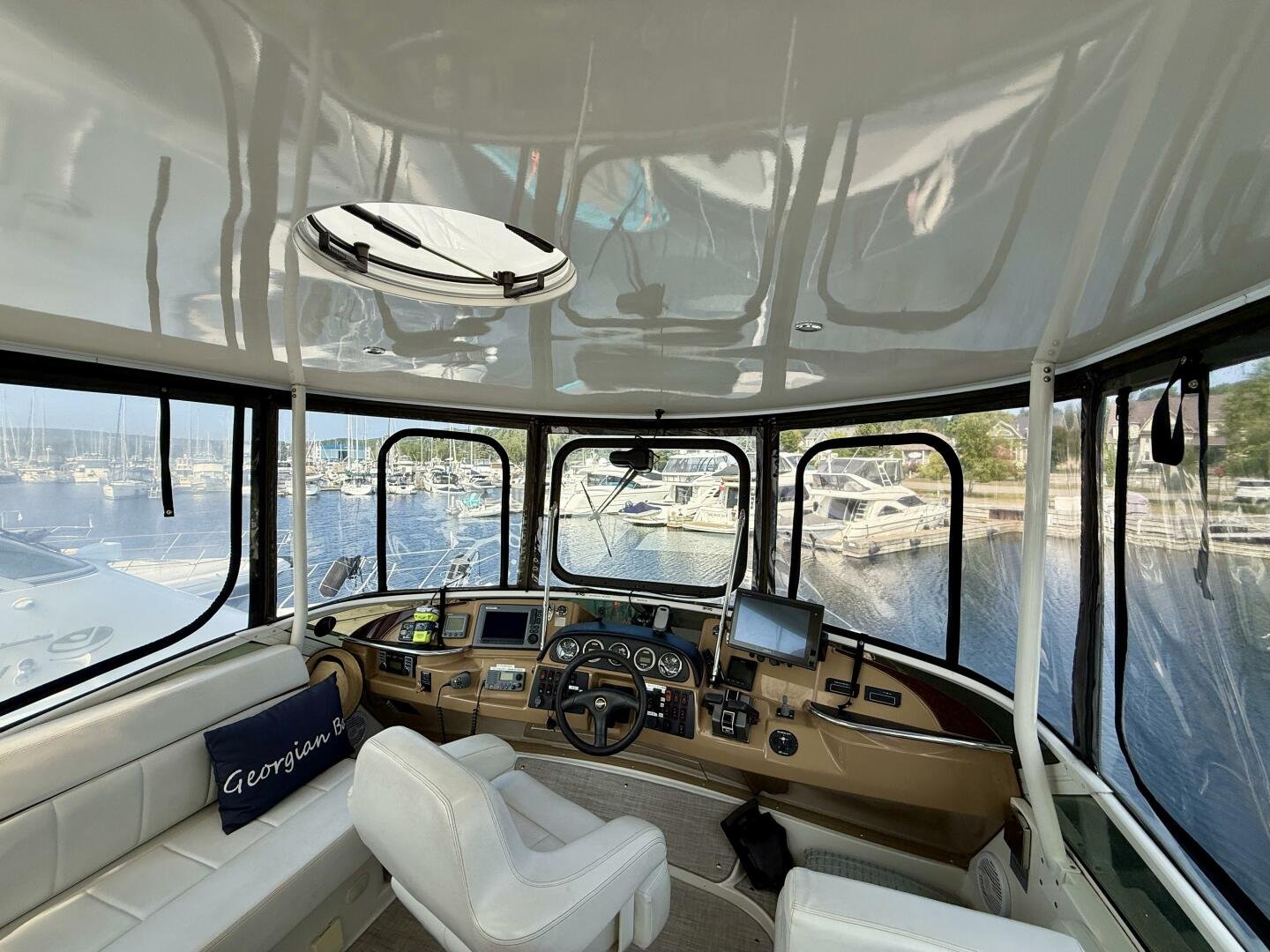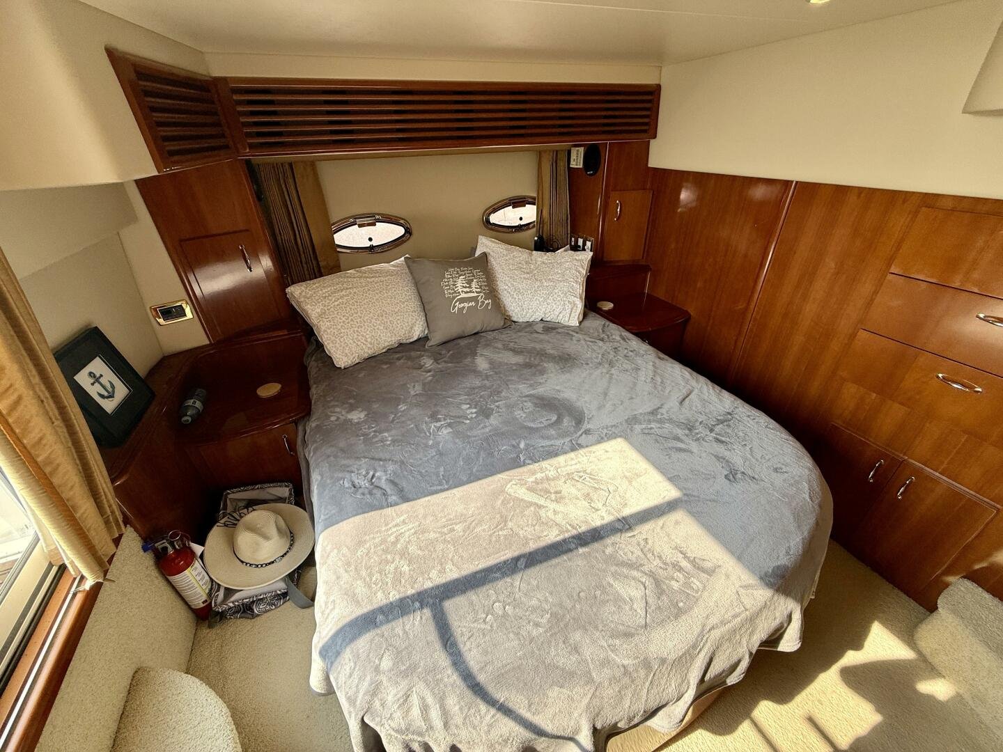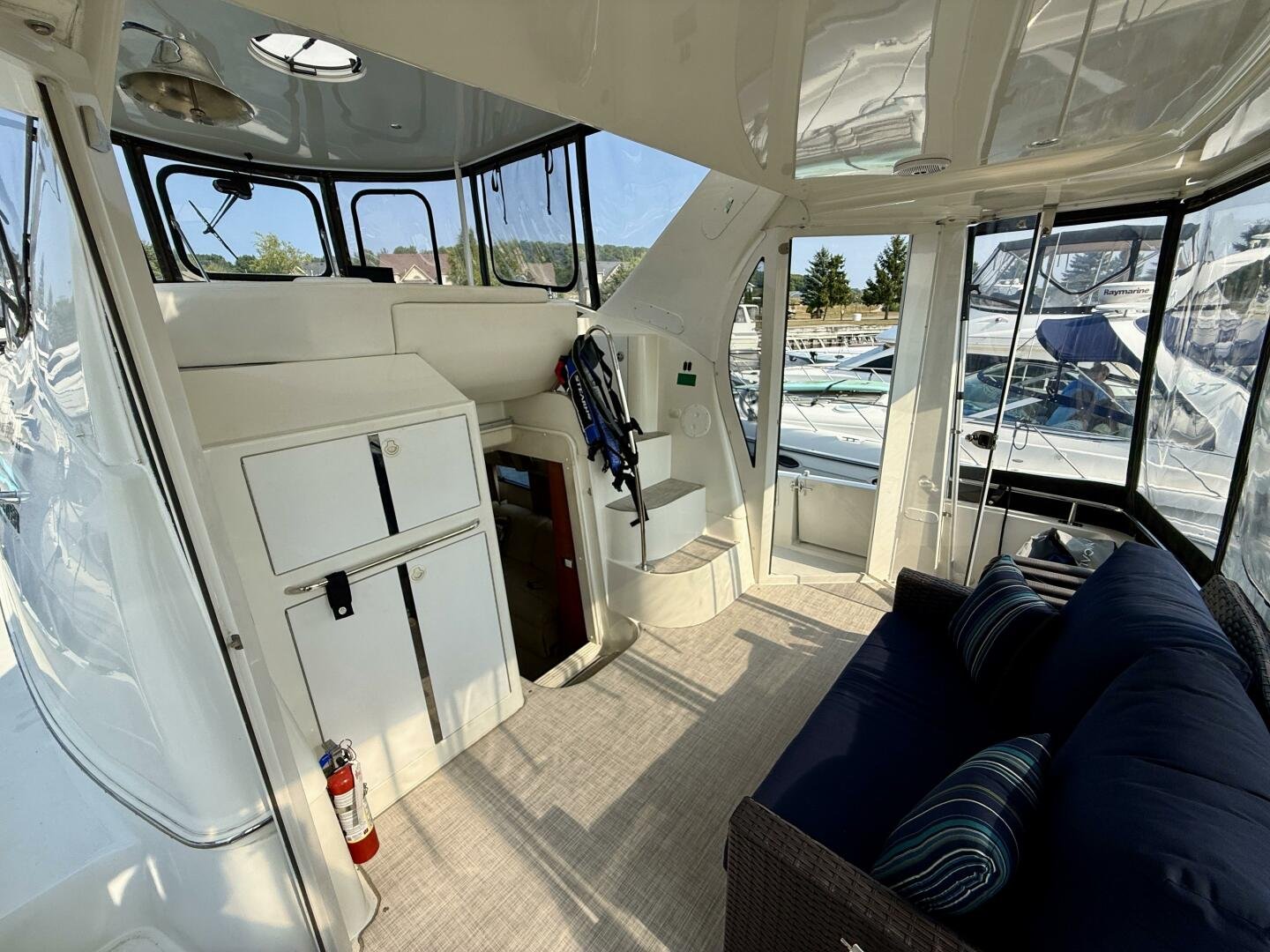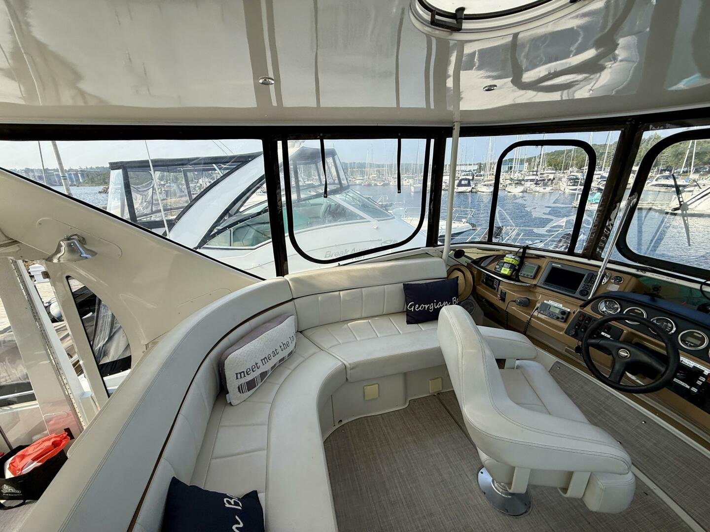 A 2004 Carver 444 CPMY featuring a hardtop and Volvo Penta power. The 444 has a great layout with plenty and makes an excellent floating cottage. The vessel has three different levels for easy boarding for various dock heights. The large platform and cockpit give plenty of outdoor space, with molded steps to bridge and a sliding door entrance to the main cabin. A fully enclosed bridge cockpit, and bridge with a hardtop provide plenty of seating. The salon is expansive with plenty of natural light, the galley and dinette blend in to give you a truly grand feel. Forward is the guest cabin with en-suite head. To aft you have a large stateroom with walk-around queen bed, and en-suite head with separate shower. This boat has been set up for cruising the Great Lakes with dinghy caddy, solar, lithium, and an inverter.