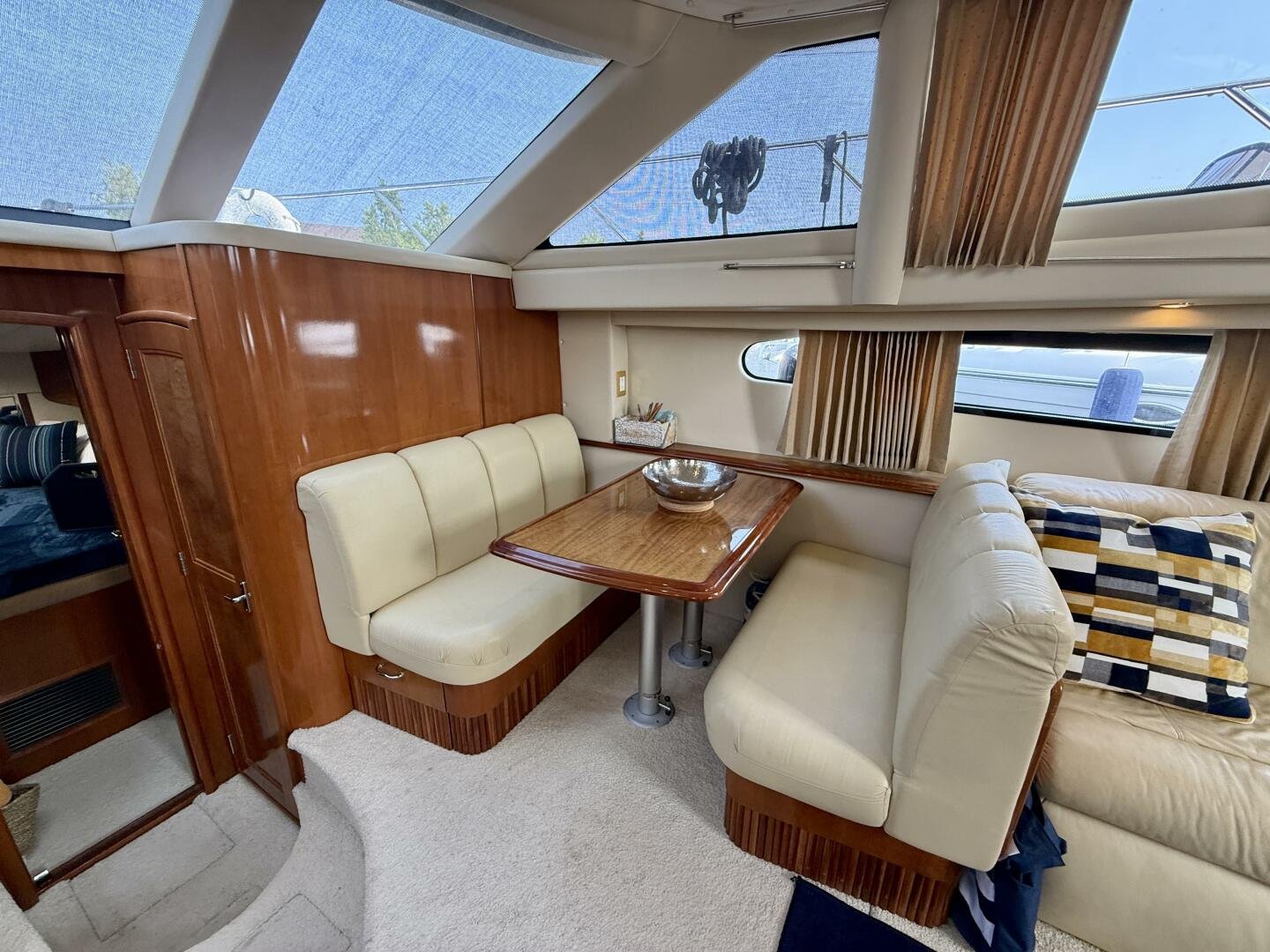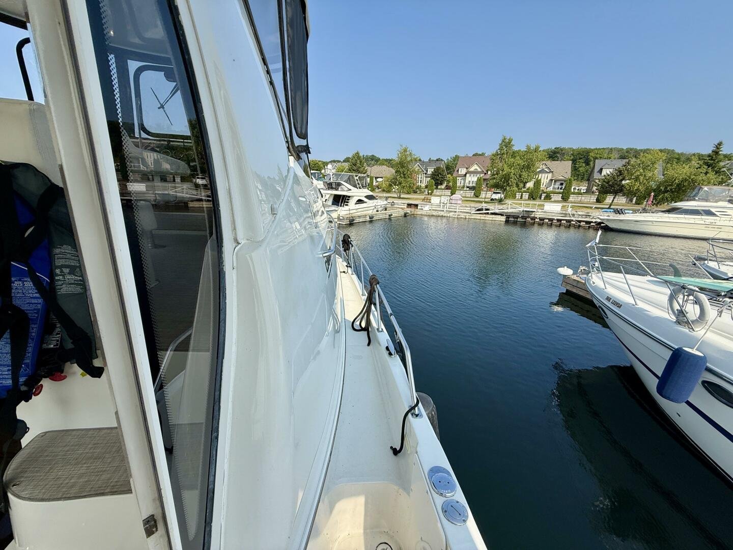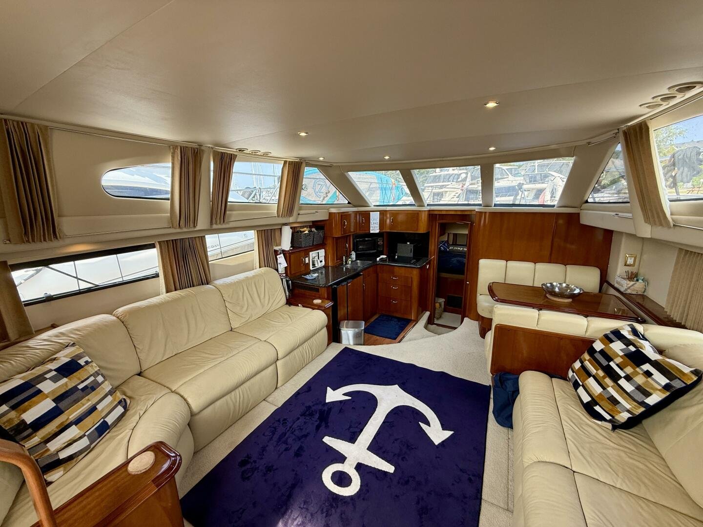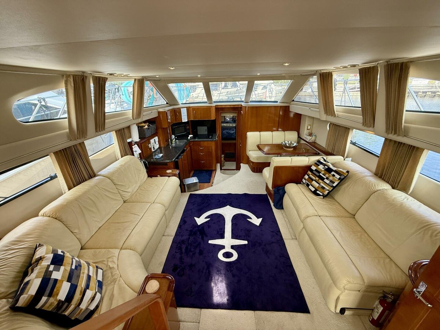 A 2004 Carver 444 CPMY featuring a hardtop and Volvo Penta power. The 444 has a great layout with plenty and makes an excellent floating cottage. The vessel has three different levels for easy boarding for various dock heights. The large platform and cockpit give plenty of outdoor space, with molded steps to bridge and a sliding door entrance to the main cabin. A fully enclosed bridge cockpit, and bridge with a hardtop provide plenty of seating. The salon is expansive with plenty of natural light, the galley and dinette blend in to give you a truly grand feel. Forward is the guest cabin with en-suite head. To aft you have a large stateroom with walk-around queen bed, and en-suite head with separate shower. This boat has been set up for cruising the Great Lakes with dinghy caddy, solar, lithium, and an inverter.