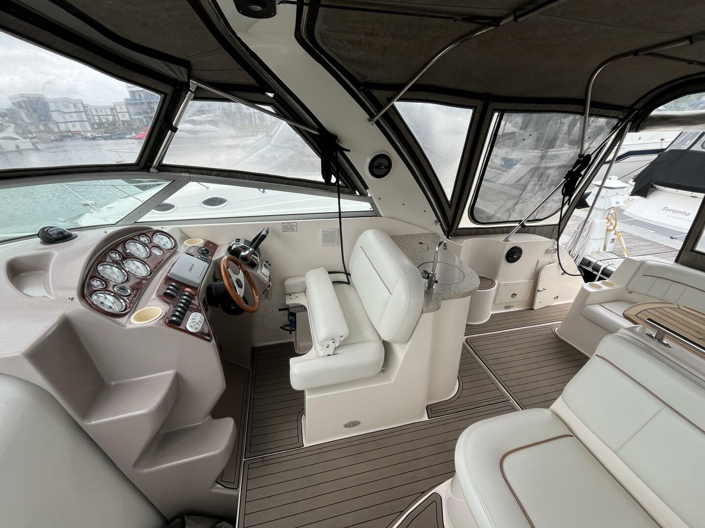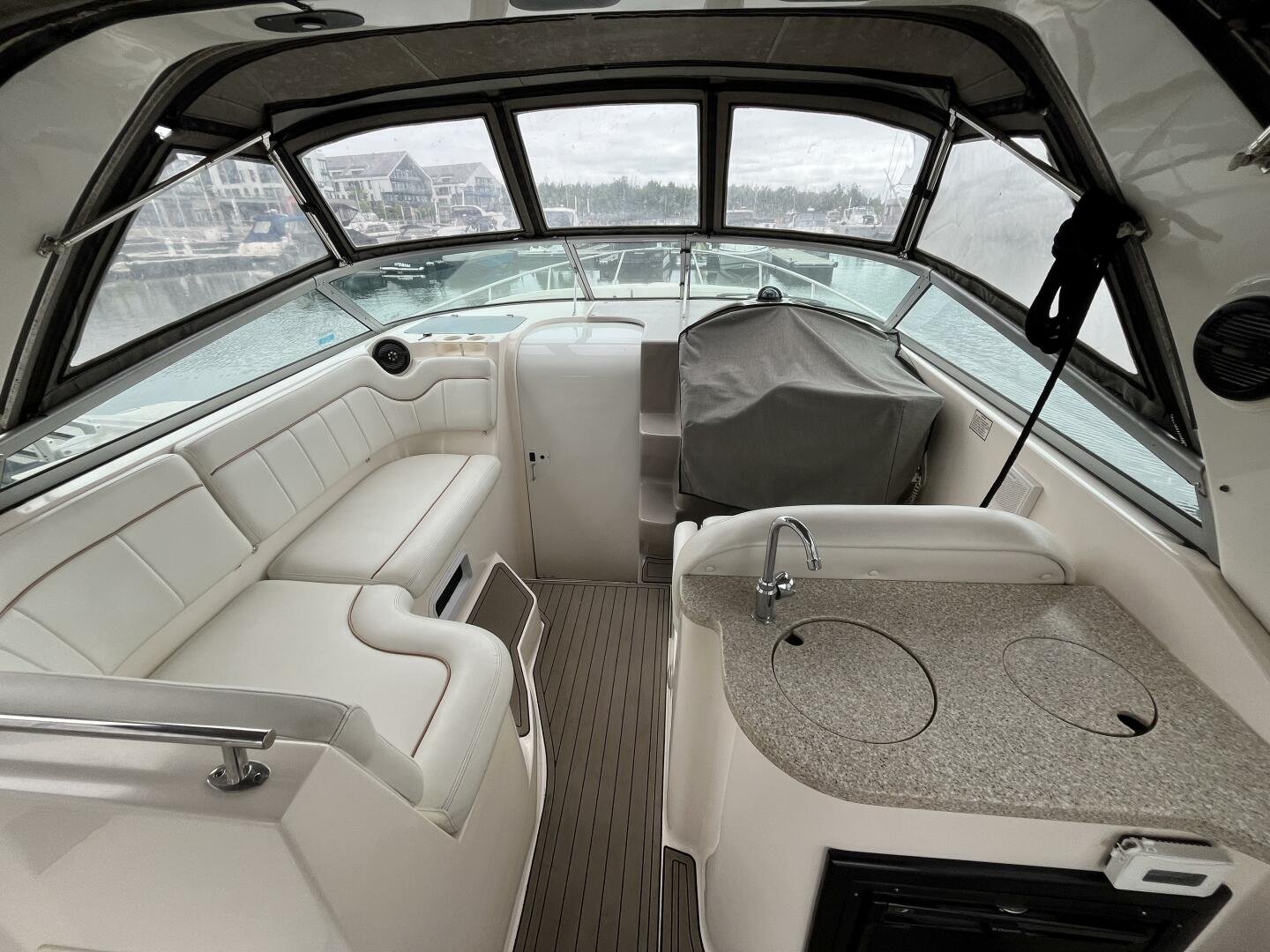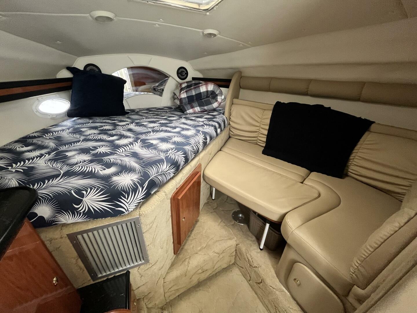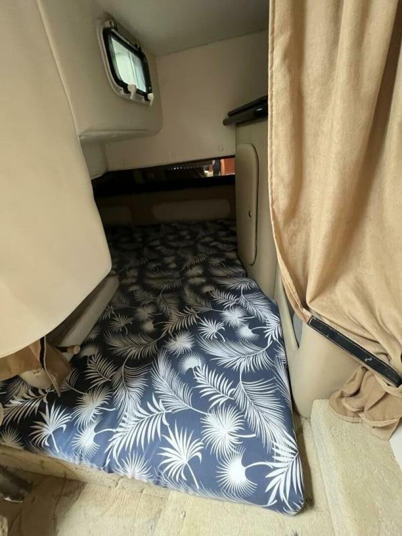 Recent upgrades include a new full camper-back enclosure, updated cockpit upholstery, and custom SeaDek-style decking for comfort and style. The boat’s wide beam offers generous interior space, featuring a full galley, convertible dinette, forward V-berth, aft cabin, and an enclosed head with shower—ideal for weekend getaways or extended stays on the water. A well-equipped helm includes a Garmin GPS/plotter, VHF radio, windlass controls, and a powerful marine sound system.