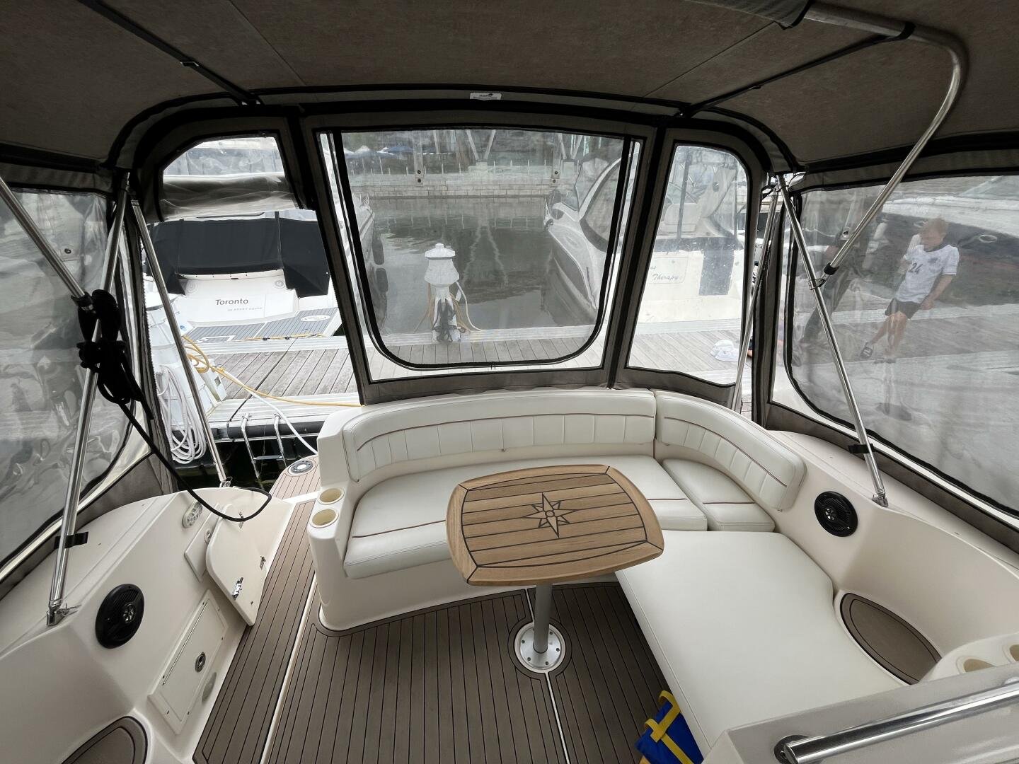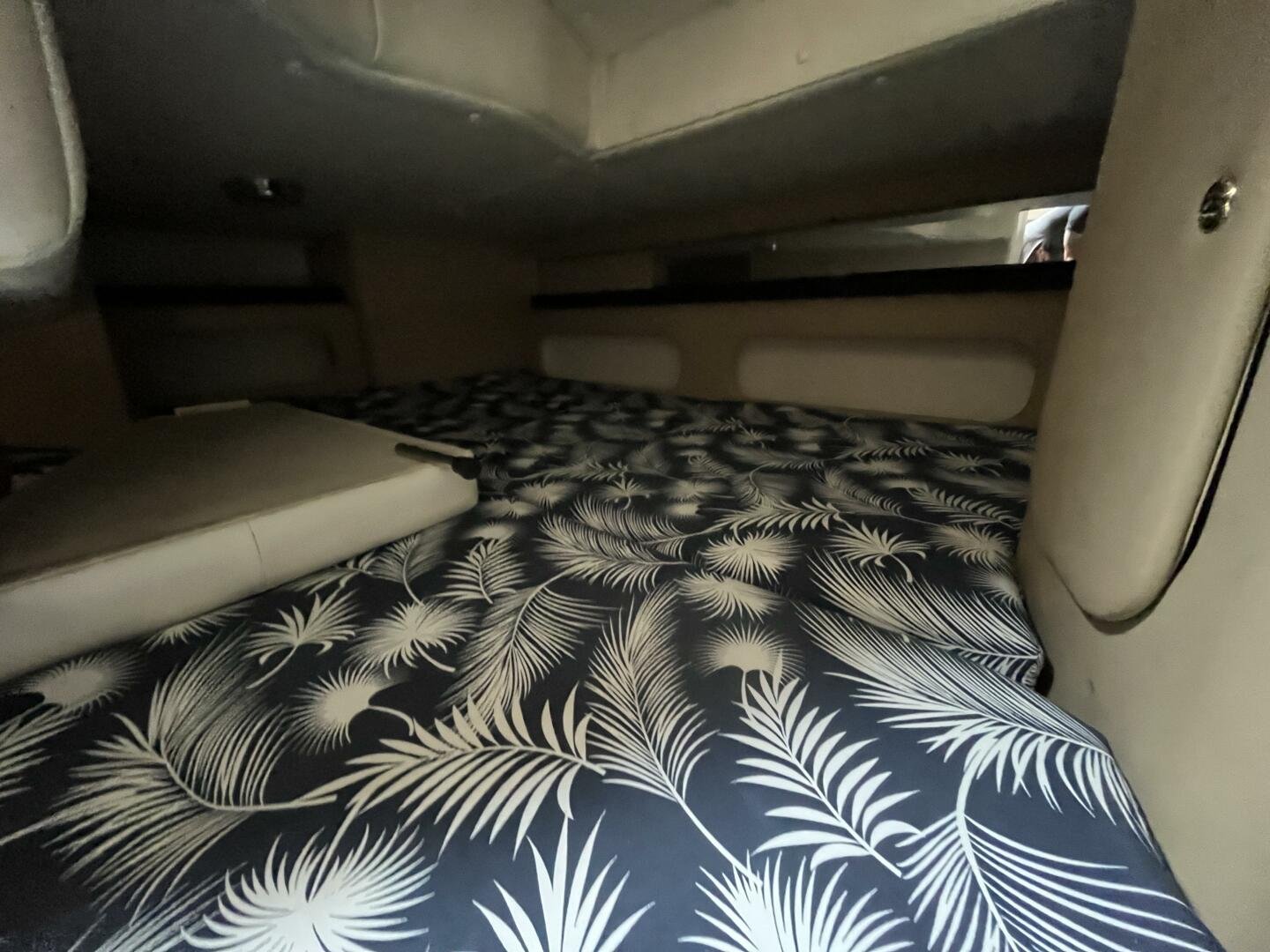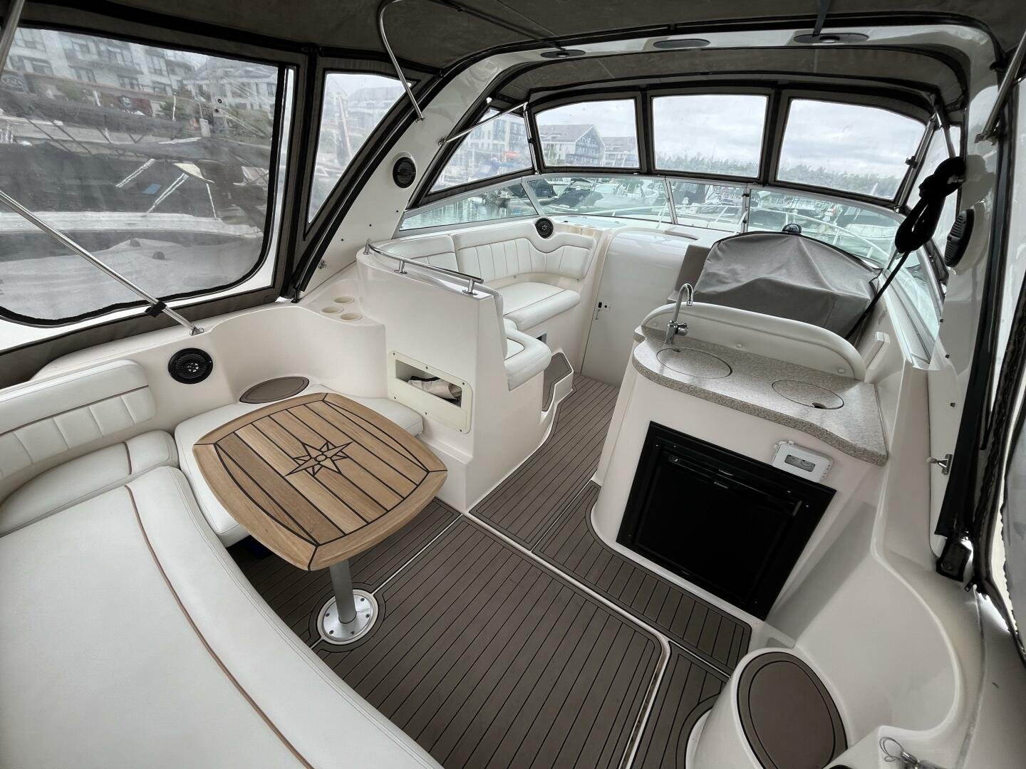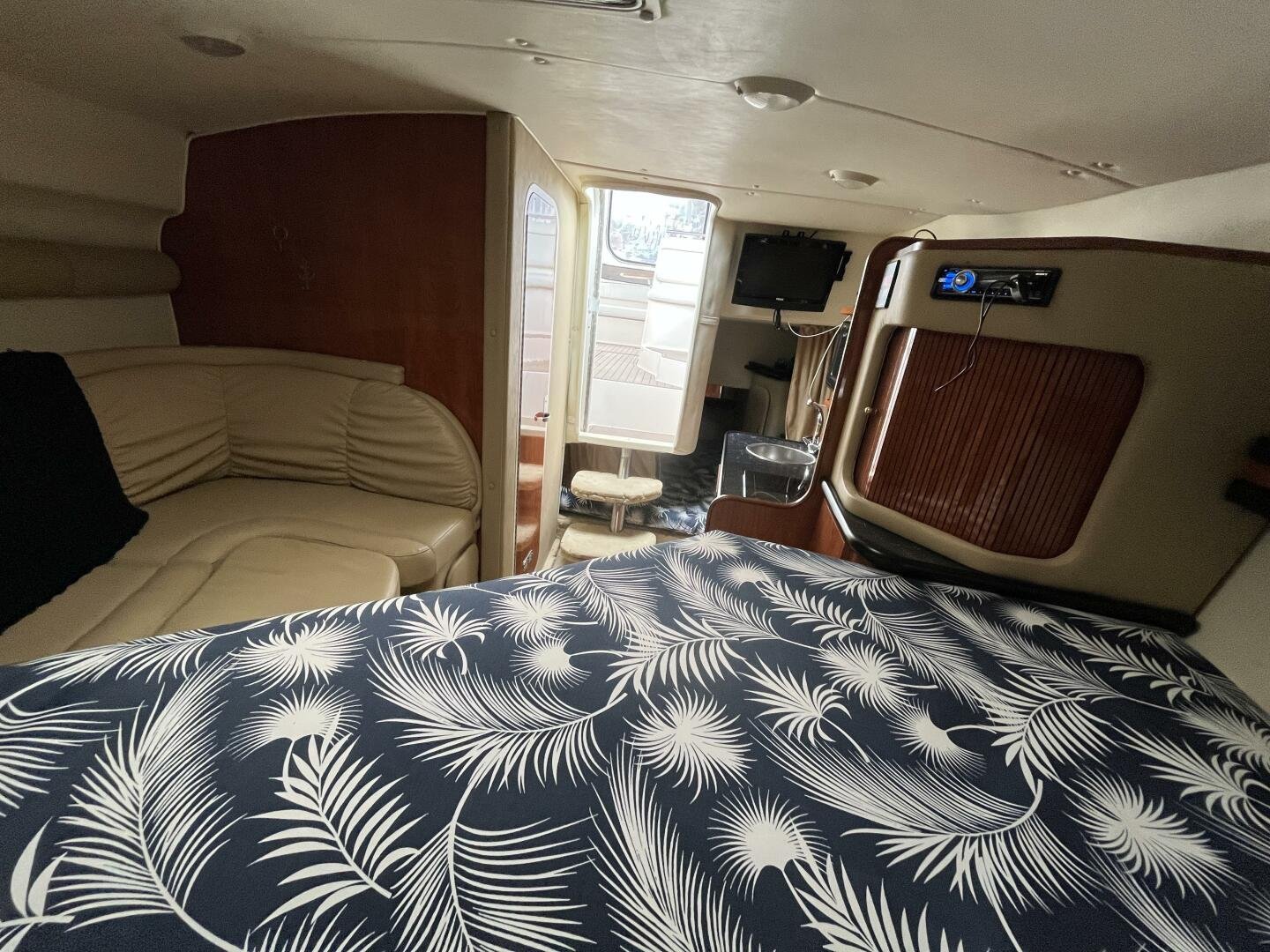 Recent upgrades include a new full camper-back enclosure, updated cockpit upholstery, and custom SeaDek-style decking for comfort and style. The boat’s wide beam offers generous interior space, featuring a full galley, convertible dinette, forward V-berth, aft cabin, and an enclosed head with shower—ideal for weekend getaways or extended stays on the water. A well-equipped helm includes a Garmin GPS/plotter, VHF radio, windlass controls, and a powerful marine sound system.