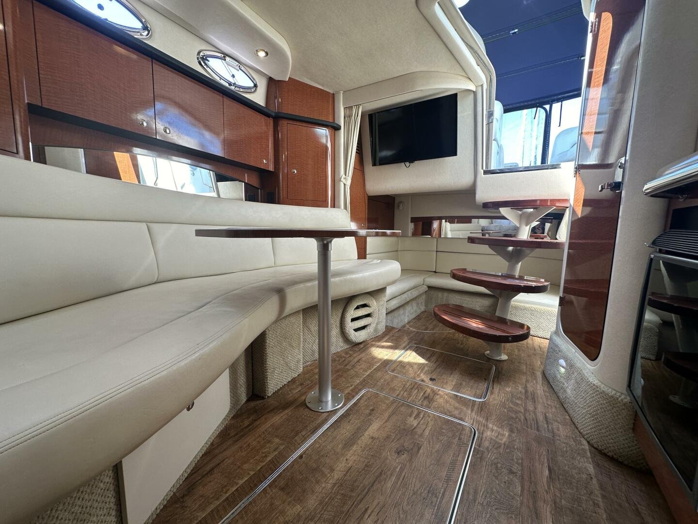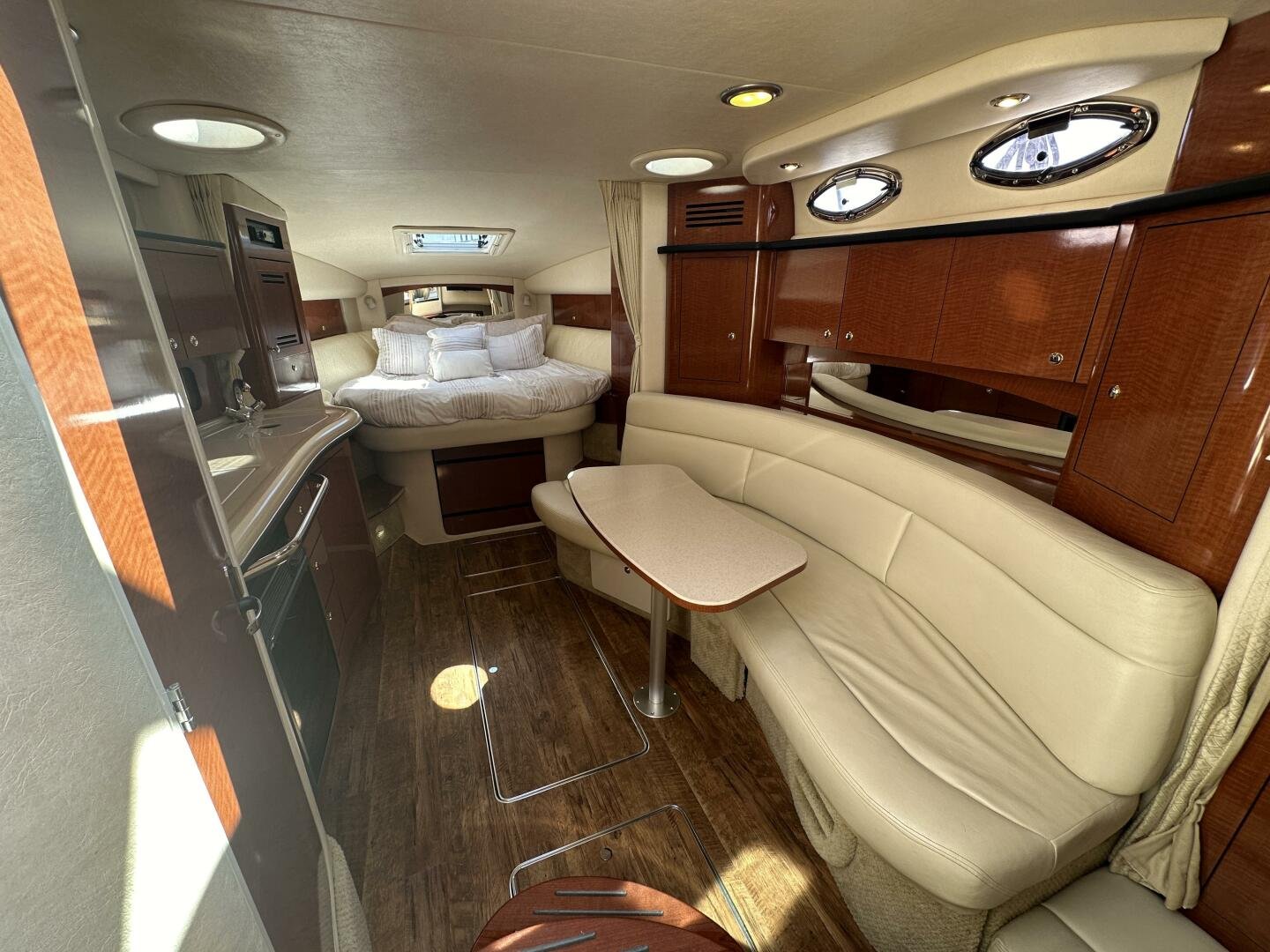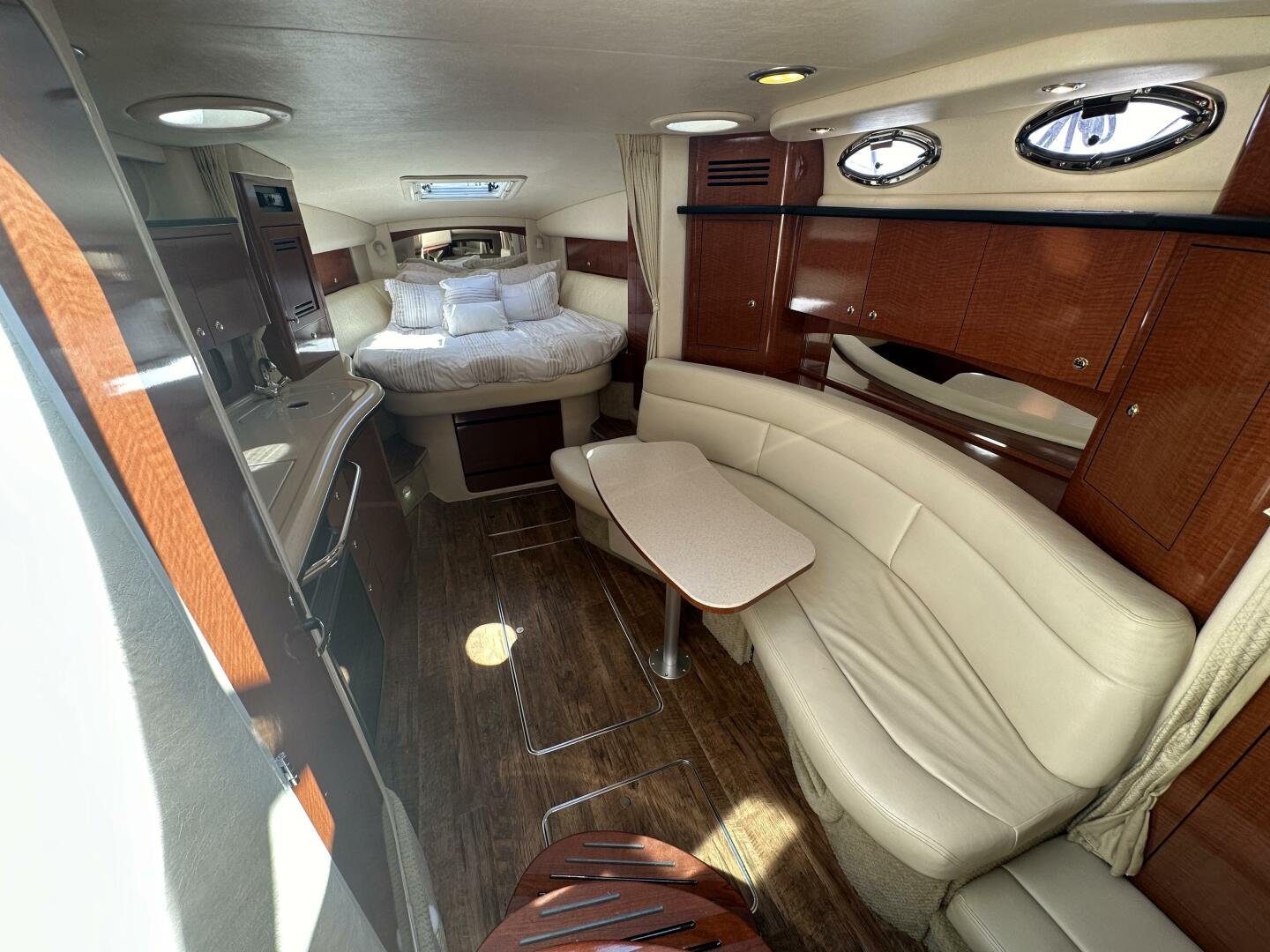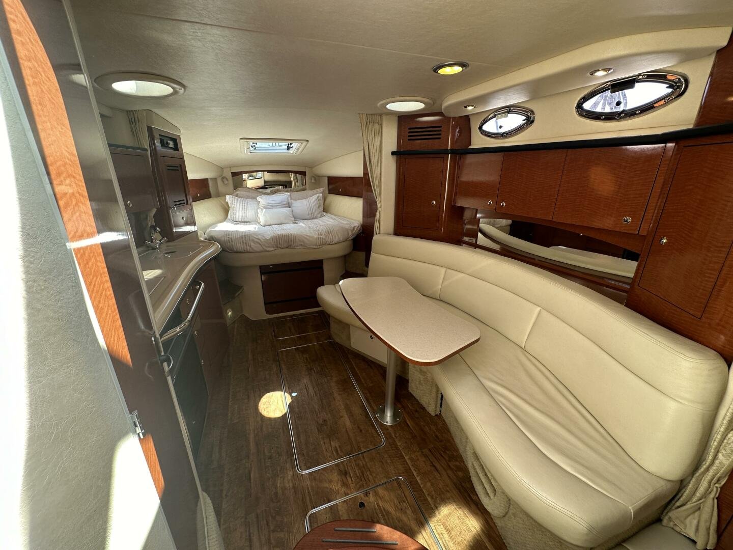 Down below, you have an aft U-shaped lounge that converts into a double berth, a large salon settee w/dinette, a vacuum-flush head with shower, and a fully appointed galley. There are also more speakers down below, clean upholstery, and cabinetry, and clean bilges! The interior finish is high gloss cherry paneling, with no delamination!