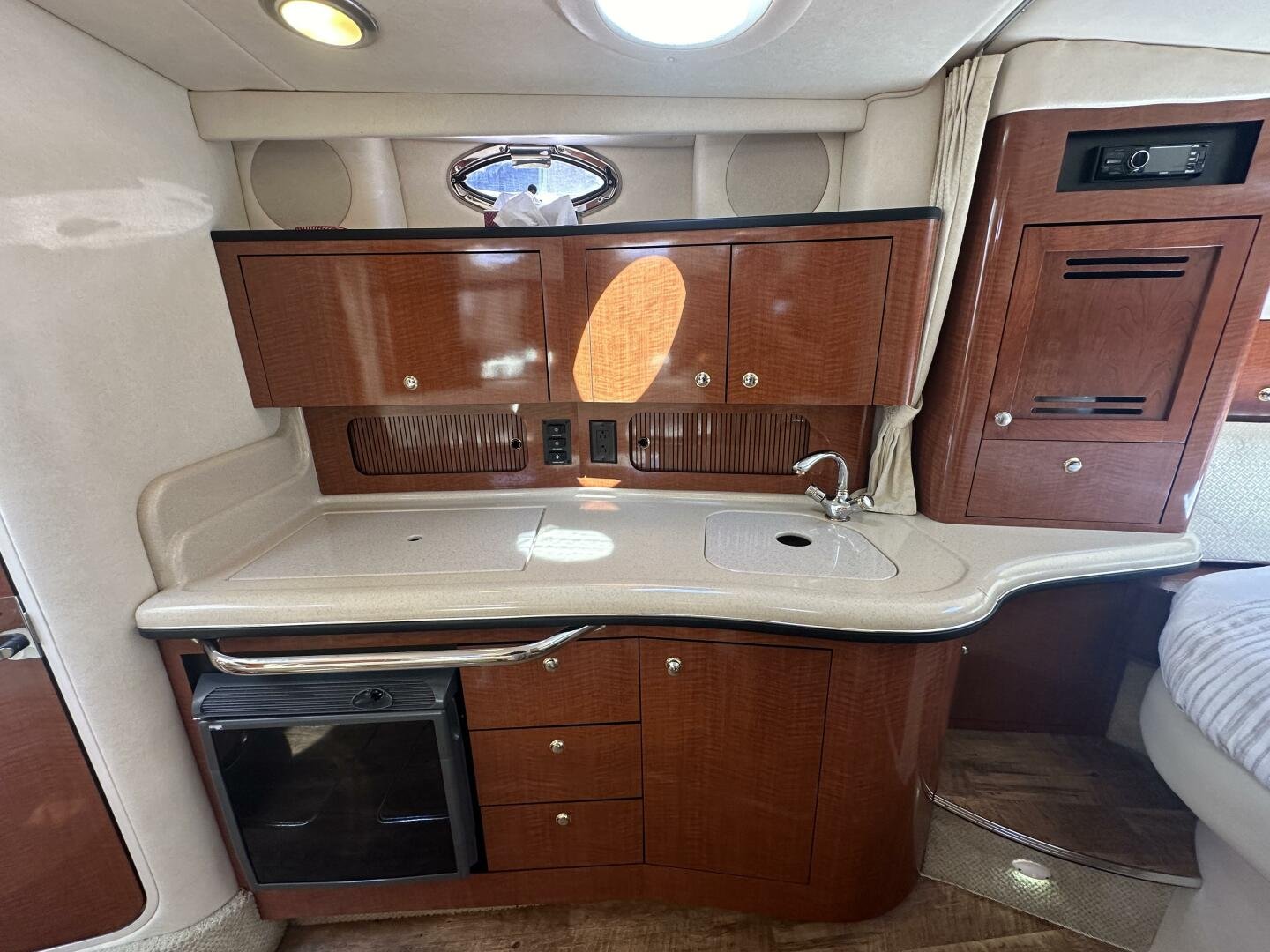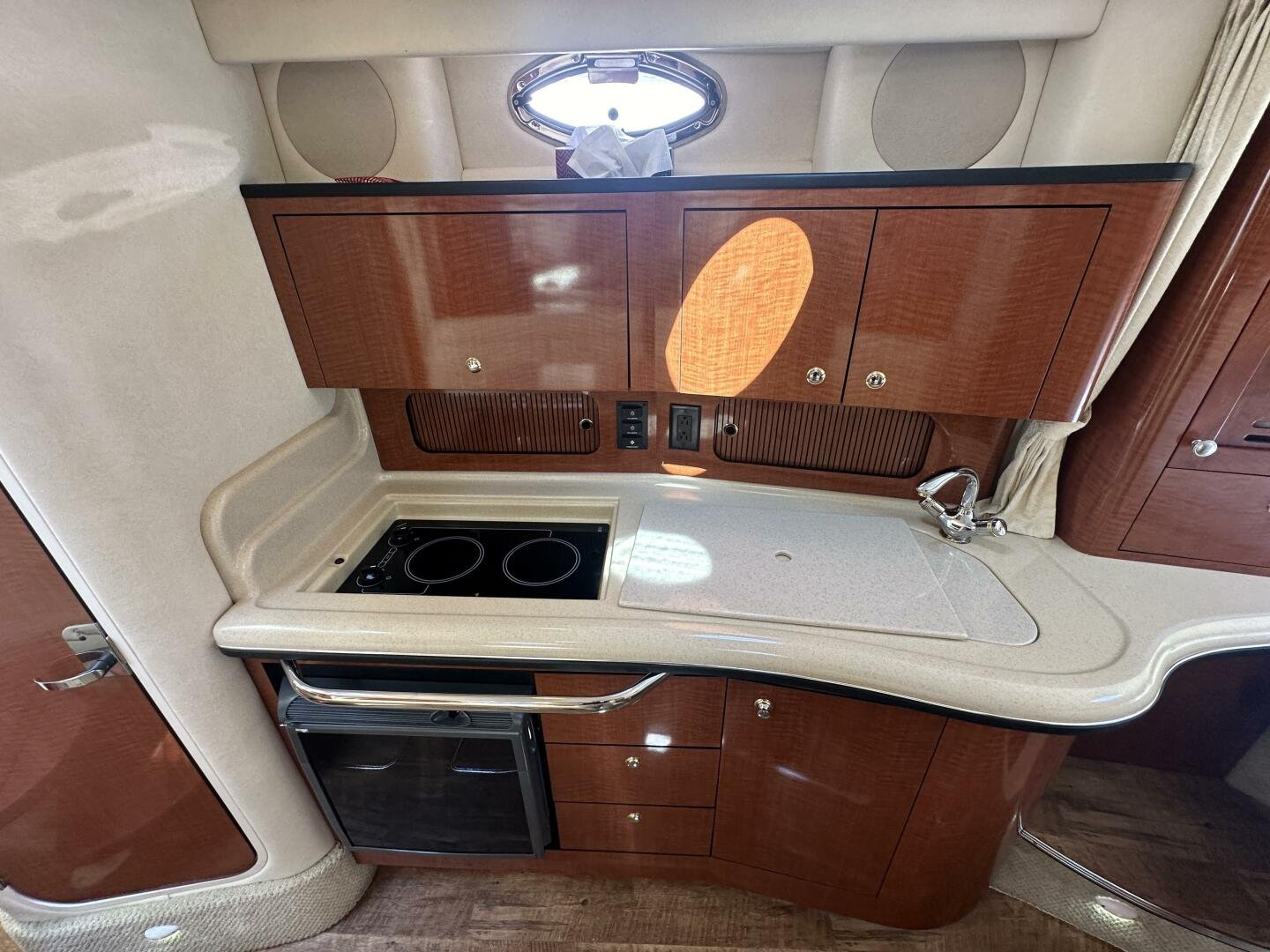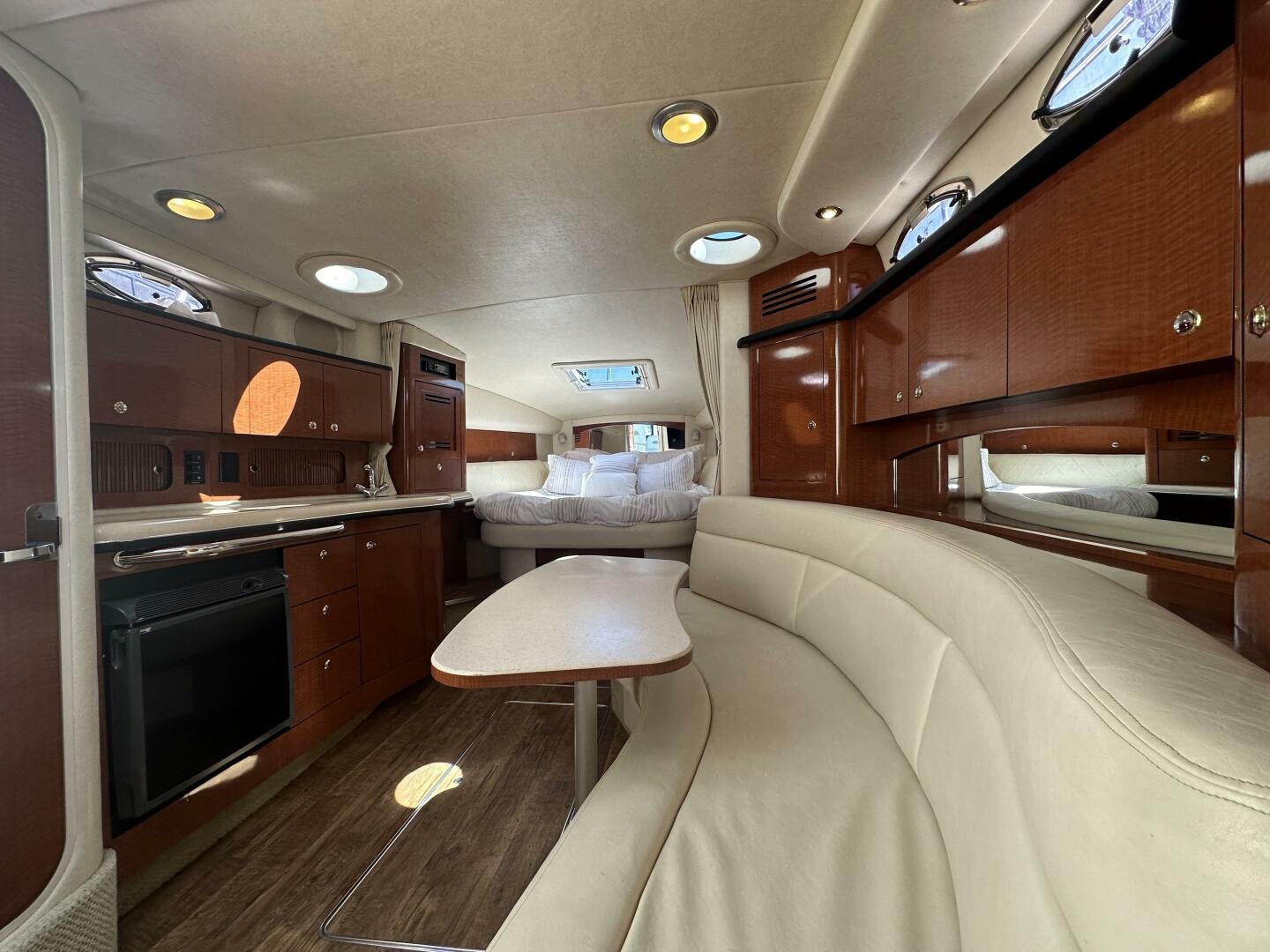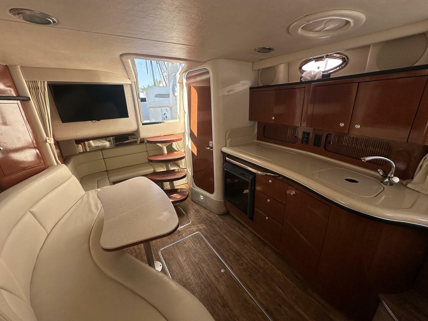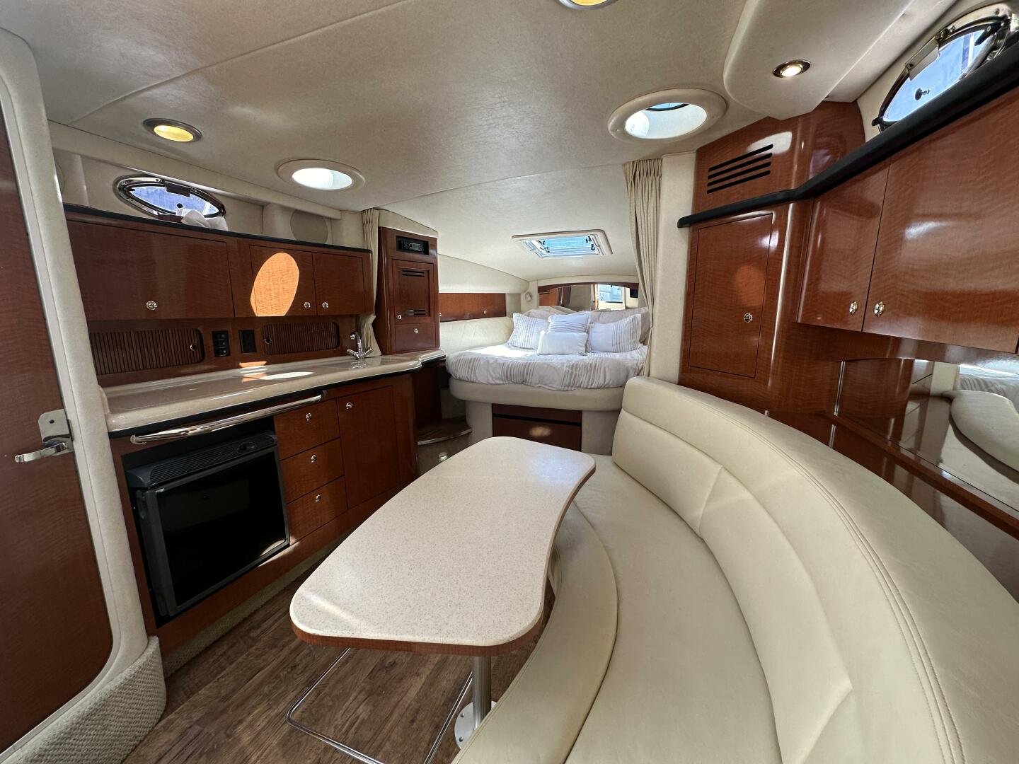 Down below, you have an aft U-shaped lounge that converts into a double berth, a large salon settee w/dinette, a vacuum-flush head with shower, and a fully appointed galley. There are also more speakers down below, clean upholstery, and cabinetry, and clean bilges! The interior finish is high gloss cherry paneling, with no delamination!