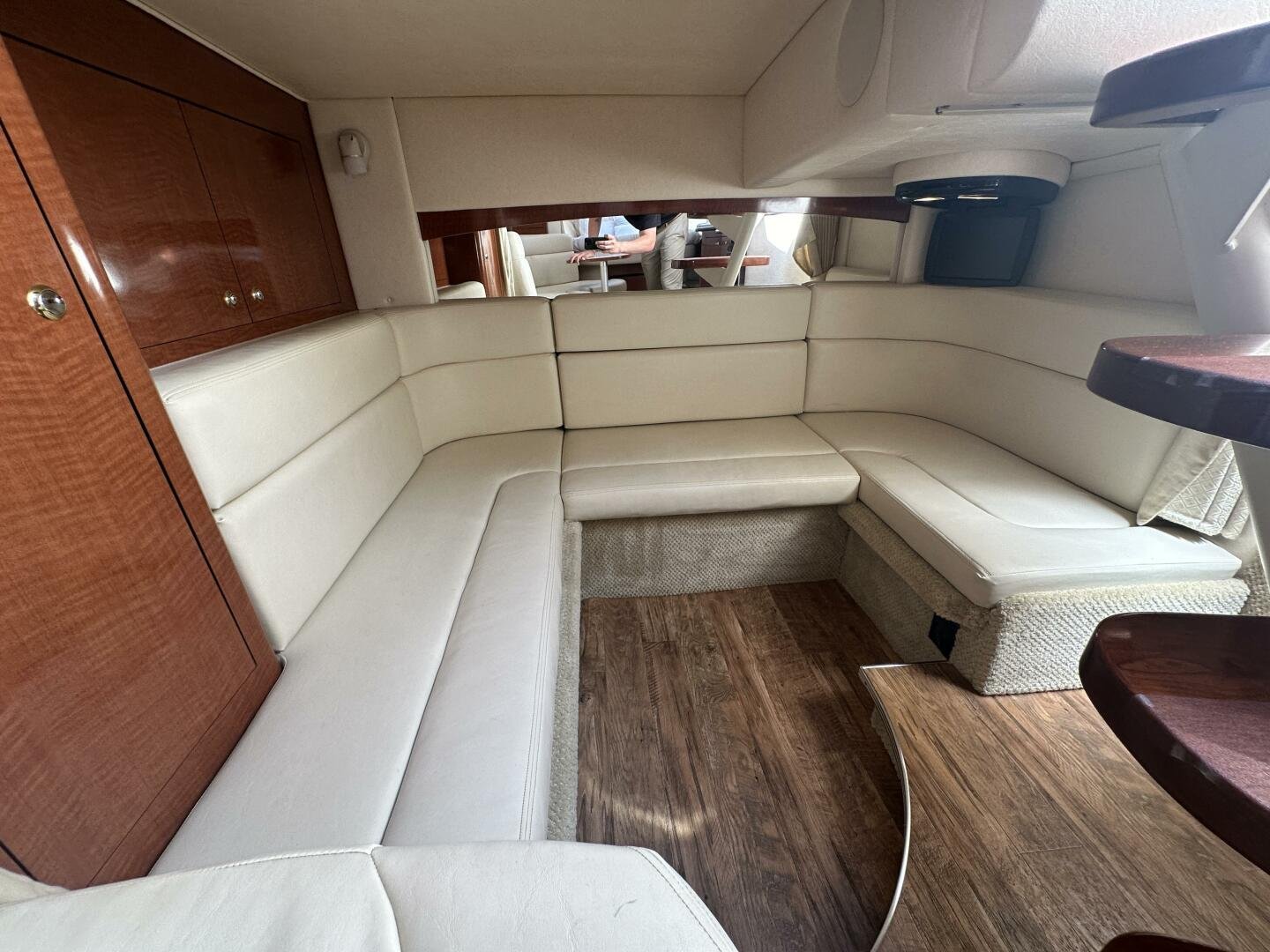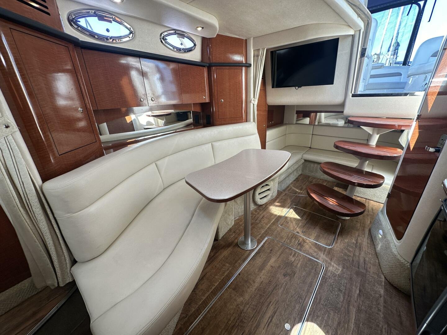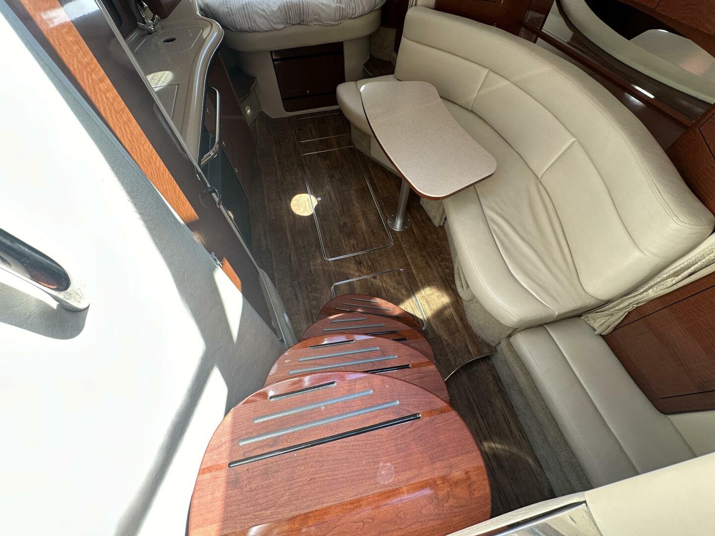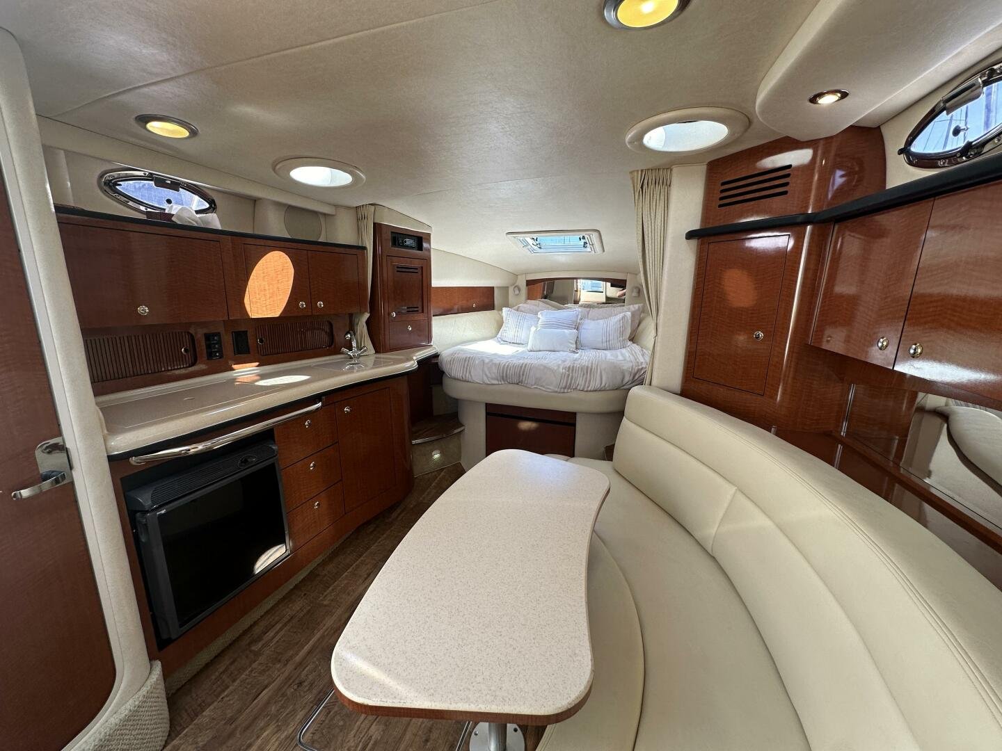 Down below, you have an aft U-shaped lounge that converts into a double berth, a large salon settee w/dinette, a vacuum-flush head with shower, and a fully appointed galley. There are also more speakers down below, clean upholstery, and cabinetry, and clean bilges! The interior finish is high gloss cherry paneling, with no delamination!